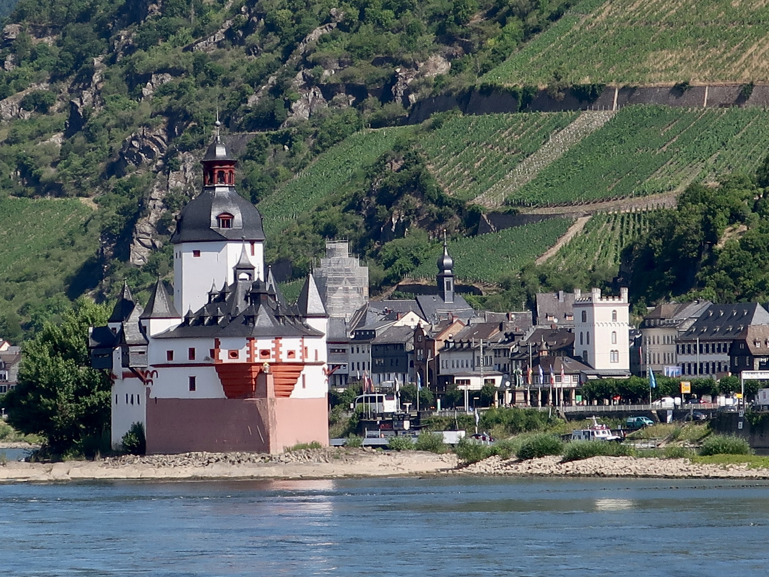 A side view. Unlike the majority of castles along the Rhine, Pfalz was never conquered or destroyed. Gutenfels Castle, not included on my post today, can be seen in the upper left.