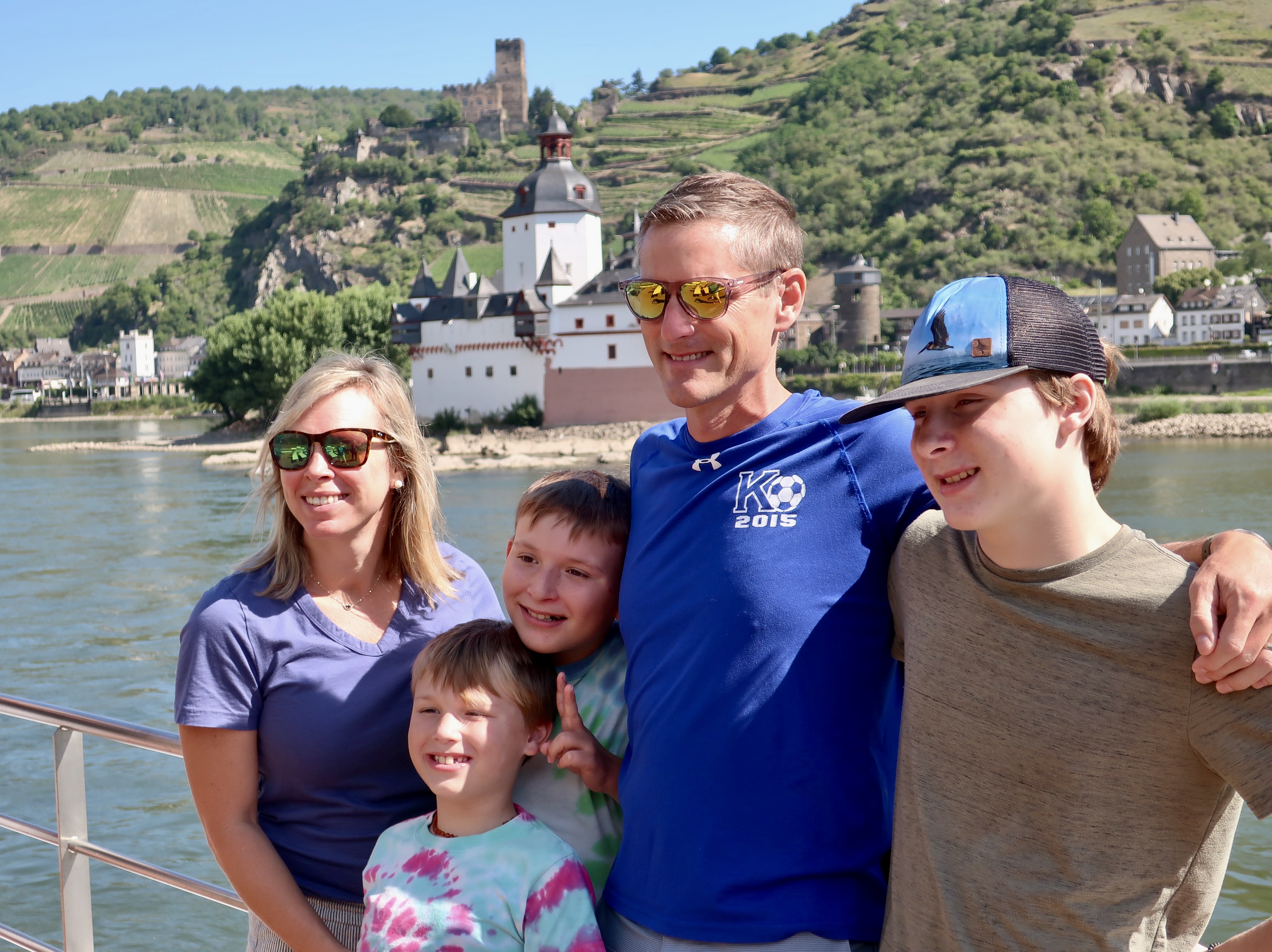 Our son Tony, his wife Cammie and their three sons Cooper, Chris and Connor (left to right) with Pfalz Castle in the back ground.