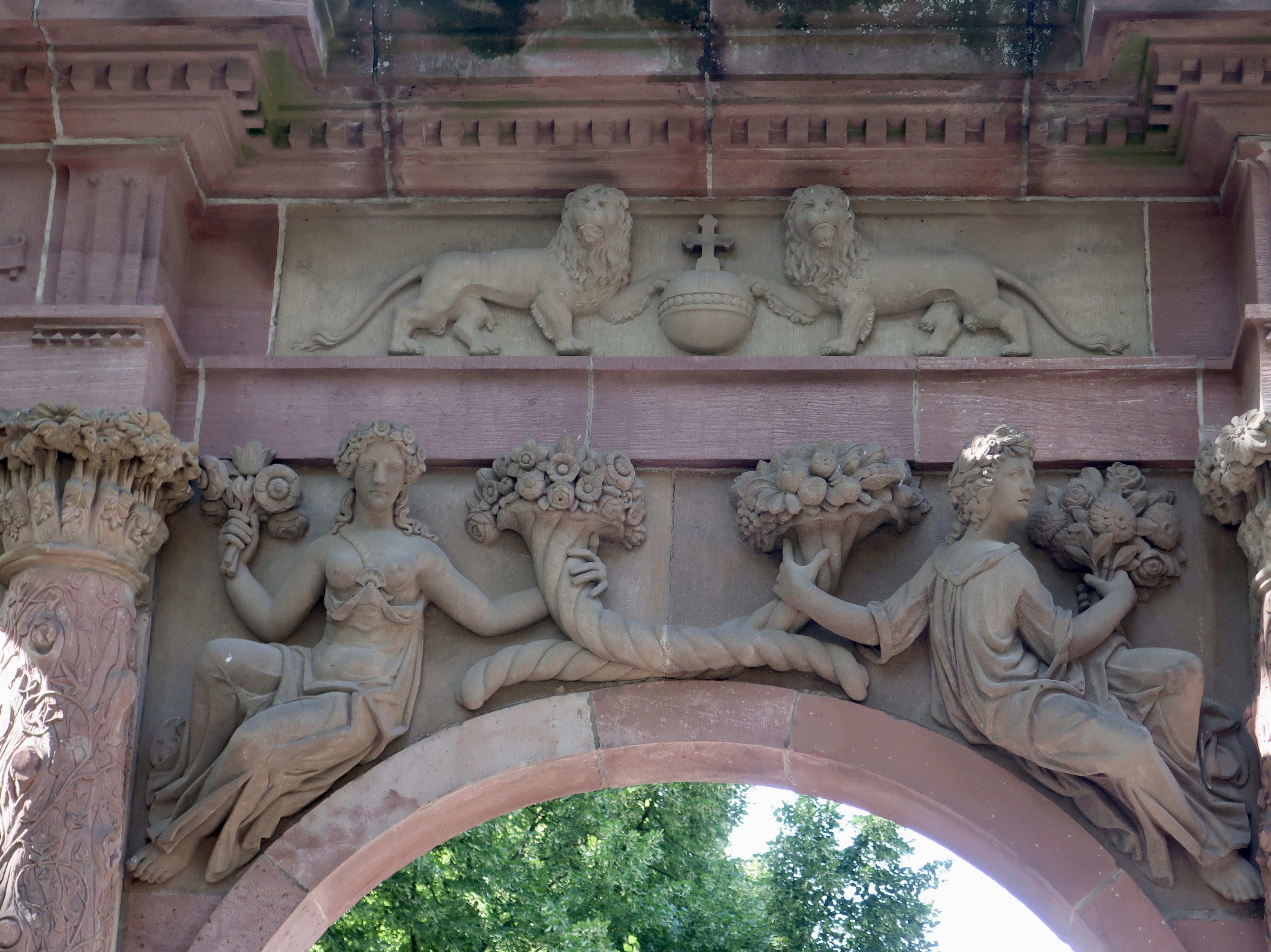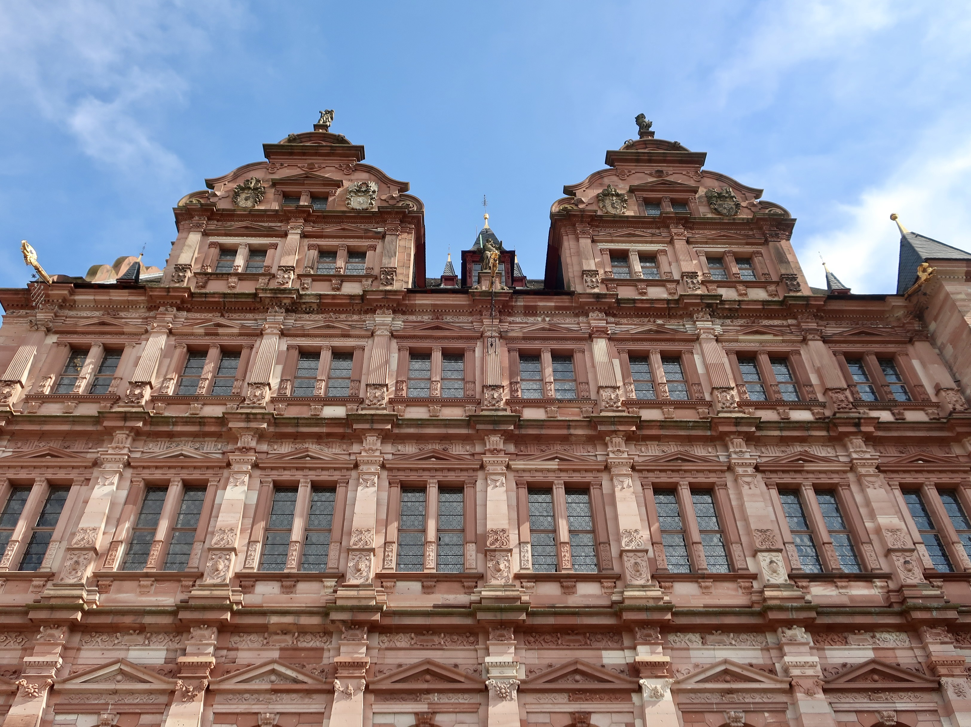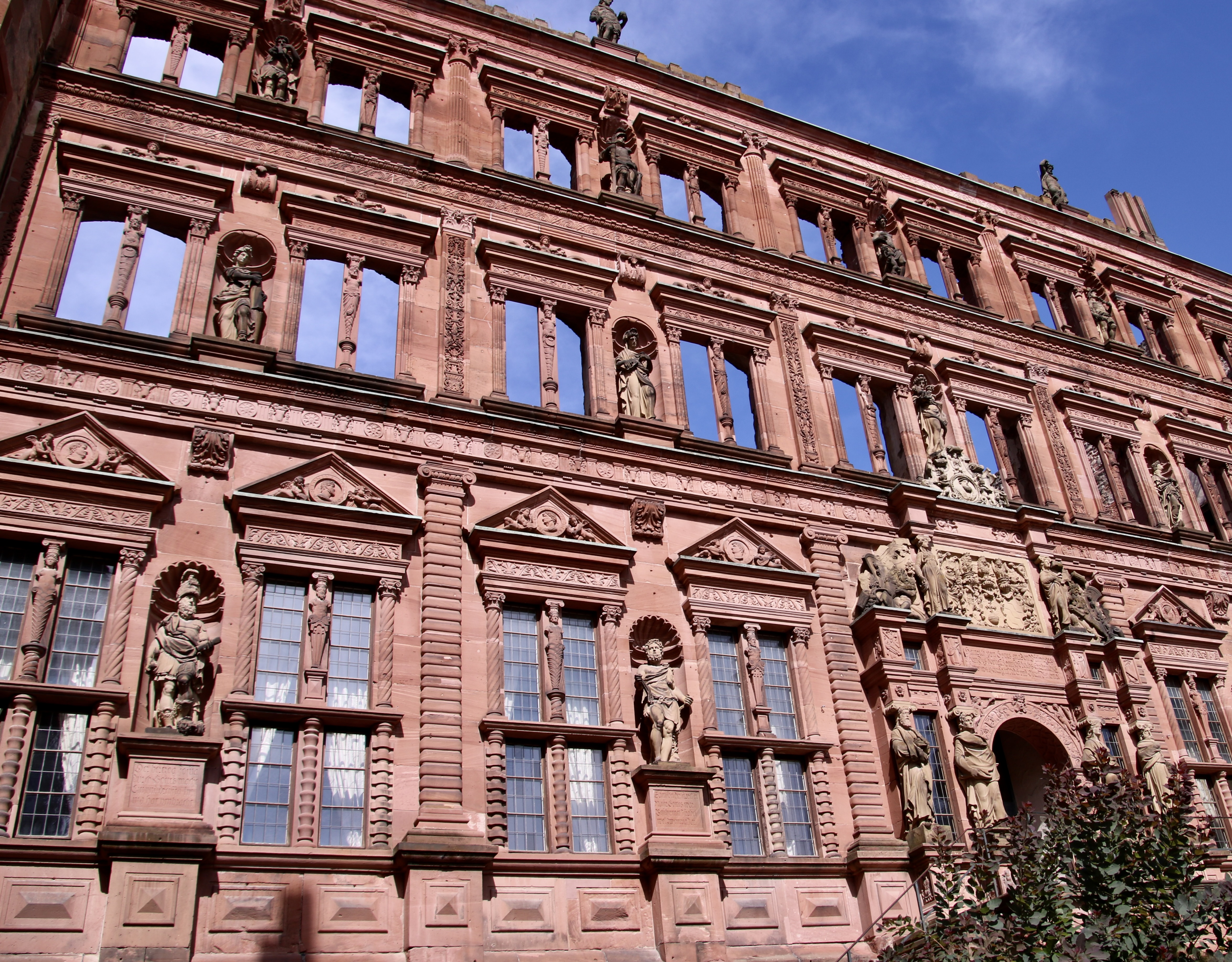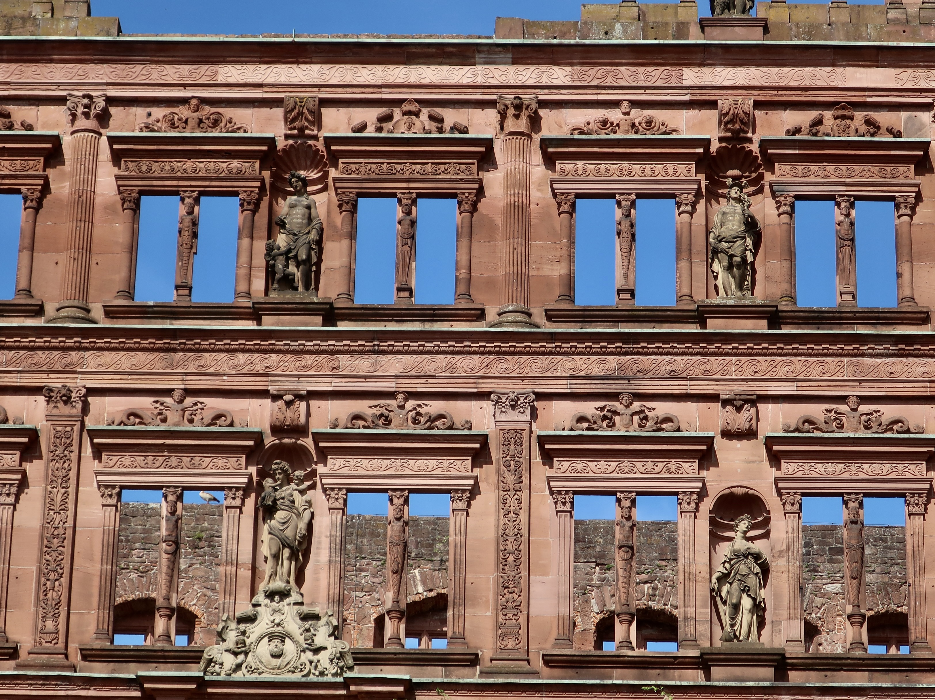 This impressive building known as the Friedrichsbau, is named after Elector Friedrich IV who had it built in the early 1600s. Lady Justice is perched in a niche top center. Other niches contain generations of Palatine Prince Electors.
