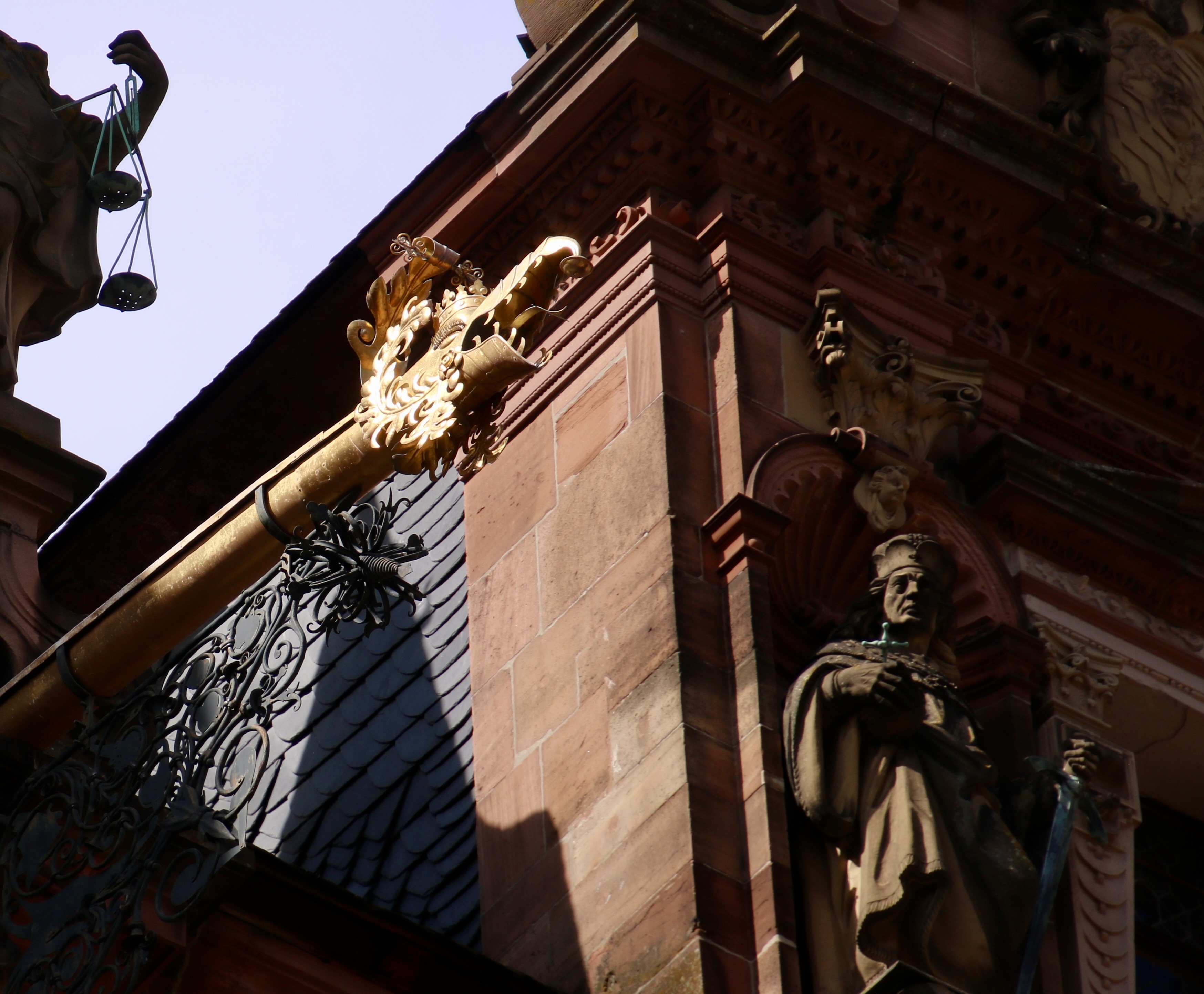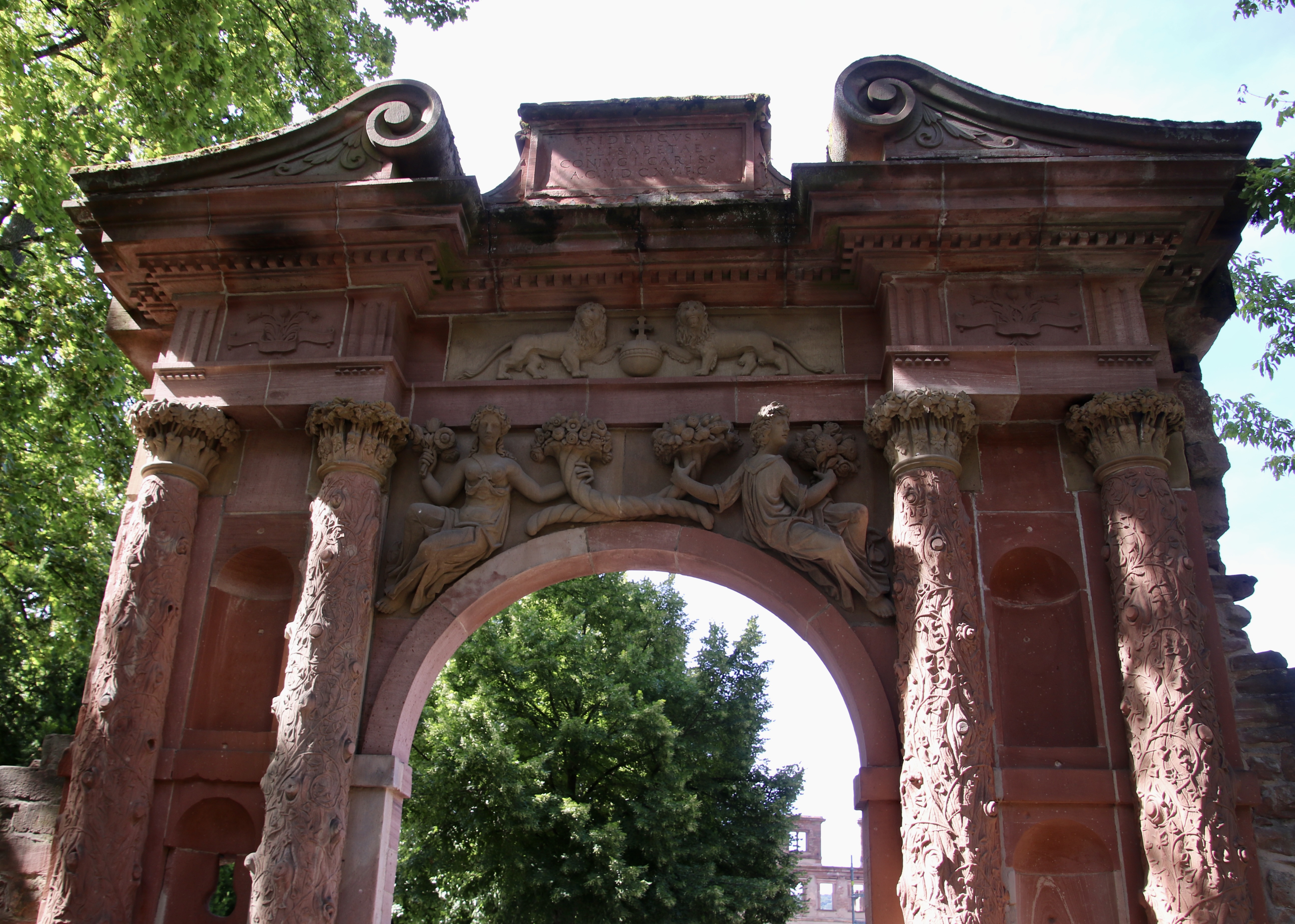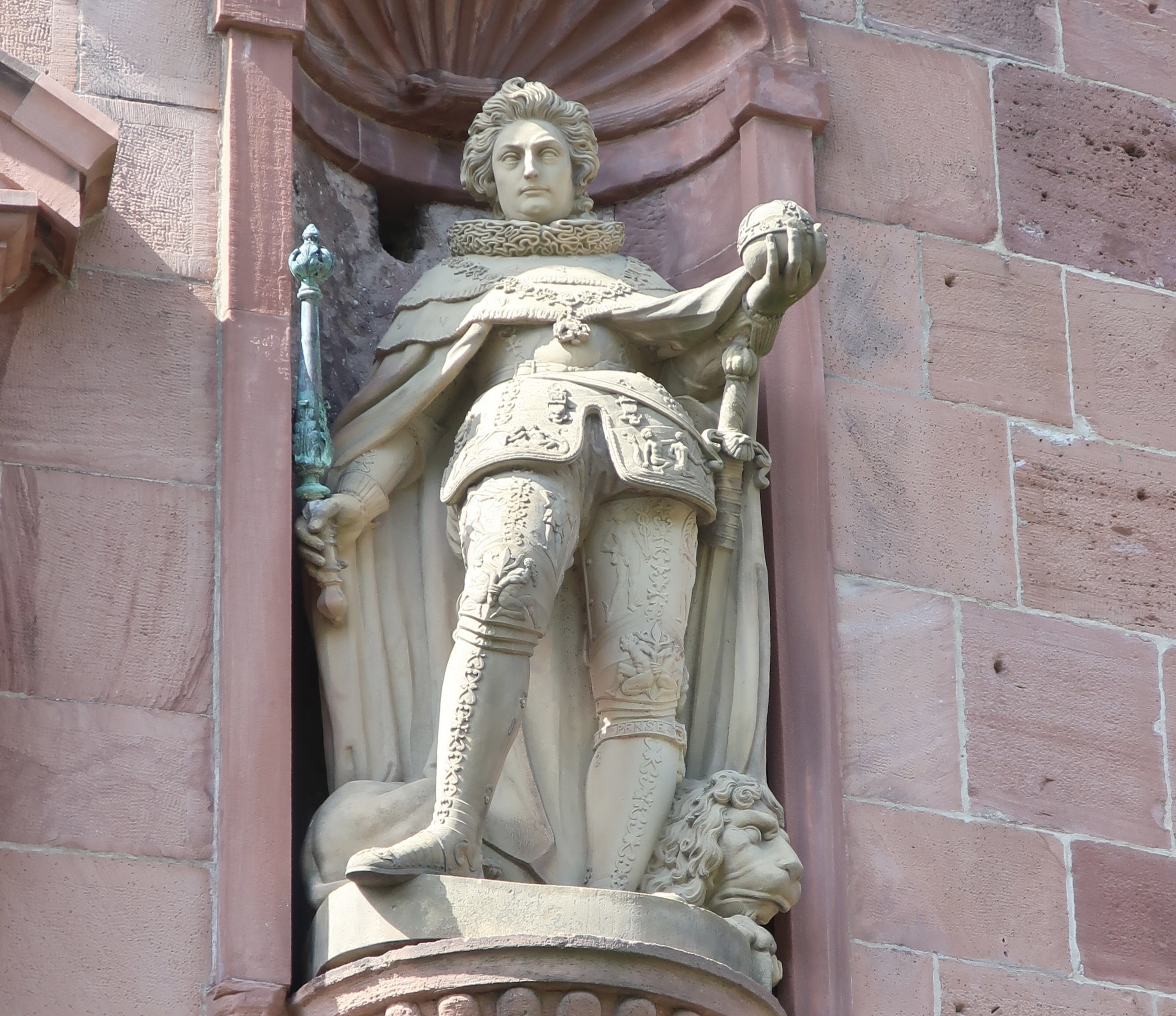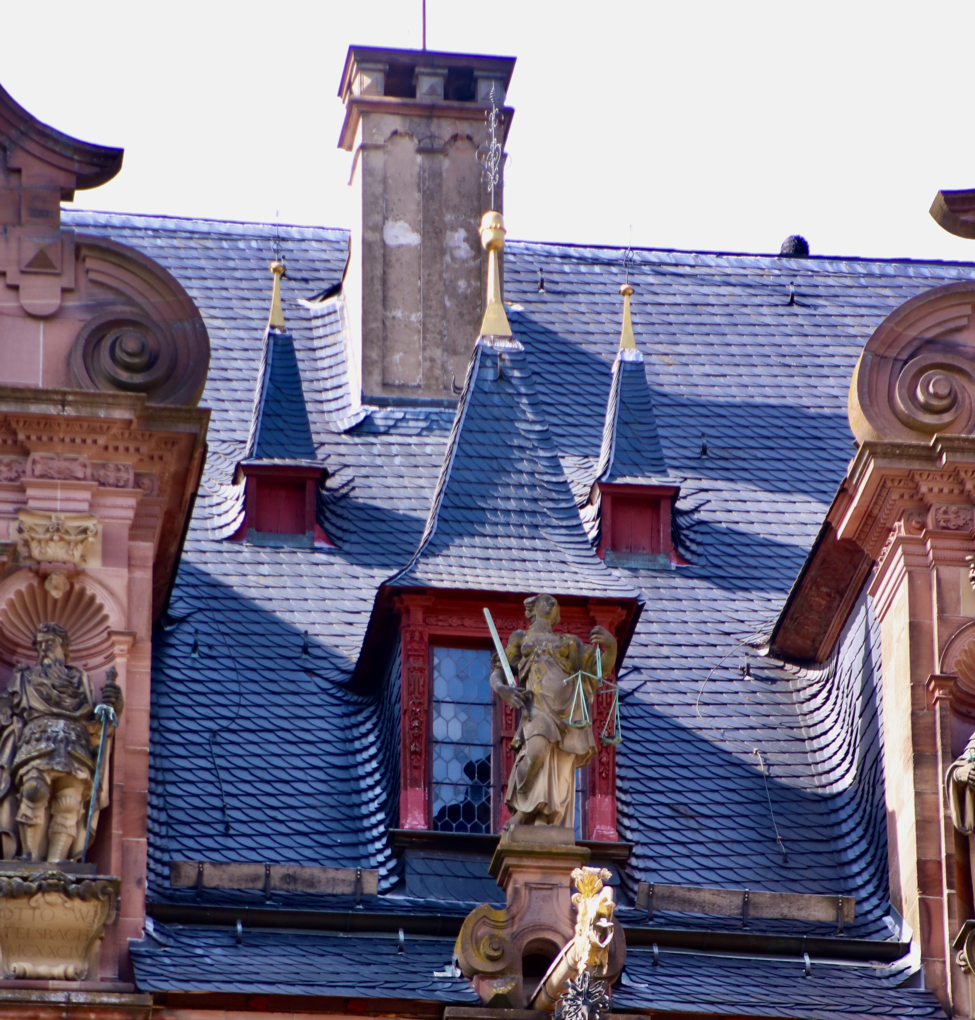 This impressive building known as the Friedrichsbau, is named after Elector Friedrich IV who had it built in the early 1600s. Lady Justice is perched in a niche top center. Other niches contain generations of Palatine Prince Electors.