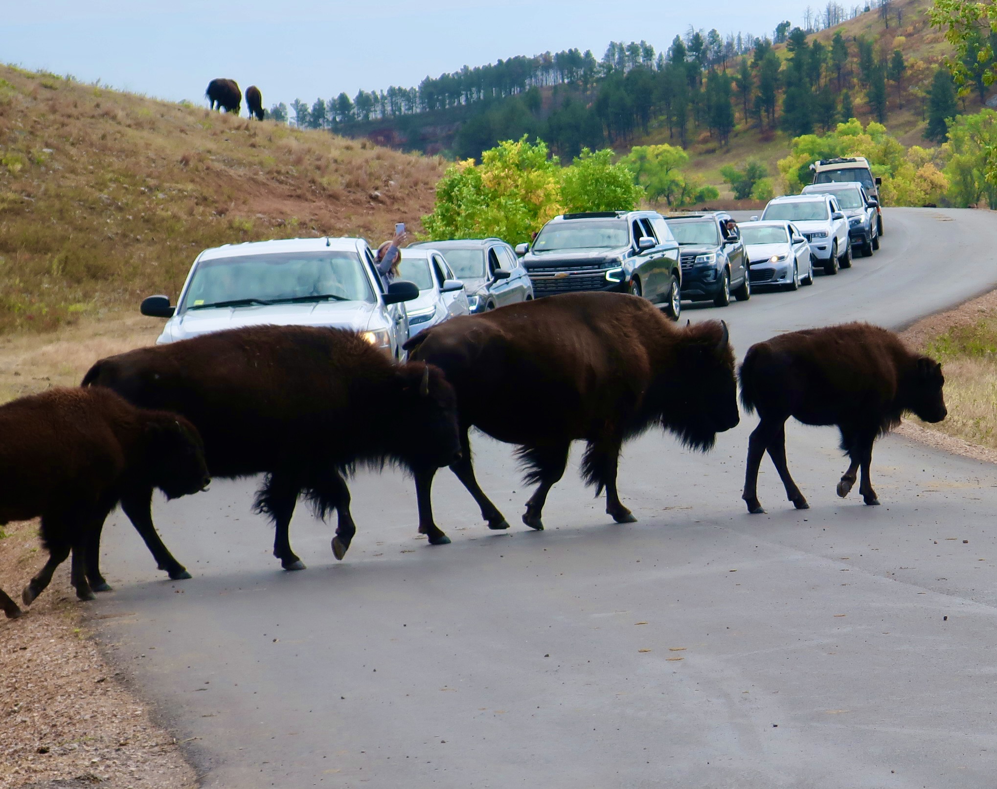 Photo of family of buffalo blocking traffic in Custer St. Park SD by photographer Curt Mekemson.