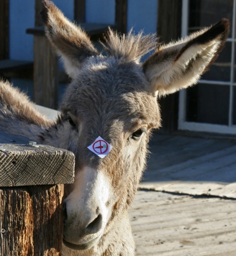 Donkeys are known to love carrots, but apparently, young donkeys can choke on them.This cute youngster that Peggy and I found in Oatman, Arizona, had a “no carrot” sticker in its nose, much to its disgust.