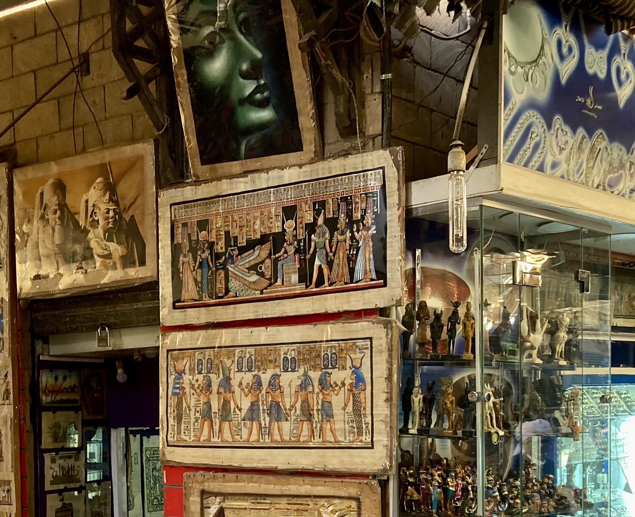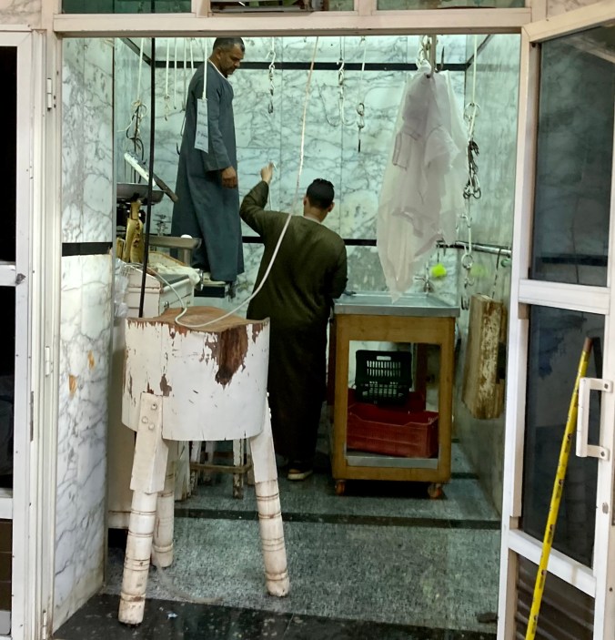 We started our visit to the market with a stop at an exotic spice market…Where they served us Jasmine tea and bread…Along with a selection of their spices to sample. Out in the market place, spices were being sold in a less formal (and less expensive) form. The dark spices on top are Jasmine buds. Want spicy hot? The small red peppers up front will provide it!Not so hot, but good. I’m a big fan of yams. Yum. Peggy isn’t.Since the market is only a couple of blocks away from where riverboats are docked, tourist items featuring Ancient Egyptian themes could be expected.But there were also more African based themes such as these masks. Aswan marks the beginning of Nubia, much of which was drowned out by the Aswan Dam and Lake Nasser. African sculptures were available as well. They remind me of what peddlers would bring by my house when I was a Peace Corp Volunteer in Liberia, West Africa. The Bush Devil that I brought home with me from West Africa and featured on the front cover of my book is an example. If you are missing me over the next two months (grin), you can download my book and read it. The book will take you from the craziness of UC Berkeley and the student revolution of the 60s to the jungles of West Africa. Just Google “The Bush Devil Ate Sam” and various sources will be listed.Most of the items were to meet the needs of the local population, however. Like these chicken cages, for example. Looks like a serious sewing machine to me. Does your sole need to be saved?Or do you need a new robe? Had this man not been standing while being fitted for a robe, I would have thought we were looking at a butcher market complete with a butcher block. Maybe it had been repurposed… Women in Aswan are likely to be dressed in the traditional Muslem garb featured for sale here. Third from the left represents the most conservative.But we also found a pair of teenage girls strolling through the market on the Nile who were a reminder of the ubiquitous nature of modern culture, right down to cell phones.