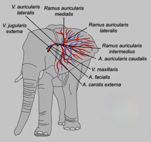 One look at this elephant and you might think it’s older than Methuselah given its wrinkles. Actually, even the youngsters have wrinkles. The cracked skin enables elephants to hold up to 5-10 times more moisture on their skin when they take water or mud baths than they would with smooth skin. As this moisture evaporates, it helps to cool the elephant. A close up of an elephant’s wrinkled skin. Note the hairs. There aren’t many, but scientists believe the thick, bristly hairs serve to transfer heat from the body into the atmosphere, especially if there is a breeze. The impact is apparently much greater than one might imagine.Ears are different. There are no lack of hairs there. (This youngster might also win a wrinkle contest.) While hair growing out of an older man’s ears serves little purpose other than ugly, elephants find them quite beneficial. In addition to keeping bugs and mud out, they also transfer heat and add to the cooling process that takes place in an elephant’s ears. Check out the blood vessels and veins in the elephant’s ear above. It’s packed with them. They are close to the surface and covered by a thin layer of skin. The system allows excess heat to escape from the blood vessels into the air and help to reduce the elephant’s core temperature. It is estimated that an elephant passes the blood in its body through its ears every 20 minutes. This illustration from ScienceGate provides another perspective.