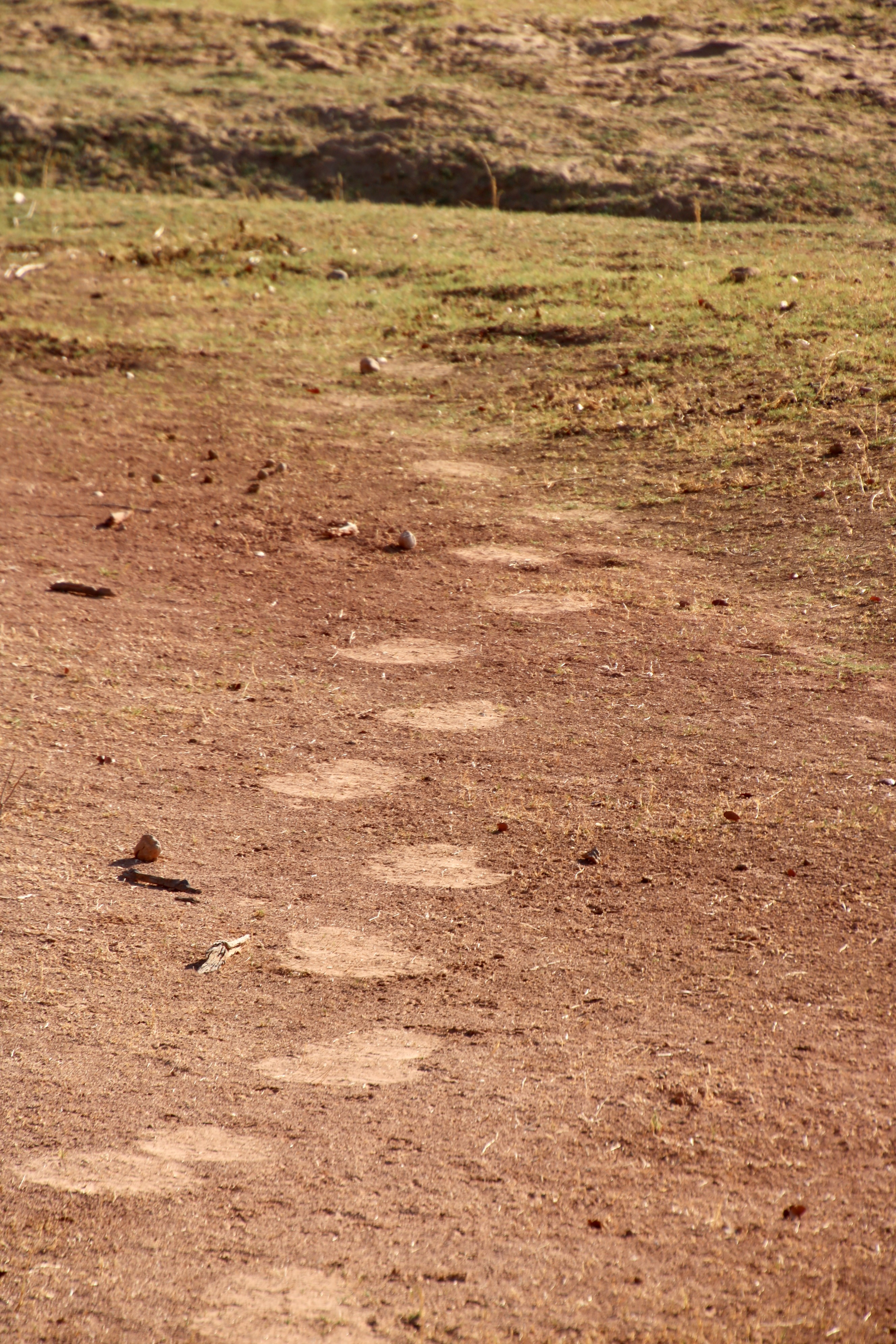 These elephants gave their ears a vigorous shake when they came out of the mud bath. Were they having a Woohoo moment, shaking the mud off, or doing something else?And now it’s time to turn to elephant’s feet. They’re big too, which shouldn’t come as any surprise considering they belong to animals weighing between 2 and 7 tons, the world’s largest land animals. This is an actual footprint of one that Peggy is holding up. It was made by Jumbo, the biggest elephant at the Wild Horizons Elephant Sanctuary, by pressing his inked foot down on paper. We bought the print and carried it home with us. The paper is rather unique in itself. It’s made out of recycled paper and elephant poop. To provide another perspective, this is my size 15 shoe next to a fresh elephant print. We came across it when we were on a safari walk with Terry Anders, who, along with his wife, Sheona, is the owner of the Iganyana Tent Camp located on the edge of Hwange National Park. Terry explained to us that its size indicated it was a large bull elephant. He also told us that each elephants footprint is unique like a fingerprint. Eventually the ridges wear down through extensive walking over varied terrain, providing an indication of the elephant’s age. Here’s what an elephant’s foot looks like close up. Like us, an elephant has five toes on each foot, but not all of the toes have toenails. It actually walks on its toes. A thick pad of gristle extends backward, working something like a shock absorber. The bottom line: This foot was made for walking, and walking it will do— up to 30 miles a day. And, if you irritate the elephant, it may walk all over you. (My apologies to Nancy Sinatra.)This is an elephant’s toe bone that Terry showed us when we were out on our safari walk.Tracking an elephant after a rainstorm would not be a problem!Elephants tend to follow the same routes to reach food and water, creating well worn paths.