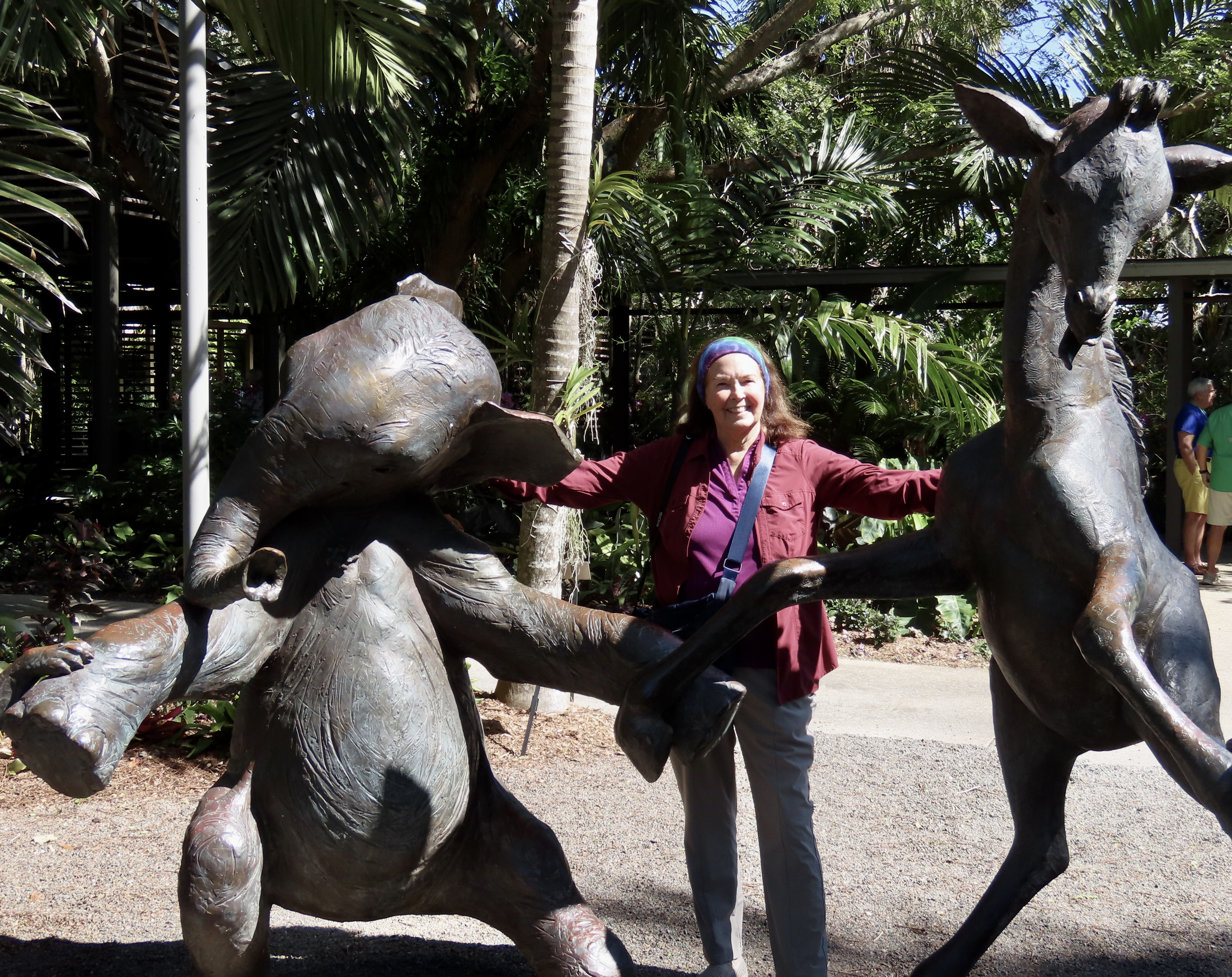 Another orchid. like the one above it was living on a tree.There were enough water lilies scattered throughout the garden that Monet could have spent a year painting them.They came in a multitude of colors.And where you have lilies, you have to have lily pads, right? This photo also gives a sense of the tropical paradise the gardens display.Like the lilies, the pads came in a variety of shapes and colors.In their own way, they were as impressive as the leaves. Oh to be a frog…The trees also had unique, weird personalities. This was a cannonball tree. We considered this tree even stranger. A sign announced it was a Ceiba Erianthos. Now you know. There will be a quiz.Or how about this? It’s called a screw pine and we could only wonder how it got that name. There were a multitude of palm trees in the garden, as one might expect. Many were covered in vines like this one.A close up of the vines. Quite beautiful.This tree had its own unique collection.Time for a little color. This plant was labeled an Annatto.When the pods open they display seeds that, apparently, are quite important to creating natural dyes.Have you ever checked out a banana tree?We heard a guide say that this was a red bellied woodpecker. It must have been hiding it. (Red headed was already taken.) It was one of the few birds we saw in the garden.Colorful leaves were everywhere. My mother used to love plants with colorful leaves. At any given time, a half dozen or so could be found in our house.A beauty.As was this.While on the subject of unusual…And suddenly, this fellow was warning us to leave.He wasn’t alone. More importantly, nature was calling, so we called it a day.On the way out, we came upon animals dancing in a circle. Of course Peggy had to join in the fun, positioning herself between an elephant and a giraffe, which takes us back to Africa. On Friday, I will be featuring crocodiles.
