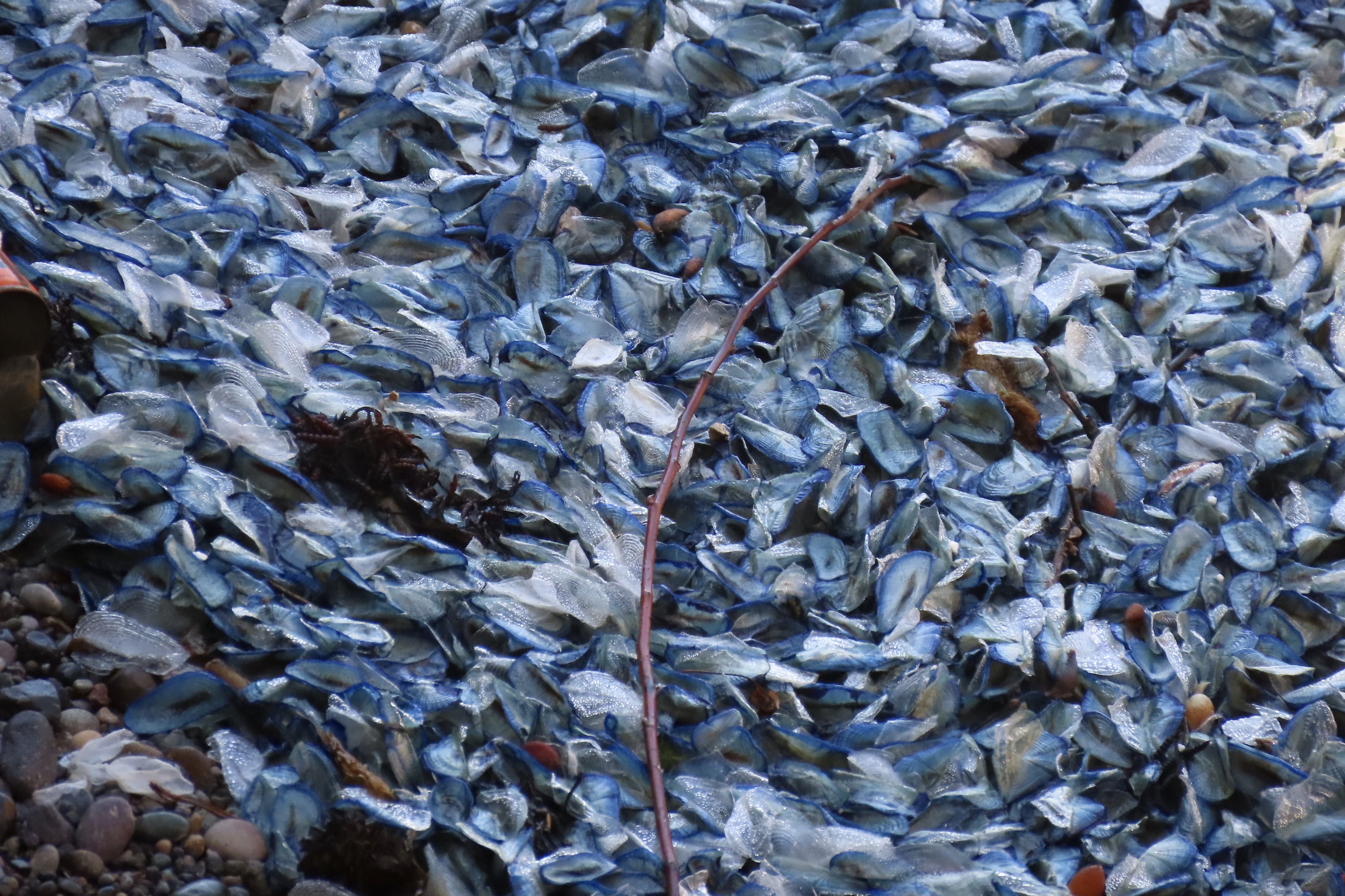 They are Velella, a small jelly fish that comes with a sail on its back. It normally lives offshore and uses the wind to move about in large numbers. Occasionally a strong Westerly will blow thousands of them ashore, however, where they die. And stink. I’ve seen and smelled them several times over the years. Apparently the odor does not bother the seals.