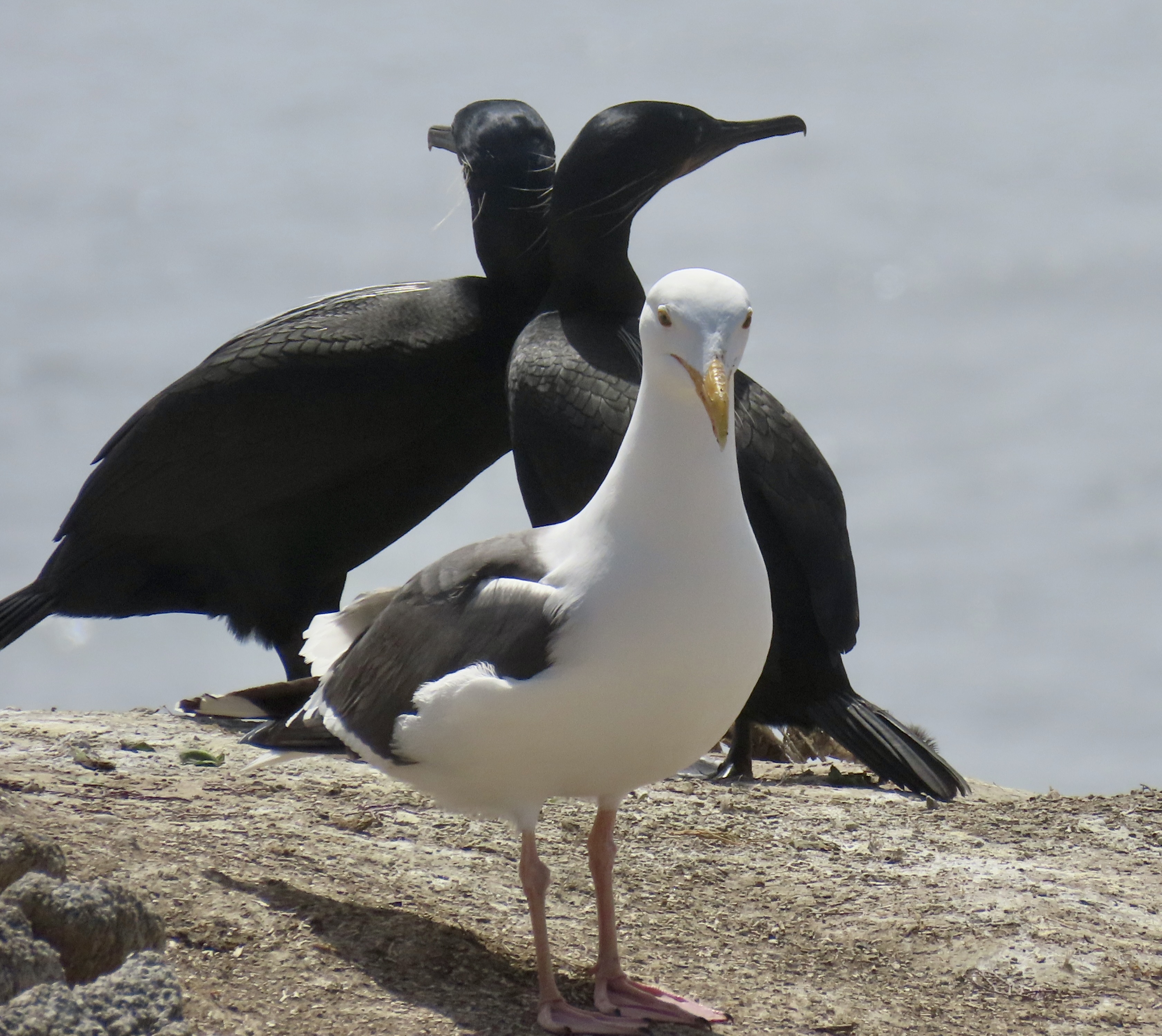 A California sea gull insisted on being in our first photos of the two cormorants shown above. The cormorants divided their attention between communicating with each other and checking their surroundings. Or maybe they were necking.