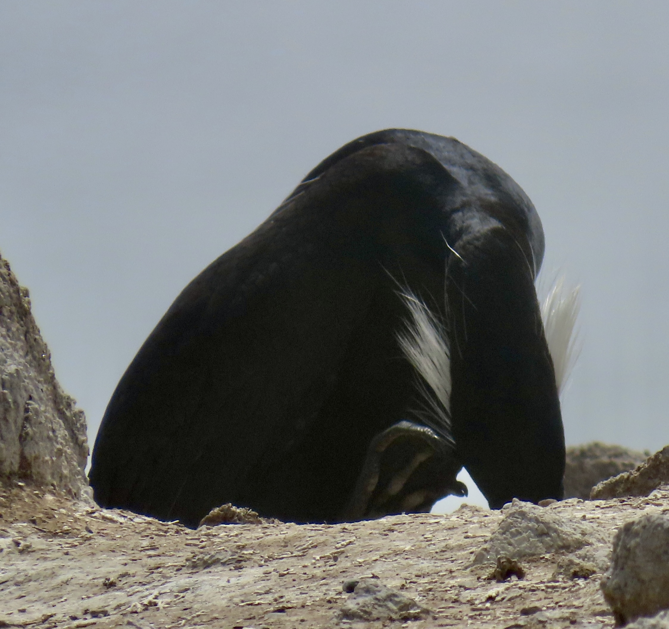 Actually, an important part of the mating ritual is for the male to build a nest with the hope of attracting a female to use it. We watched another male advertise his services. It appeared that the the nest was a little too makeshift. The female did not seem impressed. Maybe it was the fact that she had just watched him steal the materials from another cormorant! You can see the beak of the crime victim in the upper left hand corner about to deliver a peck.