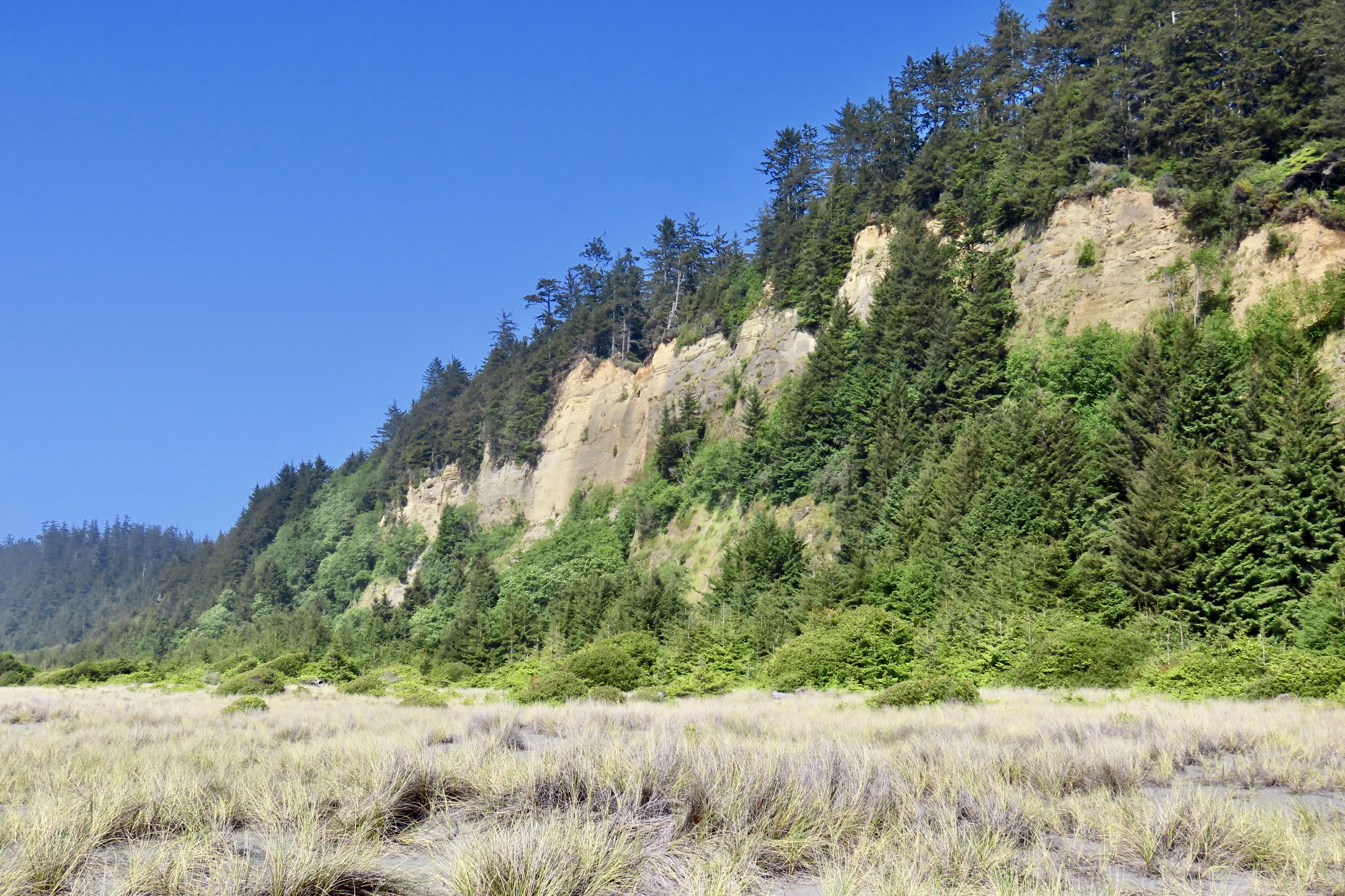 Fortunately, the road became wider and flattened out when we reached the ocean. Heavy equipment was eliminating pot holes. Gold Bluffs was on our right…