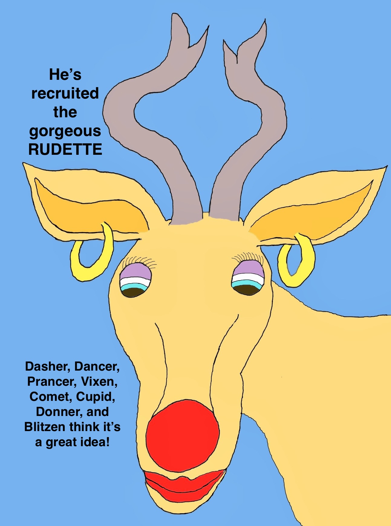 Dasher, Dancer, Prancer, Vixen, Comet, Cupid, Donner, and Blitzen are all for Santa’s decision. They think it will be a lot more fun to follow Rudette for 100 million miles than Rudolph. What a surprise? But wait, negotiations are under way, and…