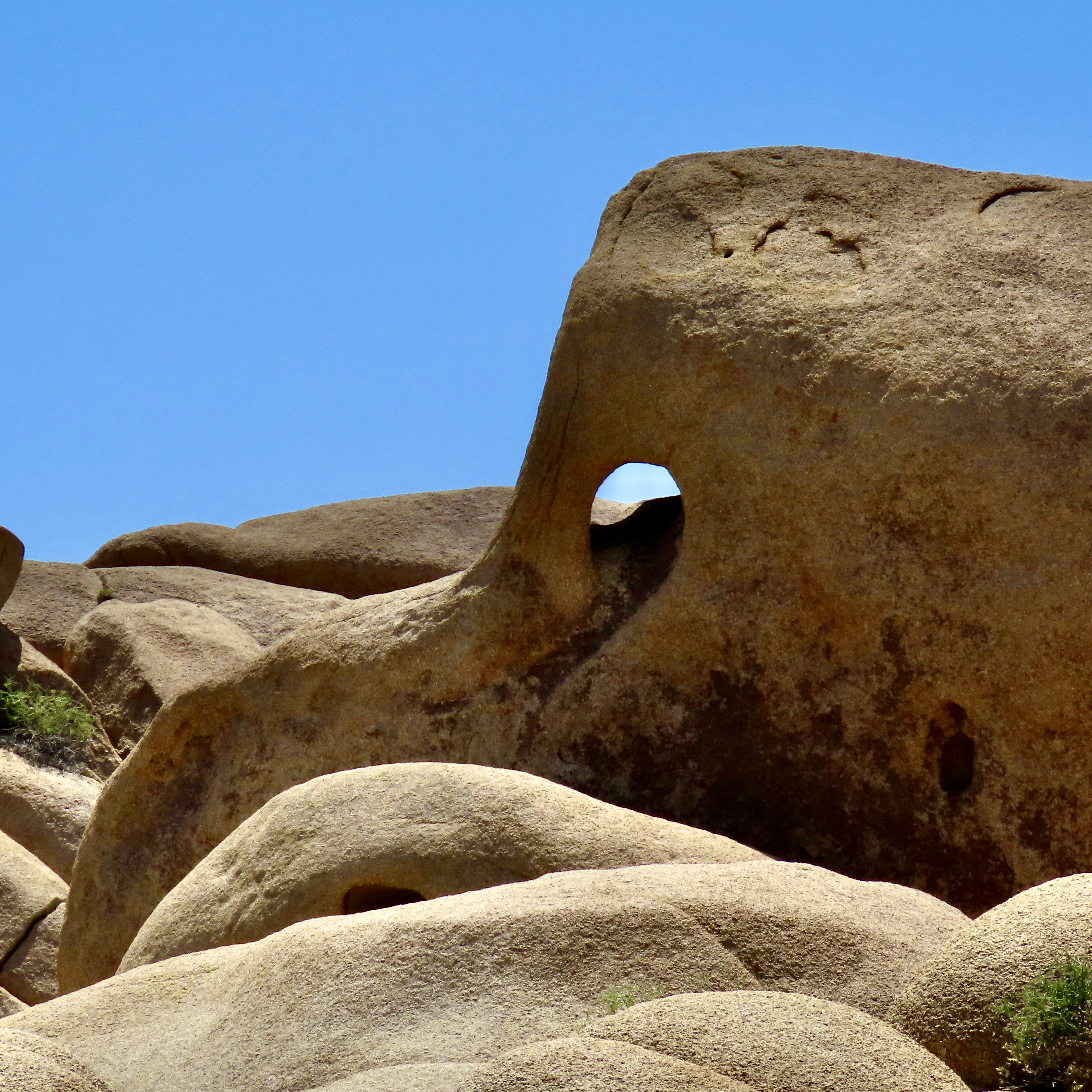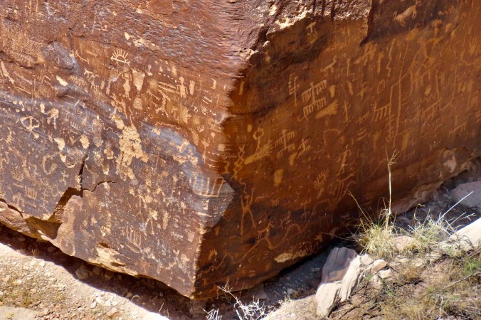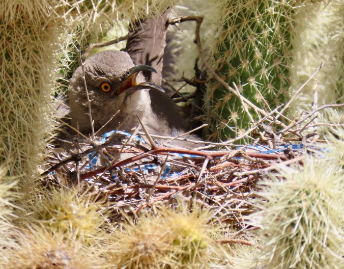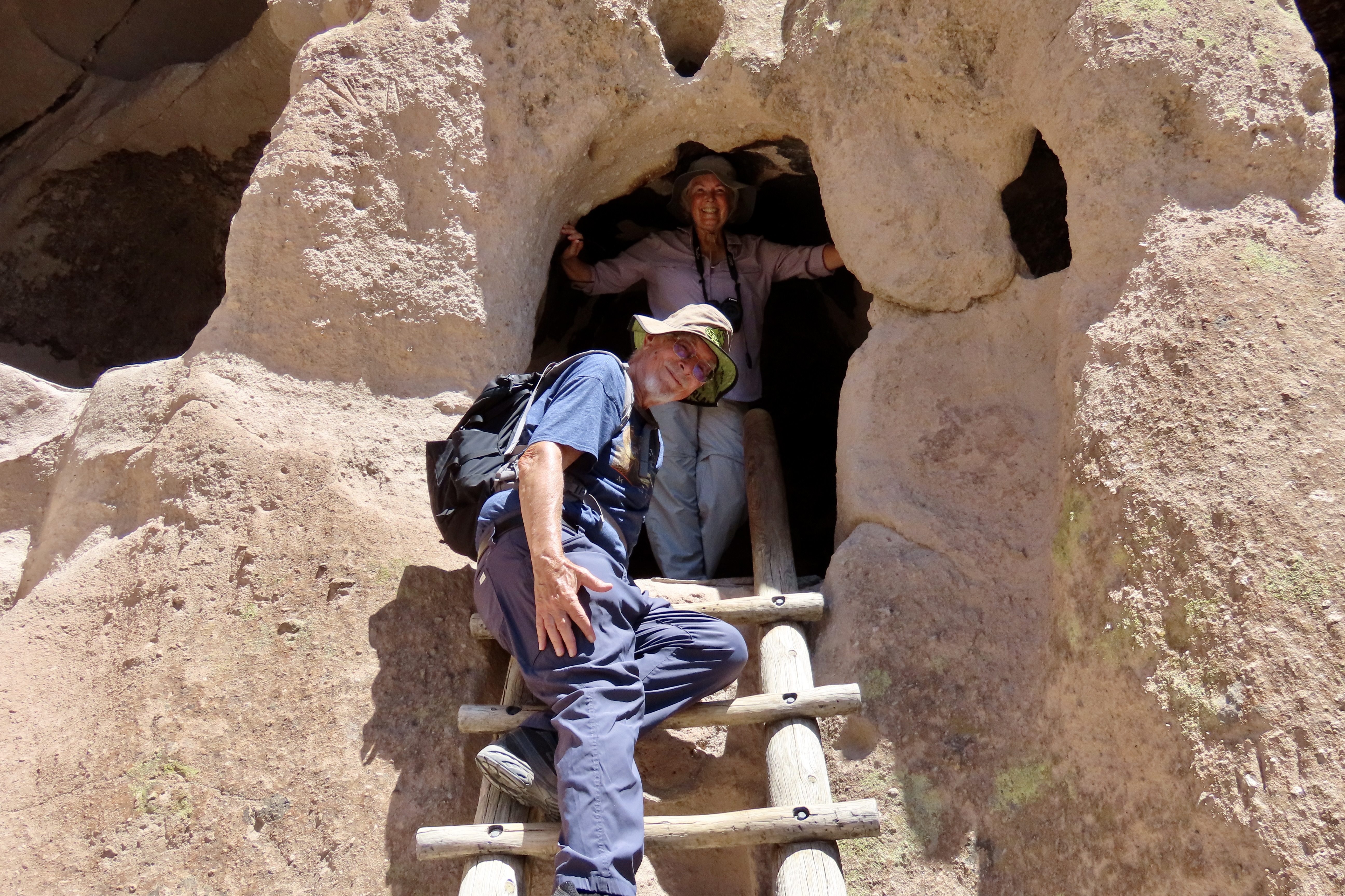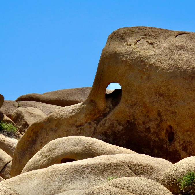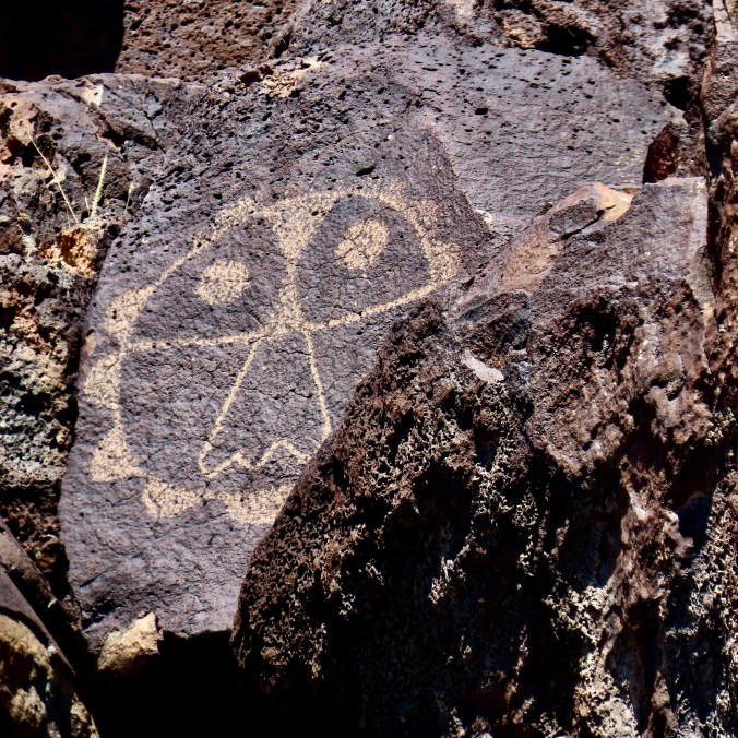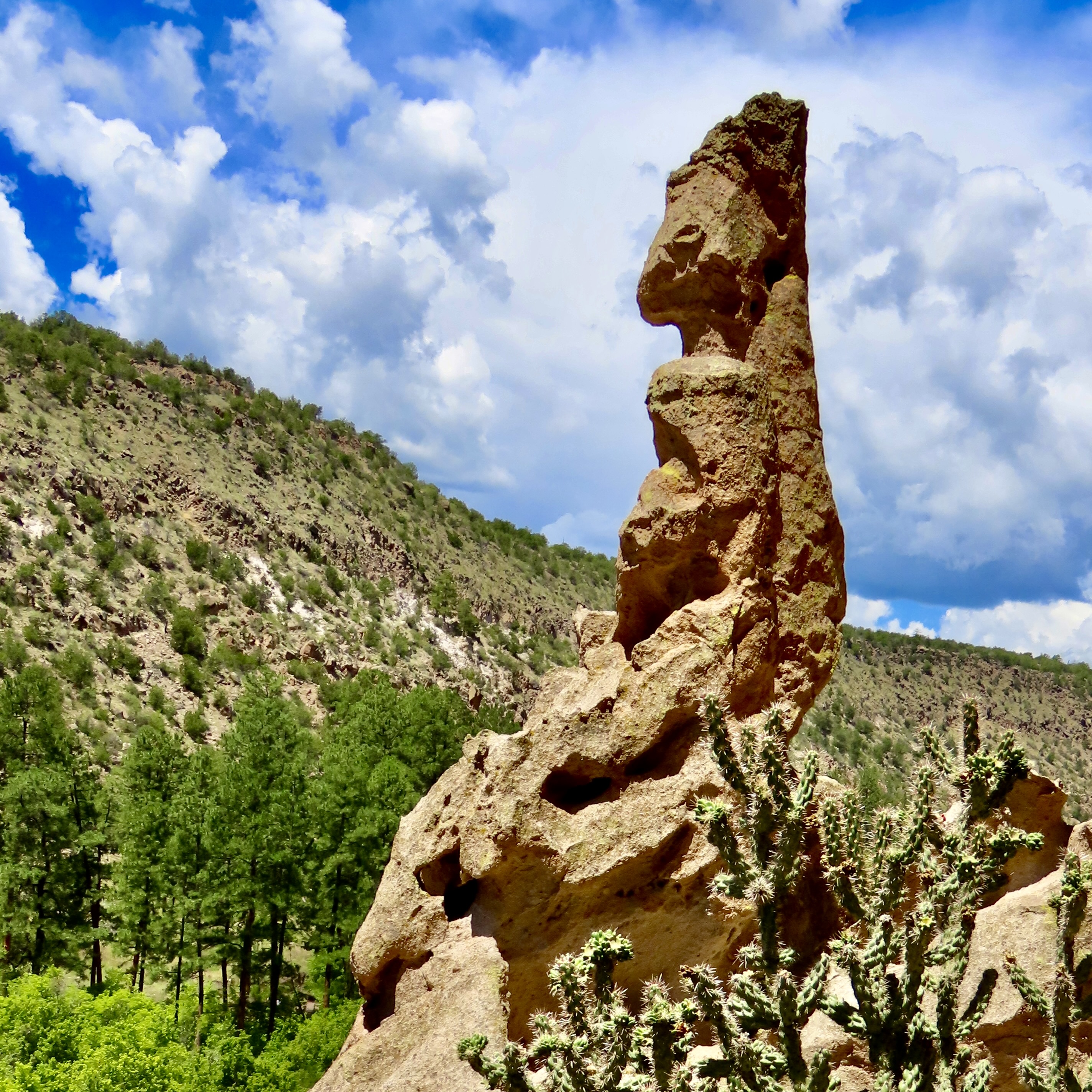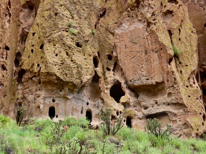 Petrified Forest National Park is found just off of I-40 in eastern Arizona. There are thousands of logs like the one above found in the park. You can still see the bark on this petrified wood that was once a tree that fell 200 million years ago.While most people come to the park to admire the petrified wood, there is also much beauty such as the colorful ‘Teepees’ found on the main road. Each color has a different story to tell representing millions of years in geological history.The Blue Mesa side road includes many other interesting and colorful land forms such as this. If you visit the park, be sure to take the short detour. A walk out in the desert on well maintained trails is definitely in order.Ancestral Puebloans and other indigenous tribes left a view of their ancient world in Petrified Forest NP in petroglyphs on Newspaper Rock. While our understanding of what they were communicating is limited, there is magic in contemplating the possibilities.While we are on the subject of petroglyphs, we found this unique one staring out at us in Petroglyph National Monument in Albuquerque, NM. Over 20,000 petroglyphs have been discovered in the monument. Peggy has plans to include this one in the revision of her word search book: Artistic Word Searches, Unique and Magical: Discovering Petroglyphs from the Southwest.Canyon De Chelly (pronounced shay) is located in northeastern Arizona. Jointly operated by the Navajo Nation that owns the property and the National Park Service, Canyon De Chelly features striking canyon views plus Ancestral Pueblo ruins and petroglyphs left behind by both the Pueblo peoples and Navajos.Our trip this past spring and summer took us into Califonia where we visited family and friends in San Diego, LA, and Sacramento. We also took time to visit Joshua Tree National Park in Southern California, known for its strange trees, after which it is named.We found the rock structures to be of equal, if not greater, interest. Some of which could be said to possess personalities.In addition to being known for its outstanding rock forms (think of the Grand Canyon, Zion, Bryce and Arches— plus what we visited this year), the Southwest is noted for its deserts and cacti, none of which is better known than the Giant Saguaro. We’ve often stopped to admire these huge plants in Saguaro National Park but have never been in Arizona when they are blooming. Things were about to change. Note the buds popping out on top of the arms.This time we were lucky. The blooms are almost other-worldly, in addition to being a source of food for numerous insects such as the bee coming in for a landing.A number of other cactus flowers also lit up the desert.Like plants, animals adjust to the deserts of the Southwest. Several birds choose to nest among the needles of various cacti including the curved bill thrasher Peggy found raising her family in a cholla cactus. The thrasher was not happy when she sneaked up to it and her hatchlings to catch a photo with her iPhone. It’s probably a good thing Peggy couldn’t understand what momma was saying.Bandelier National Monument, located mere miles away from where the first atom bomb was created at Los Alamos, New Mexico, features the ruins of homes built by Ancestral Puebloans that included natural and carved caves (cavates) with pueblo structures once built up against them.Peggy and I climbed up to one of the cavates. It was quite cozy inside. “Honey, I’m home.”Just beneath the cavate, this outcropping of rocks overlooked the large Tyuonyi Pueblo at Bandelier. A corner of the ruins can be seen here. It was built in a circle and contained contained 400 rooms.This tall rock was among the rocks in the outcropping. My first thought was wow! Nowhere in our travels though out the Southwest have we seen a statue like it carved by Ancestral Puebloans or any other indigenous tribes. We had a guide to the trail we were walking on, but there was no information on the statue. Nor was there anything in the information center. The emphasis was all on the scenery, cavates, petroglyphs and pueblos. Human or nature carved, I would think that the park’s literature would at least comment on it. That’s it for today. Next up:We wrapped up our year of travel with out trip to New England so it’s proper that we finish off 2025 with the trip.