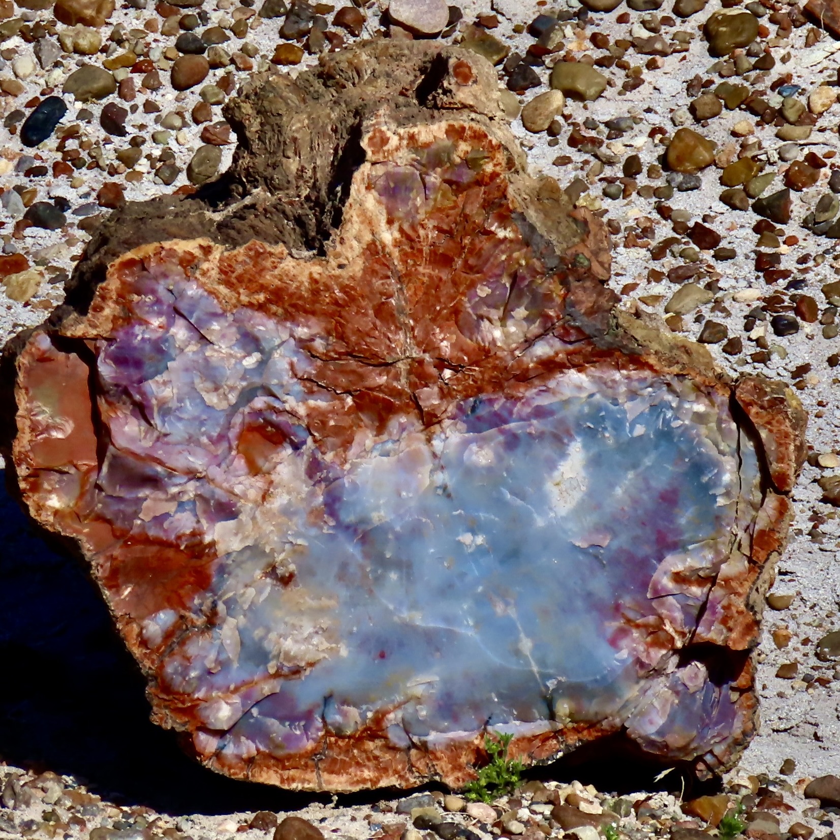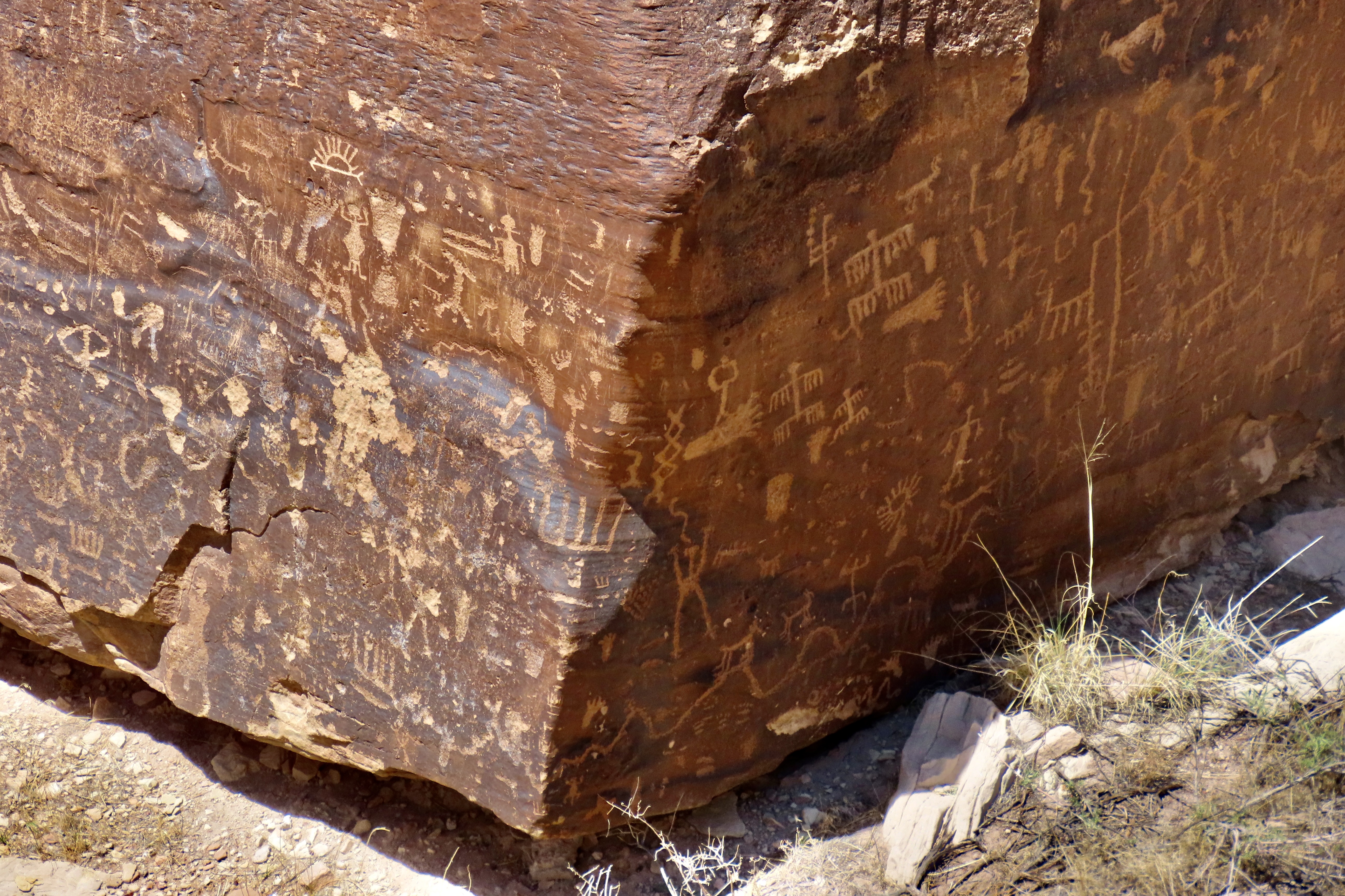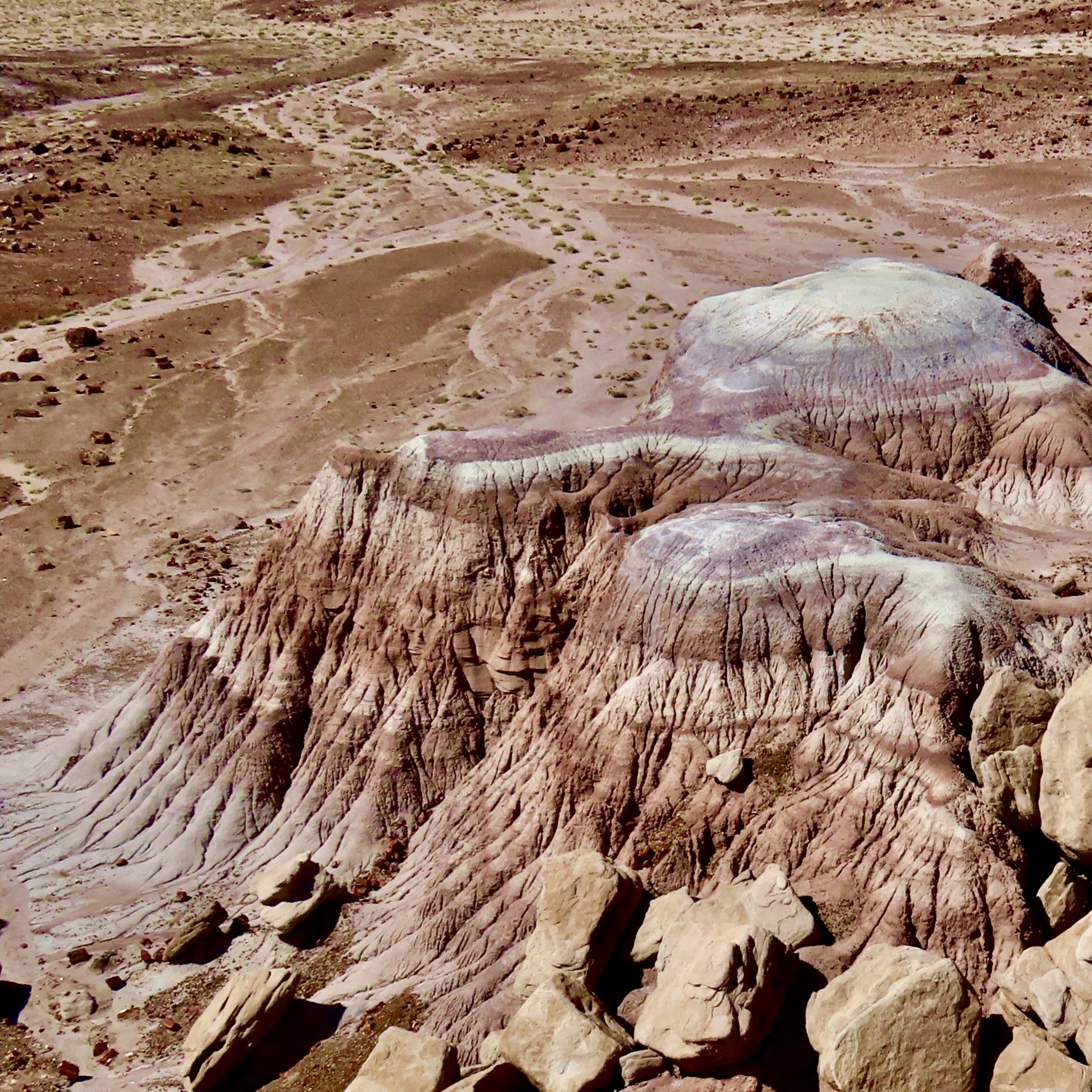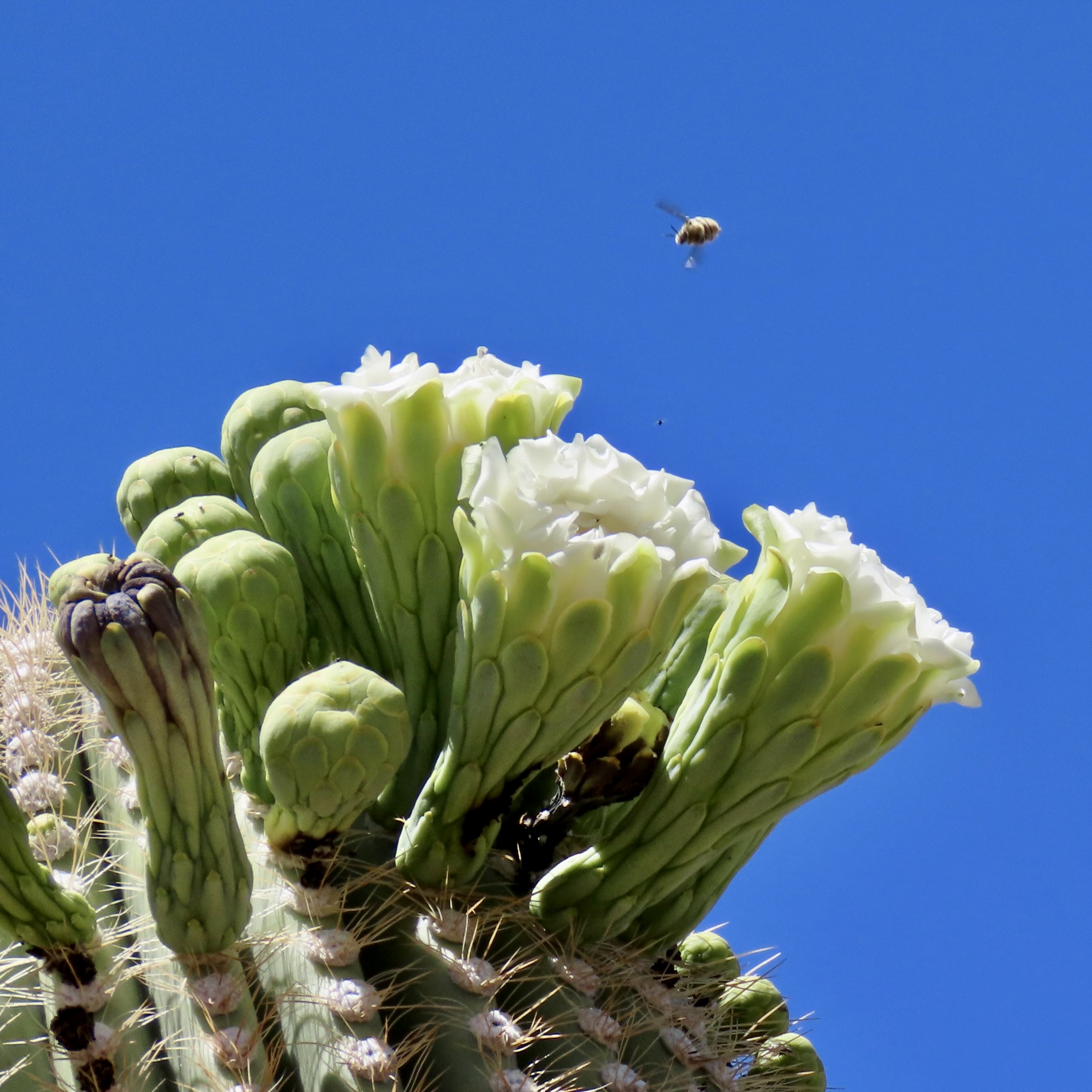 Petrified Forest National Park is found just off of I-40 in eastern Arizona. There are thousands of logs like the one above found in the park. You can still see the bark on this petrified wood that was once a tree that fell 200 million years ago.While most people come to the park to admire the petrified wood, there is also much beauty such as the colorful ‘Teepees’ found on the main road. Each color has a different story to tell representing millions of years in geological history.The Blue Mesa side road includes many other interesting and colorful land forms such as this. If you visit the park, be sure to take the short detour. A walk out in the desert on well maintained trails is definitely in order.Ancestral Puebloans and other indigenous tribes left a view of their ancient world in Petrified Forest NP in petroglyphs on Newspaper Rock. While our understanding of what they were communicating is limited, there is magic in contemplating the possibilities.While we are on the subject of petroglyphs, we found this unique one staring out at us in Petroglyph National Monument in Albuquerque, NM. Over 20,000 petroglyphs have been discovered in the monument. Peggy has plans to include this one in the revision of her word search book: Artistic Word Searches, Unique and Magical: Discovering Petroglyphs from the Southwest.Canyon De Chelly (pronounced shay) is located in northeastern Arizona. Jointly operated by the Navajo Nation that owns the property and the National Park Service, Canyon De Chelly features striking canyon views plus Ancestral Pueblo ruins and petroglyphs left behind by both the Pueblo peoples and Navajos.Our trip this past spring and summer took us into Califonia where we visited family and friends in San Diego, LA, and Sacramento. We also took time to visit Joshua Tree National Park in Southern California, known for its strange trees, after which it is named.We found the rock structures to be of equal, if not greater, interest. Some of which could be said to possess personalities.In addition to being known for its outstanding rock forms (think of the Grand Canyon, Zion, Bryce and Arches— plus what we visited this year), the Southwest is noted for its deserts and cacti, none of which is better known than the Giant Saguaro. We’ve often stopped to admire these huge plants in Saguaro National Park but have never been in Arizona when they are blooming. Things were about to change. Note the buds popping out on top of the arms.This time we were lucky. The blooms are almost other-worldly, in addition to being a source of food for numerous insects such as the bee coming in for a landing.A number of other cactus flowers also lit up the desert.Like plants, animals adjust to the deserts of the Southwest. Several birds choose to nest among the needles of various cacti including the curved bill thrasher Peggy found raising her family in a cholla cactus. The thrasher was not happy when she sneaked up to it and her hatchlings to catch a photo with her iPhone. It’s probably a good thing Peggy couldn’t understand what momma was saying.Bandelier National Monument, located mere miles away from where the first atom bomb was created at Los Alamos, New Mexico, features the ruins of homes built by Ancestral Puebloans that included natural and carved caves (cavates) with pueblo structures once built up against them.Peggy and I climbed up to one of the cavates. It was quite cozy inside. “Honey, I’m home.”Just beneath the cavate, this outcropping of rocks overlooked the large Tyuonyi Pueblo at Bandelier. A corner of the ruins can be seen here. It was built in a circle and contained contained 400 rooms.This tall rock was among the rocks in the outcropping. My first thought was wow! Nowhere in our travels though out the Southwest have we seen a statue like it carved by Ancestral Puebloans or any other indigenous tribes. We had a guide to the trail we were walking on, but there was no information on the statue. Nor was there anything in the information center. The emphasis was all on the scenery, cavates, petroglyphs and pueblos. Human or nature carved, I would think that the park’s literature would at least comment on it. That’s it for today. Next up:We wrapped up our year of travel with out trip to New England so it’s proper that we finish off 2025 with the trip.