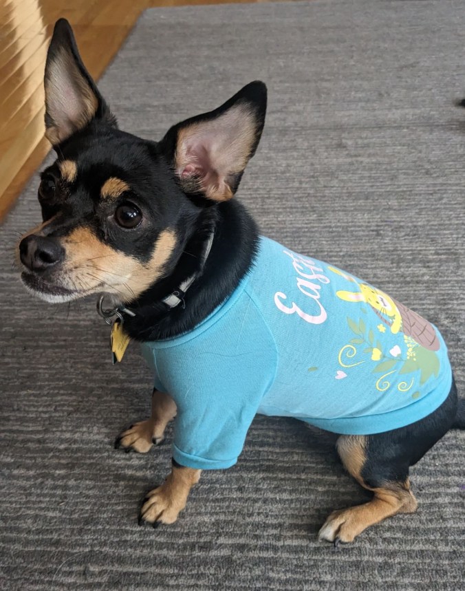 An endearing habit FE had was playing fetch with me. I’d roll up a small sheet of paper and toss it across the floor. Off she would go to retrieve it, bring it back to me, and drop it on the floor. Over and over. I never had the heart to tell her she was behaving like a dog. I’ll end this cat post with a quote from Einstein: There are two means of refuge from the misery of life: music and cats. I’d have to add dogs. They will be featured in our focus series to be posted a week from today.Our daughter’s dog, Rio, dressed up for Easter.
