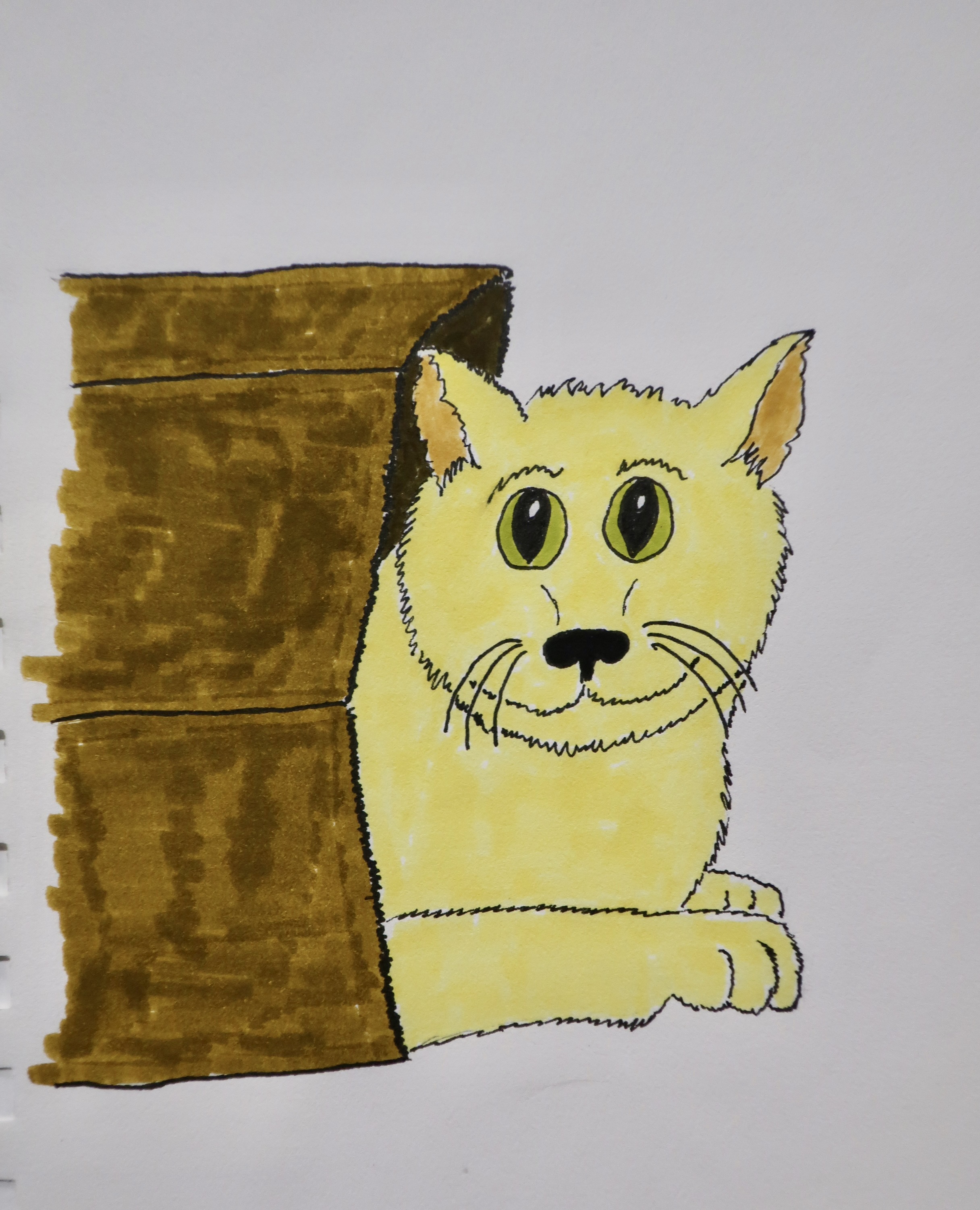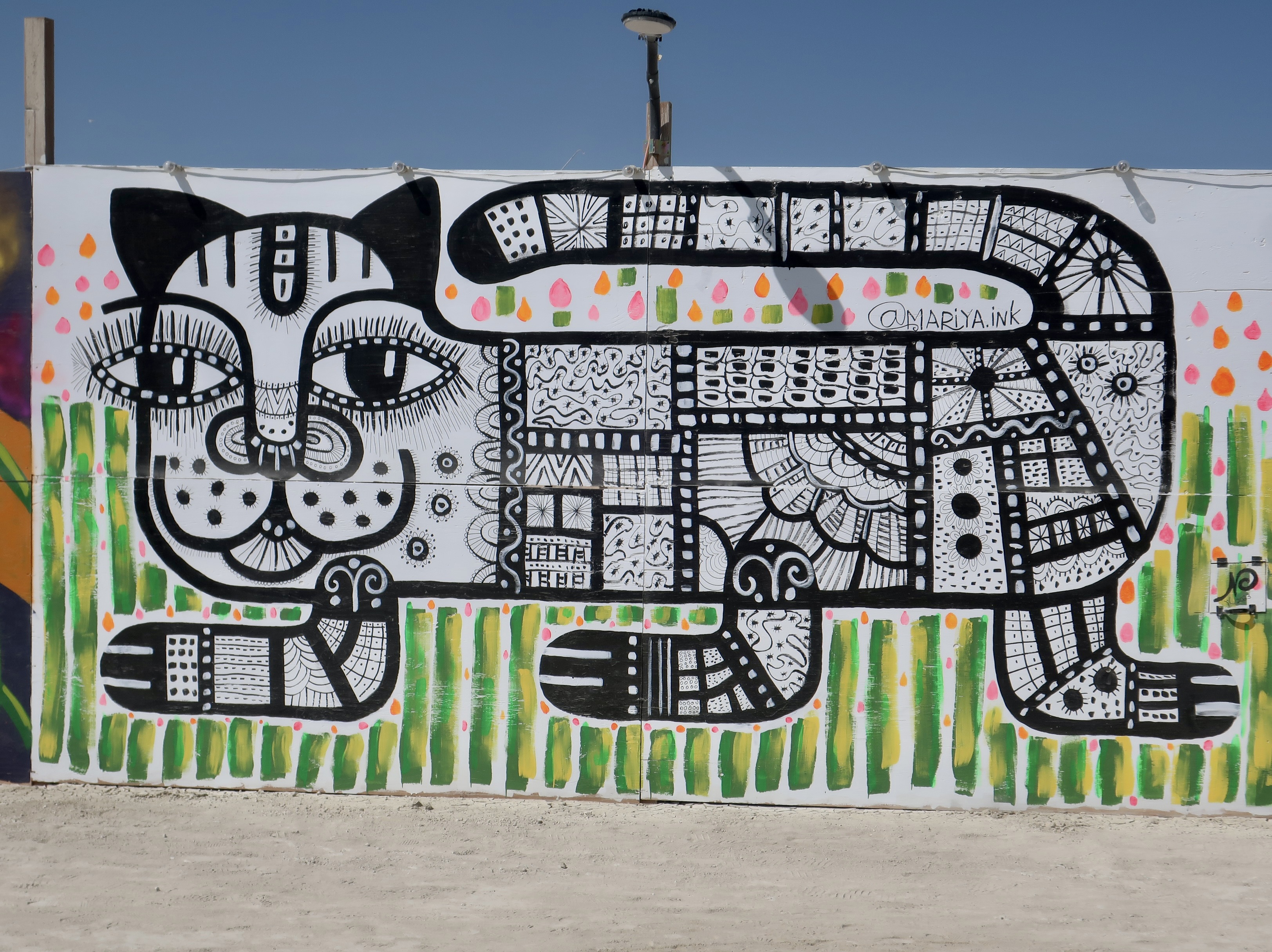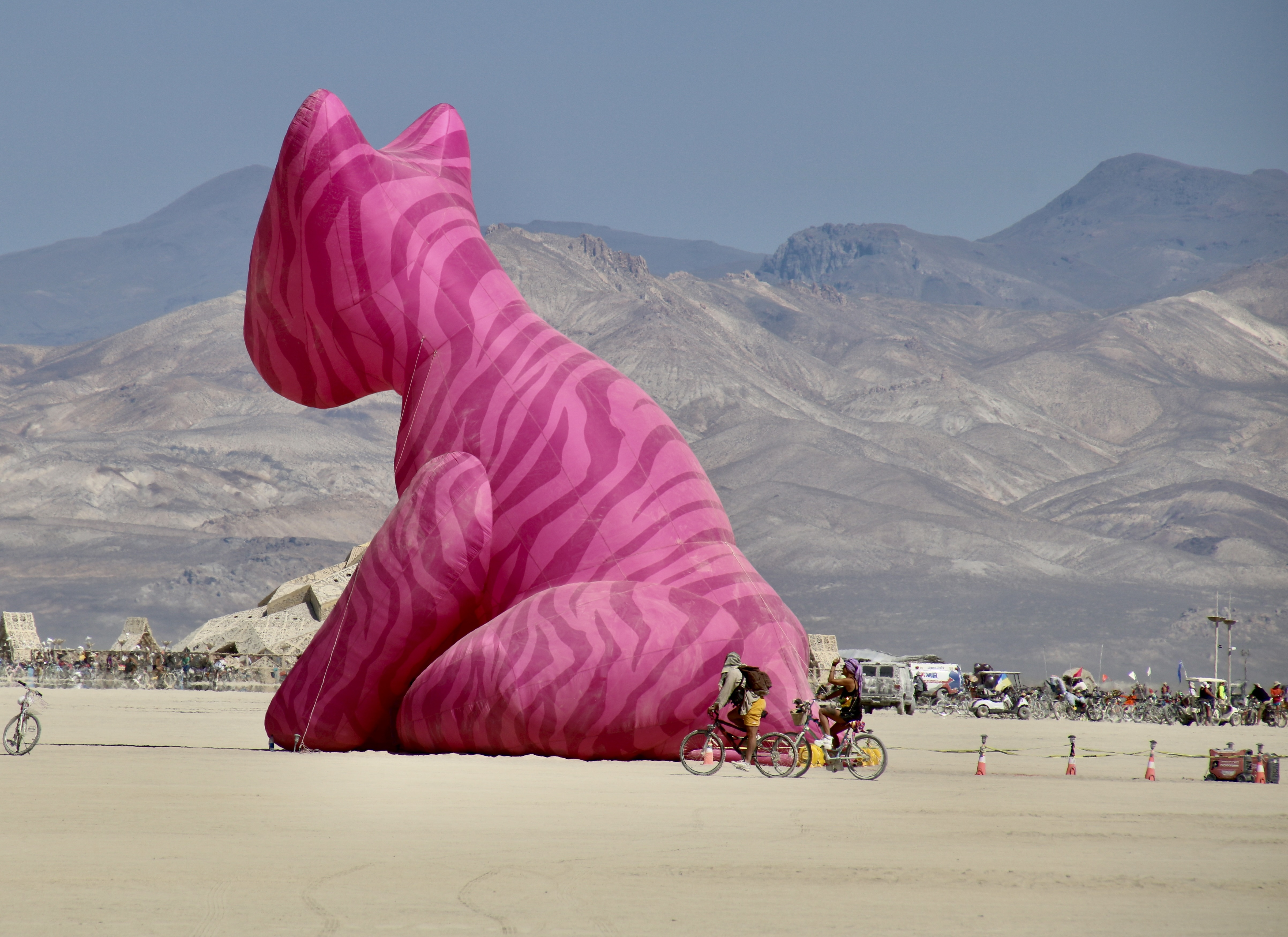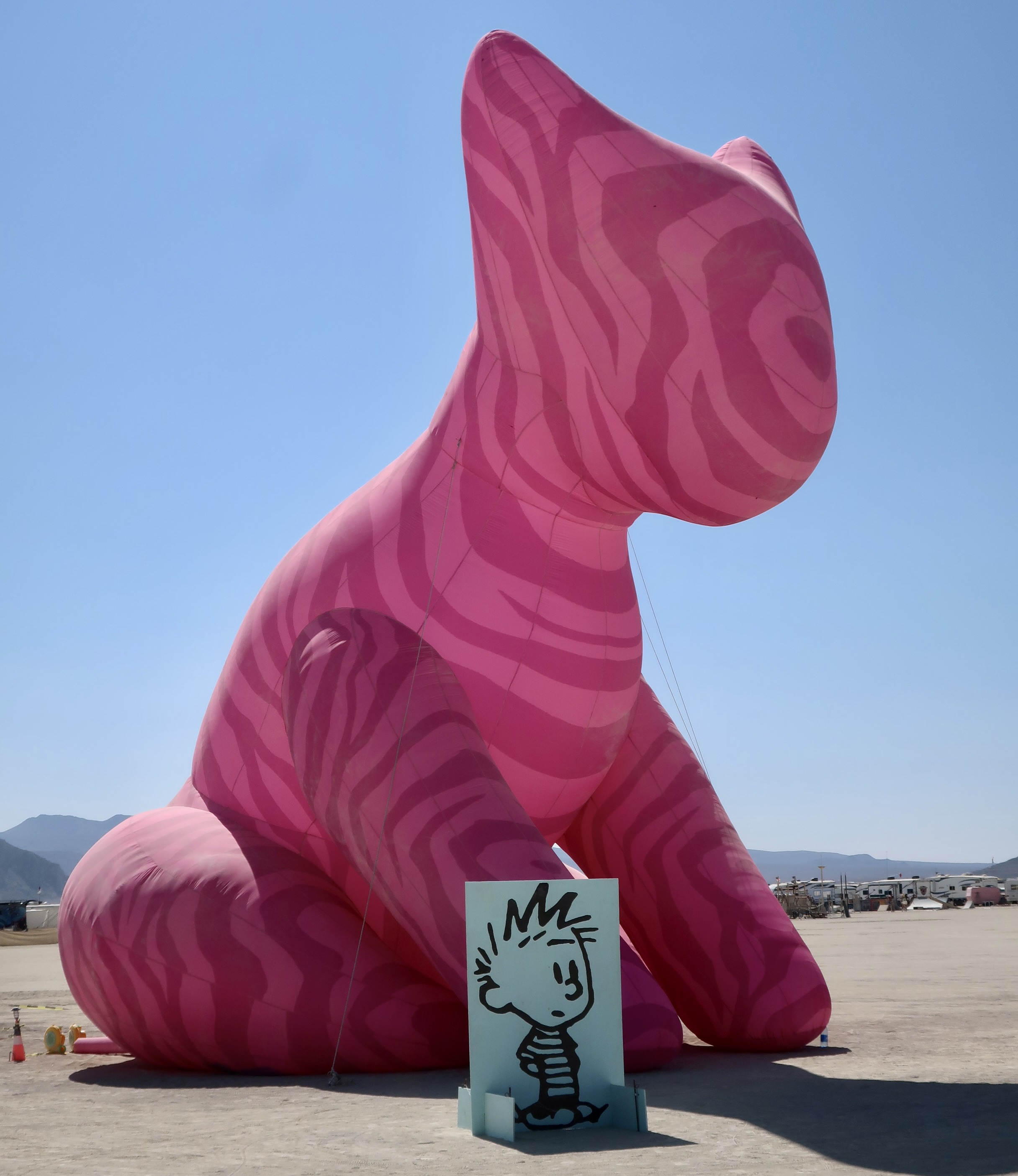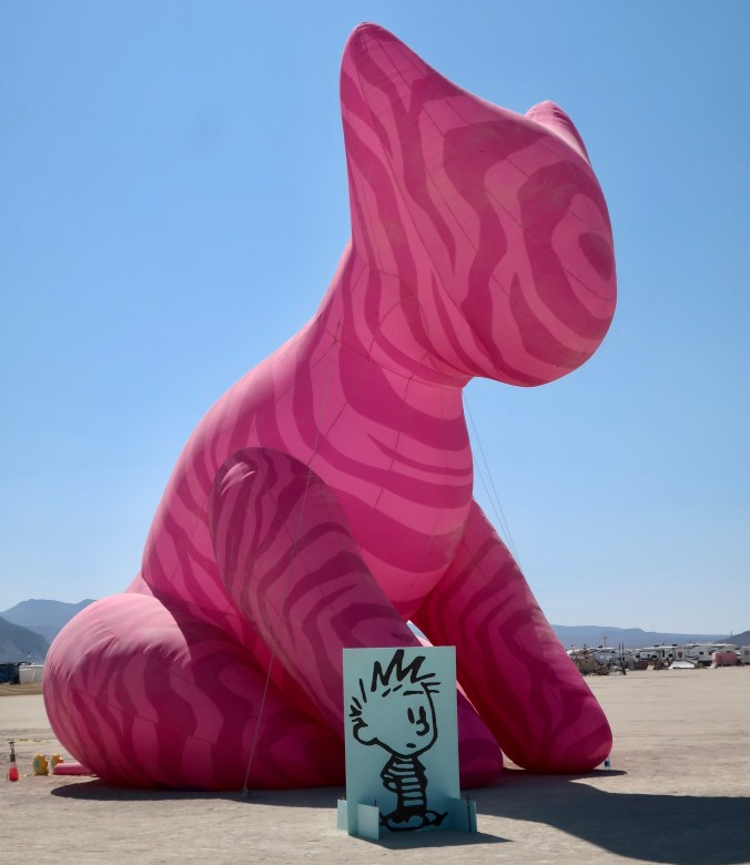Cats, we have discovered, like to hang out in ruins. Maybe there are more mice there. This one had placed itself on a pedestal (no surprise there, cats like high places) in the Ancient Greek city of Ephesus in Turkey. Check out its gorgeous whiskers. Other than being handsome, they are an important part of a cat’s navigation system, helping them slip though tight spaces and avoid objects in the dark. The whiskers are so sensitive, they can even measure changes in the air flow, such as that caused by a mouse running by. Din,din!It looked quite regal. As the author Terry Pratchett wrote, “In ancient times cats were worshipped as gods; they have not forgotten this.” To explore their early godhood, we need to travel to Egypt where the cat goddess Bastet reigned. We found this cat near the beautiful Alabaster Mosque in Cairo. Ears laid back and body arched, she was letting a dog know to stay away from some small chunks of cat food located nearby.She was quite insistent.Our favorite photo. Hisssss. The goddess Bastet went through several changes evolving down through the ages from being like a ferocious lioness initially to much closer to our domestic cats by 1500 BCE or so. We thought this one was definitely representing her lioness phase.“Need help with that dog, sister? We cats have to stick together.” (Photo from our African safari two years ago.)“Damn, why does she have to do that when I’m having my nap!” It’s no secret that cats like their naps— up to 70% of the time. In fact, the lioness above wasn’t roaring ferociously, she was yawning. (Photograph from our photo safari.)Originally Bastet was represented as a woman with the head of a lion. Eventually, she assumed the look of a woman with a cat’s head, or simply a cat like this representation of Bastet in the Egyptian Museum in Cairo. During the 22nd Dynasty, the city of Bubastis, located in the eastern part of the Nile Delta (the modern city with the interesting name of Zagazig), became the cult center of Bastet. A granite temple there was dedicated to Bastet and thousands of mummified cats were buried in a nearby cat cemetery. An annual festival, best described as a drinking party, drew thousands to celebrate Bastet. As the Greek historian Herodotus noted: ‘More wine grapes were consumed at the Festival than the whole rest of the year together.’A temple to Bastet built around 230 BC was found beneath the streets of Alexander, Egypt in 2010. Included in this important archeological find were 600 statues of cats such as this one.We found a number of their ‘descendants’ still hanging out in the city at the tall Pompey column, including the above two catnapping in the sun.A calico cat posed prettily for us while her brothers and sisters were busy eating behind her. I’d bet on her being female because male calico cats are extremely rare and sterile. It’s all about genes.Speaking of poses…James Herriot once said that “Cats are connoisseurs of comfort.” This fellow proves the point. What could be more comfortable than a soft, black, motor scooter seat absorbing the sun after a rainstorm. I’d say the look on the kittie’s face is pure bliss. The Cat’s Meow, perhaps? (You might have to Travel back to the 1920s for this reference. Or at least Google.) We took this photo on the island of Corfu in the Ionian Sea.This young cat on the Greek Island of Santorini also proved Herriot’s point. It would probably still be sitting there enjoying a head rub by Peggy if we hadn’t of had a boat to catch.Not so this guy. I’d moved to rub behind his ears and he had responded by trying to take my hand off. It wasn’t too surprising due to the fact that we were in Rome’s Colosseum where his ancient relatives once dined on reluctant Christians. He had a reputation to maintain. Now, to cross the ocean and return to Burning Man…On our first journey out to the Playa in 2023 we discovered this huge pink cat dominating the desert. Curiosity drove us to ride our bikes around to the front. What did we discover???It was Hobbes, as Calvin made plain! But why pink? The simple answer: It was Burning Man where being different is an art form. It’s close to a rule.Calvin and Hobbes is my all-time favorite comic strip. I’m fortunate that my digital newspaper does reruns. I jumped into the comic section on Friday when I was putting this post together. This was the daily strip. How can anyone not love these two characters?I included a Burning Man mural featuring a cat in my blog last week promoting today’s post on cats. This is another cat mural from BM 2023.Traveling south to Mexico, we found an imaginative green cat in a box in Puerto Vallarta (along with what I assume were two armadillos). The cat came from the state of Oaxaca in southern Mexico, which is renowned for its wood carvings. If you have ever had a cat, you know they love to play in boxes and paper bags.This is one of the cat cartoons I’ve created. It’s titled, ‘Who let the cat out of the bag?’Here’s another one of my cat cartoons. I titled this “Old Tom cleverly disguises himself by hiding out in the cattails.” I think he was tying to catch the ‘blue bird of happiness.’ He’d heard it was a Happy Meal.Peggy and I are strong supporters of Independent bookstores and firmly believe that each of them should have a cat. We’ve discovered over the years that some of the best do. This is Catsby at the Gallery Bookstore in Mendocino, California.A closeup of Catsby.Peggy and I have visited the Gallery Bookstore several times over the years. Once it was during Covid. Catsby’s poster was next to the front door. And now it is time to wrap up this post with a visit to the the three cats I have been closest to over the years.I grew up with cats and dogs. This was Demon, named after her black cat persona, piercing eyes, and all of the time she spent in the Graveyard next door. My first memory of her was when I was six and she was one very pregna