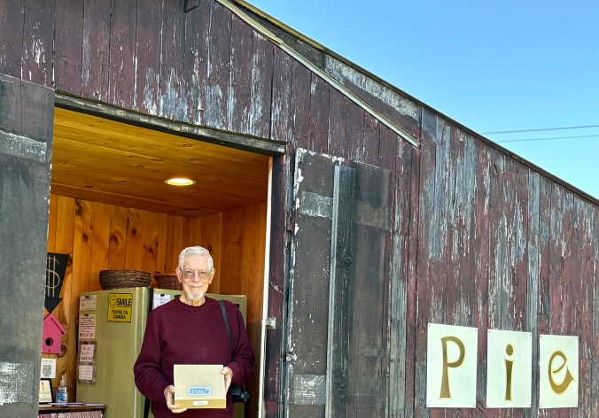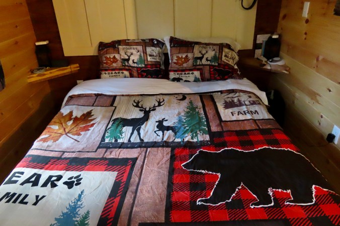 The real challenge was the cold. Temperatures were dropping below freezing and the cabin came with air conditioning, i.e. gaps in the structure that guaranteed that the temperature inside matched the temperature outside. Somehow, I ended up with one blanket. Peggy ended up cozy. I’ve never been able to figure out how she does that. It was a warm blanket, however. My biggest problem was cold feet. I put on my slippers. The other problem was having to pee, not once, not twice, but three times. I rarely have to go twice and never 3 times! Out I dutifully went each time, at least off the porch.