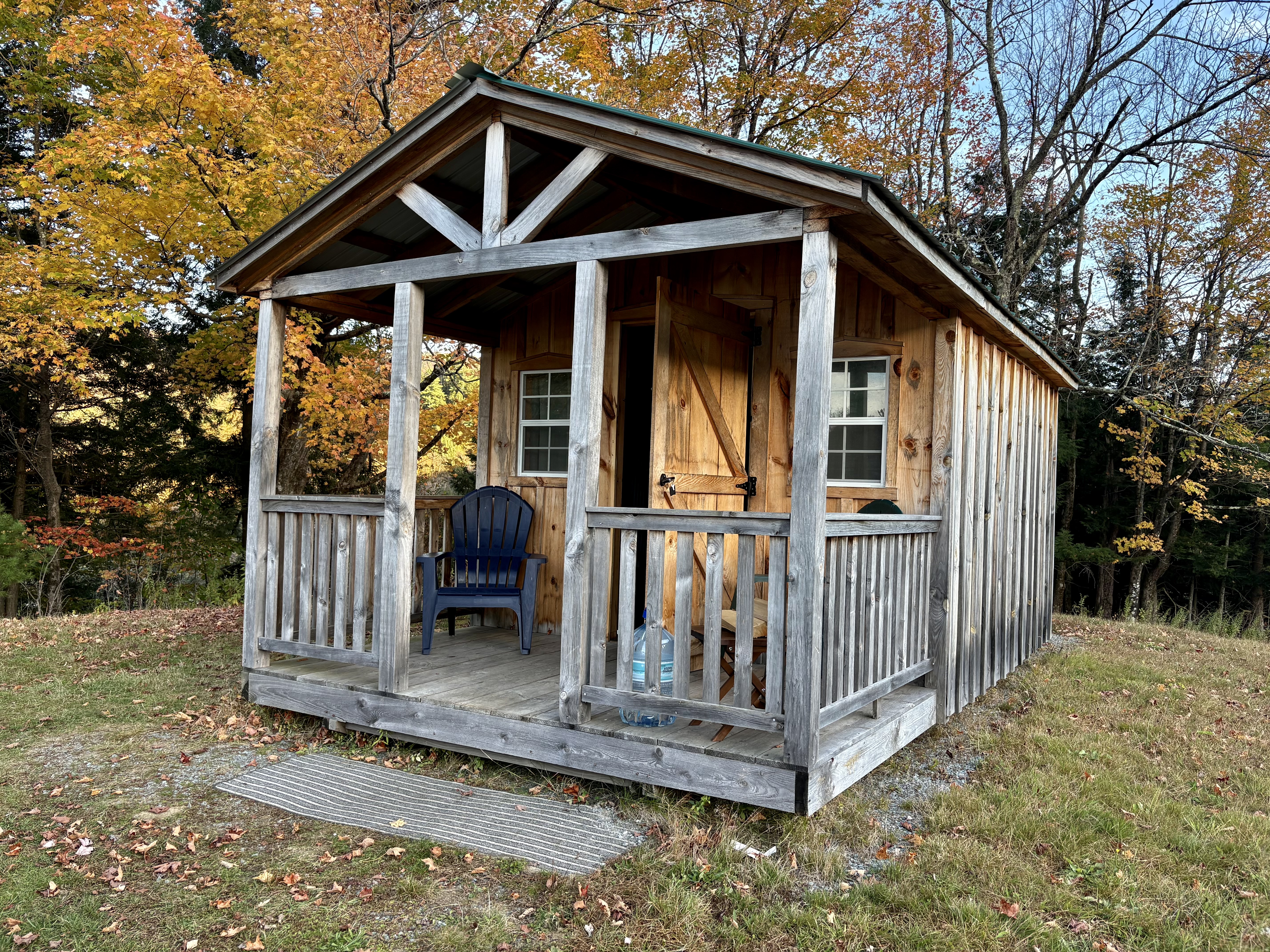 After a pleasant drive over country roads, we arrived at the cabin. As promised, the owner had left the key in the door. Inside, we discovered our furniture was a double-bed sized futon and a coffee table. Electricity was a battery connected to a small lamp. Our water was in a large bottle on the porch. As for a bathroom, it was an outhouse located about 25 yards away. None of this mattered to us. We are backpackers. We even had an extra lantern, a backpacking stove and headlamps along.