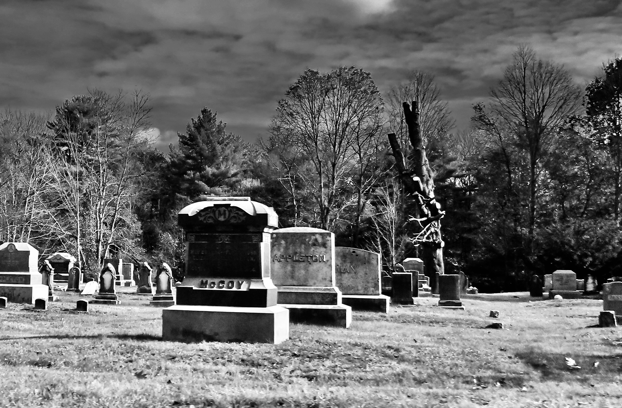 Night was different. The Graveyard became a place of mystery and danger. Dead people abandoned their underground chambers and slithered up through the ground. A local test of boyhood bravery was to go into the Graveyard after dark and walk over myrtle-hidden graves, taunting the inhabitants. Slight depressions announced where they lived. Marshall, who at nine was two years older than I, persuaded me to accompany him there on a moonless night. I entered with foreboding: fearing the dark, fearing the tombstones, and fearing the ghosts. Halfway through I heard a muzzled sound. Someone, or thing, was stalking us.