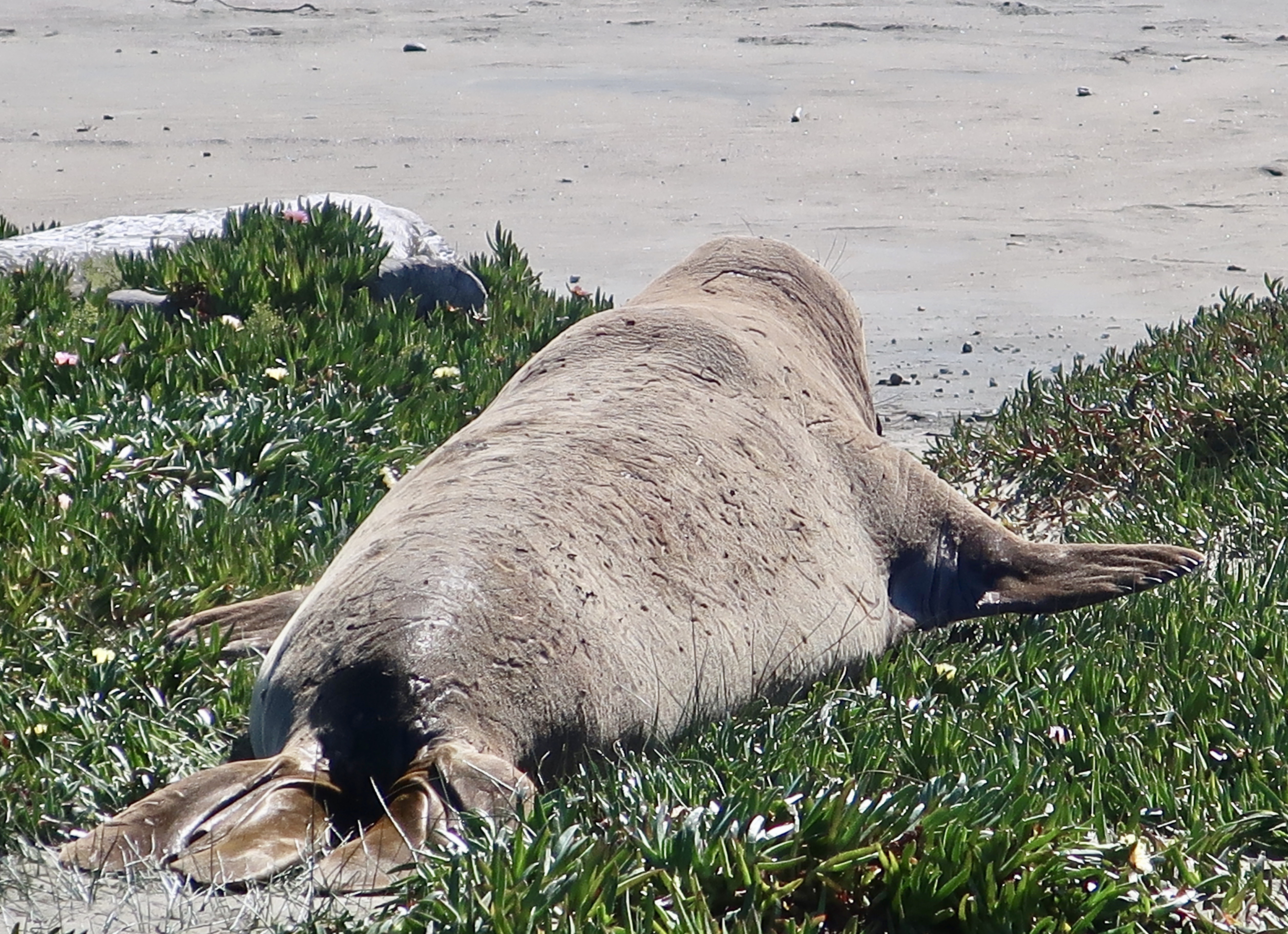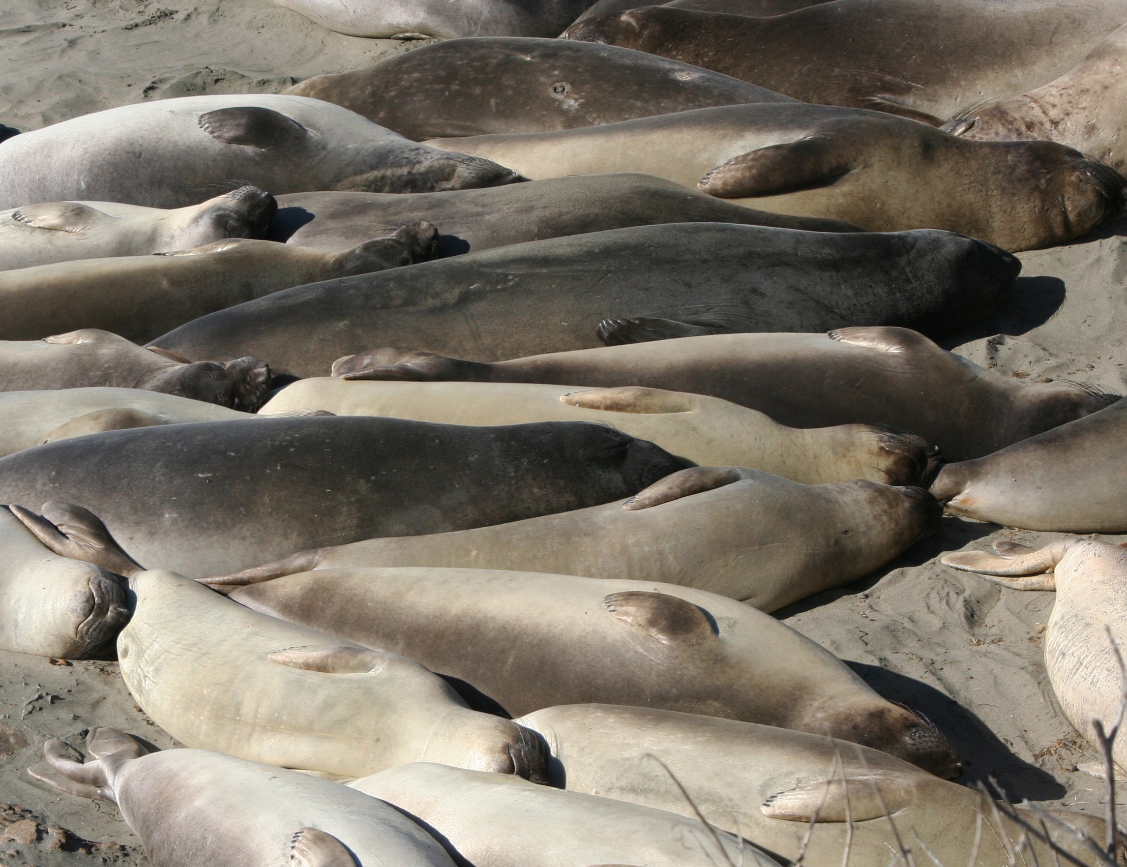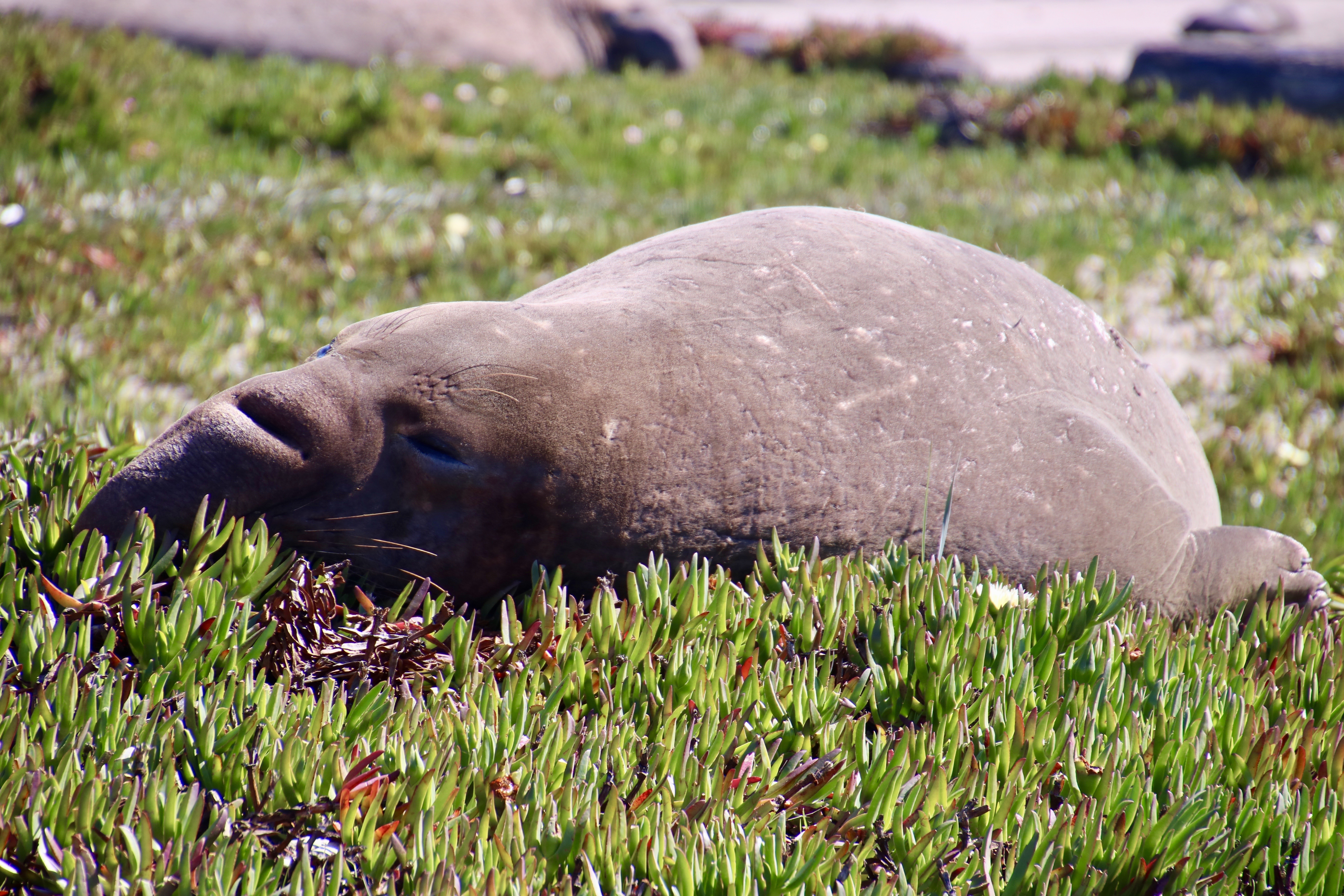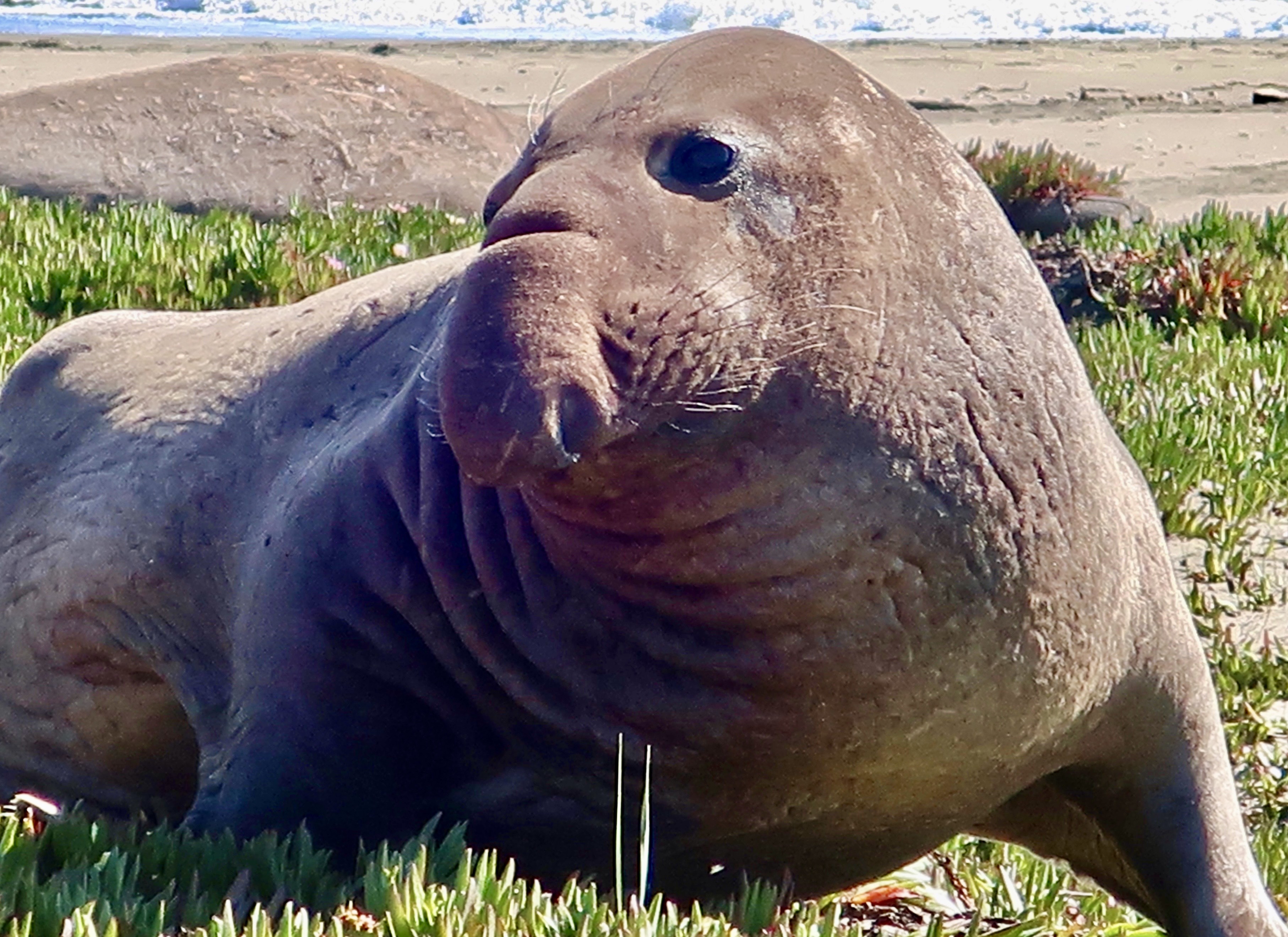 They are uniquely qualified for the dives. For example, while you or I take a deep breath before we dive, elephant seals expel theirs to avoid having their lungs crushed by the tremendous pressure that exists at 1000 plus feet under the sea. Instead, they store extra oxygen in their blood. They have three times as much blood as we do on a per pound basis, i.e. lots, and and their blood is much richer in hemoglobin. They also reduce their heart rate when they dive and focus the majority of their blood on servicing their vital internal organs. Using these evolutionary modifications they are able to dive for 30 plus minutes per time, resurfacing for a short 3 minutes. Elephant seals continue to forage constantly during the migrations between their primary feeding ranges and where they travel to breed, have pups, and molt. It’s a good thing. When they arrive, they fast for the time they are on shore, (2-3 months), living off of the fat they have stored.