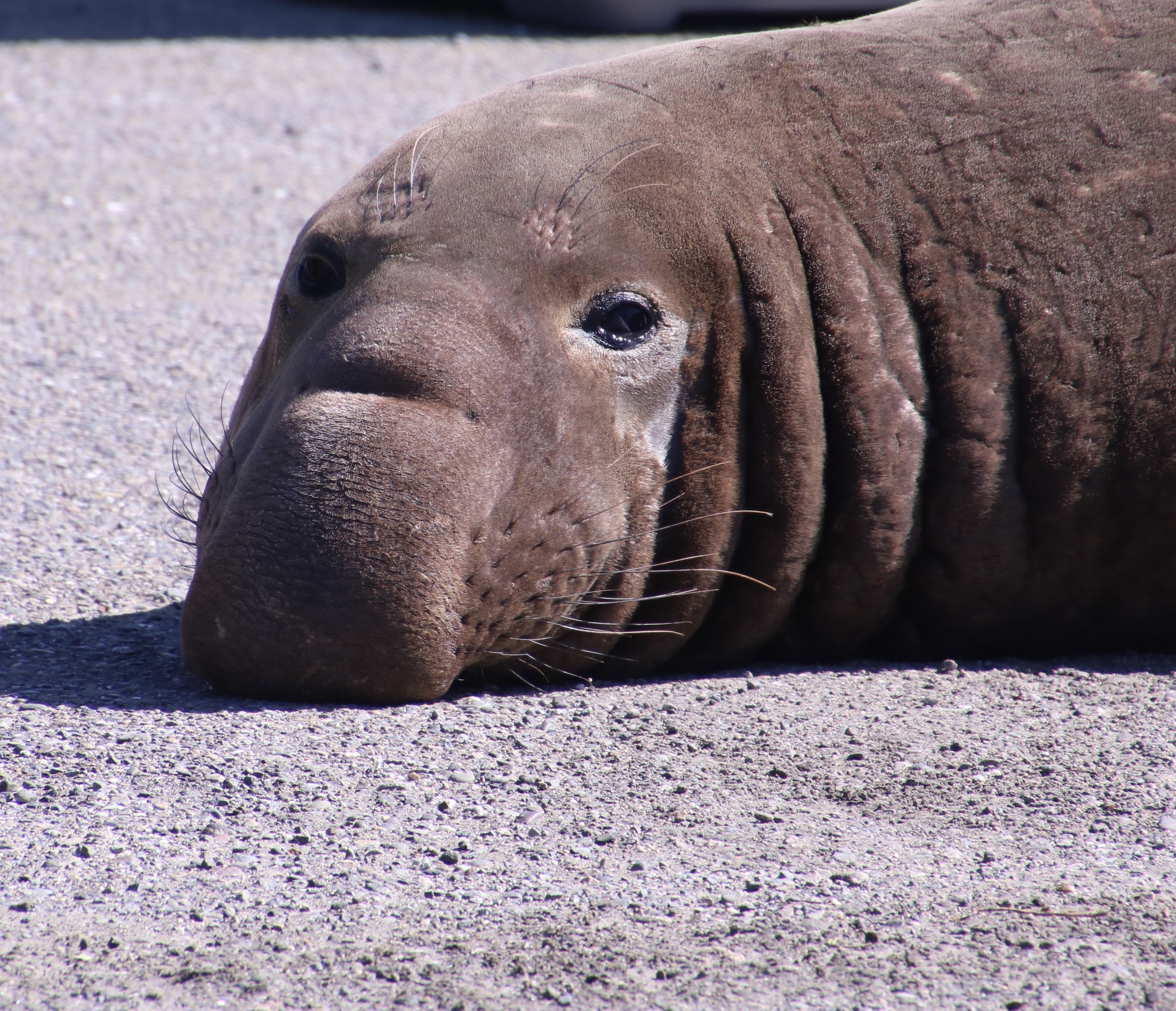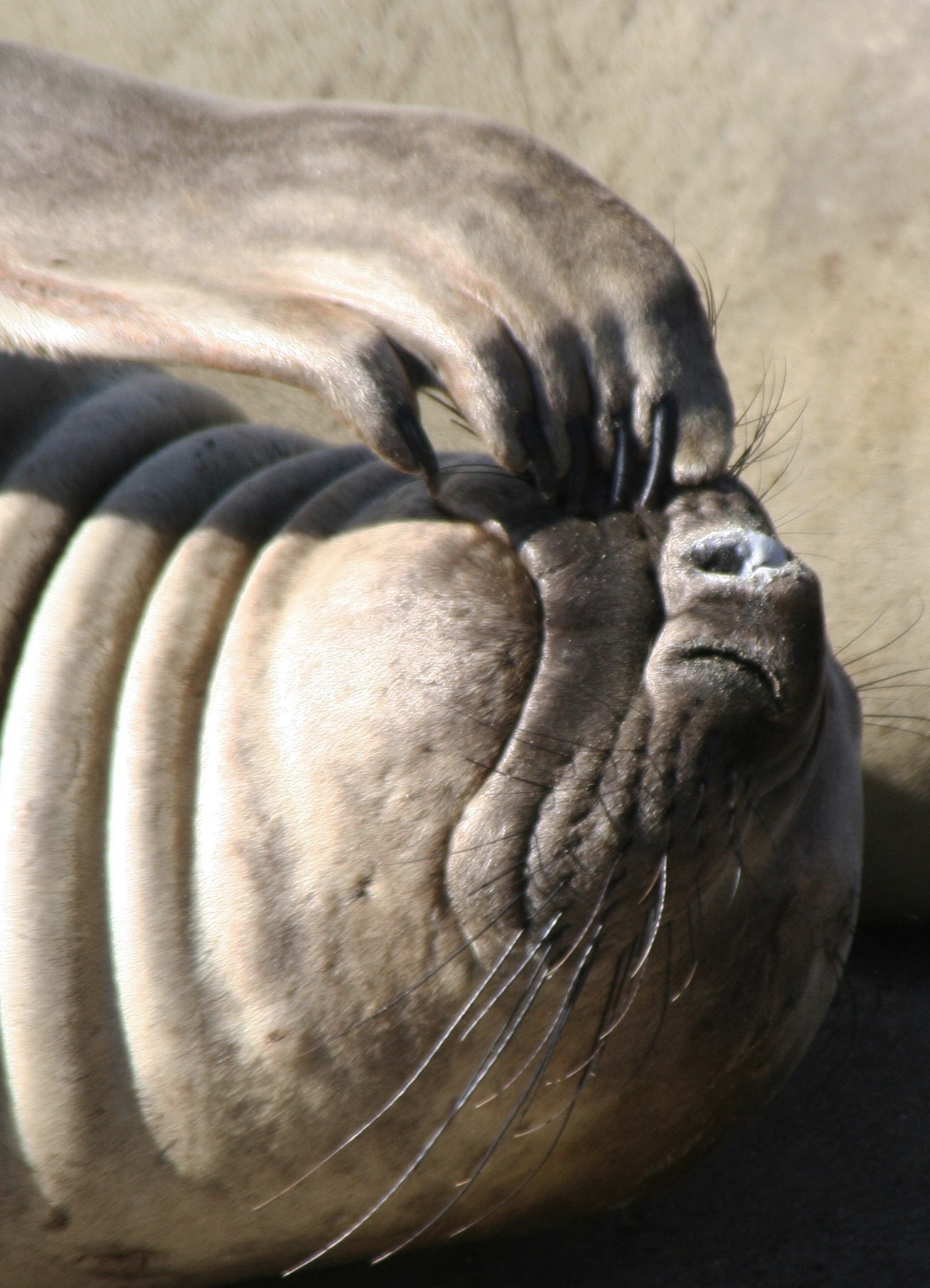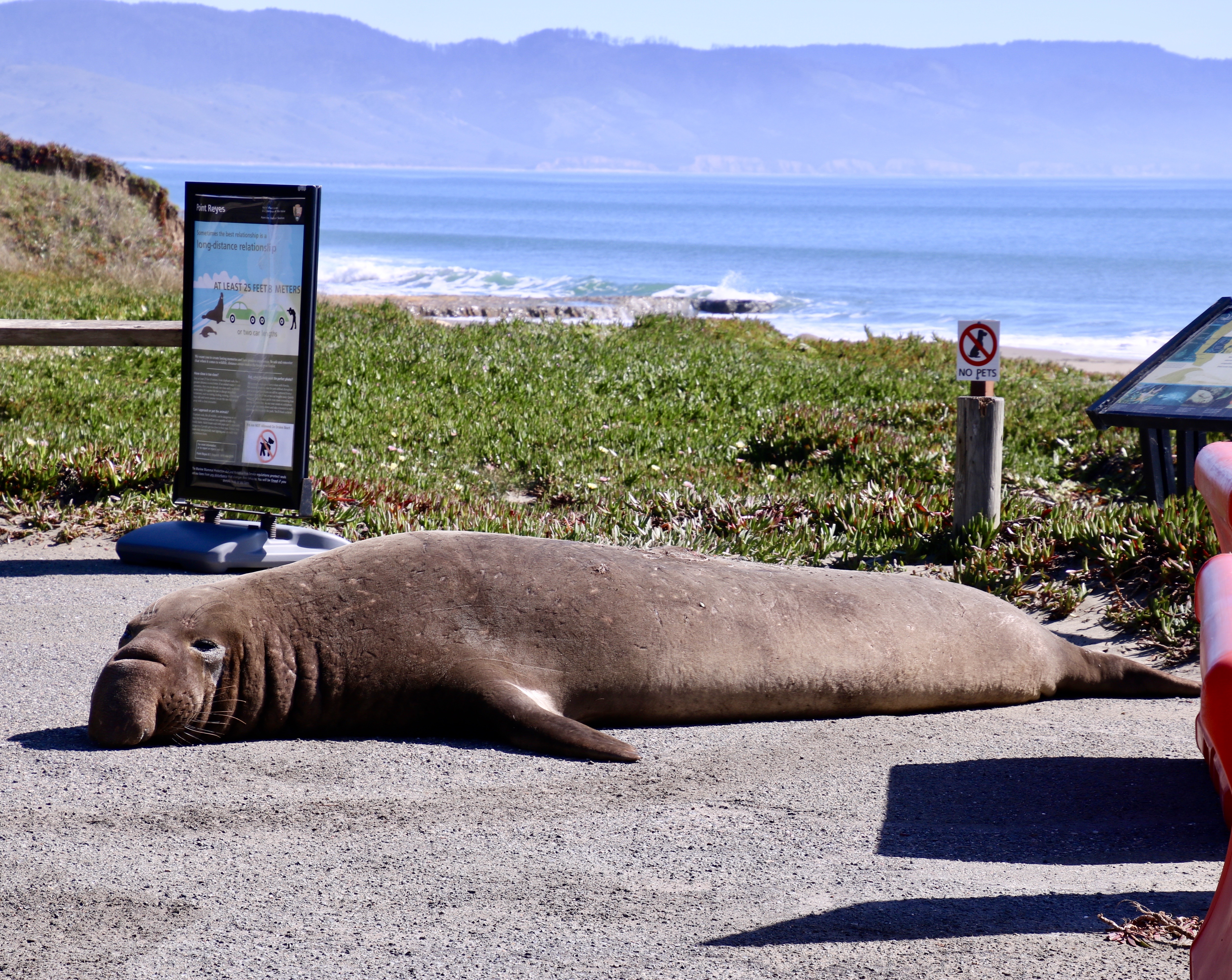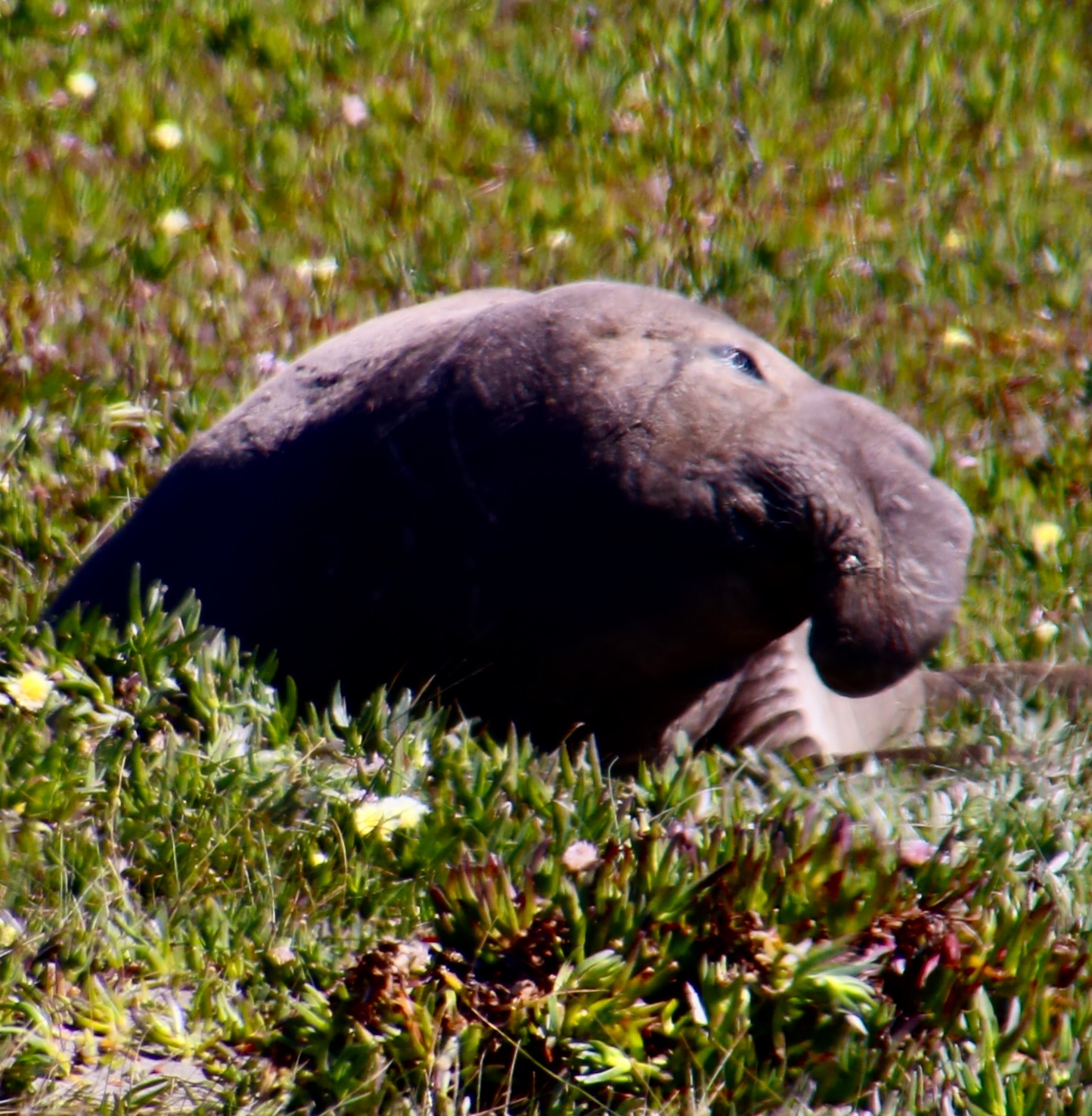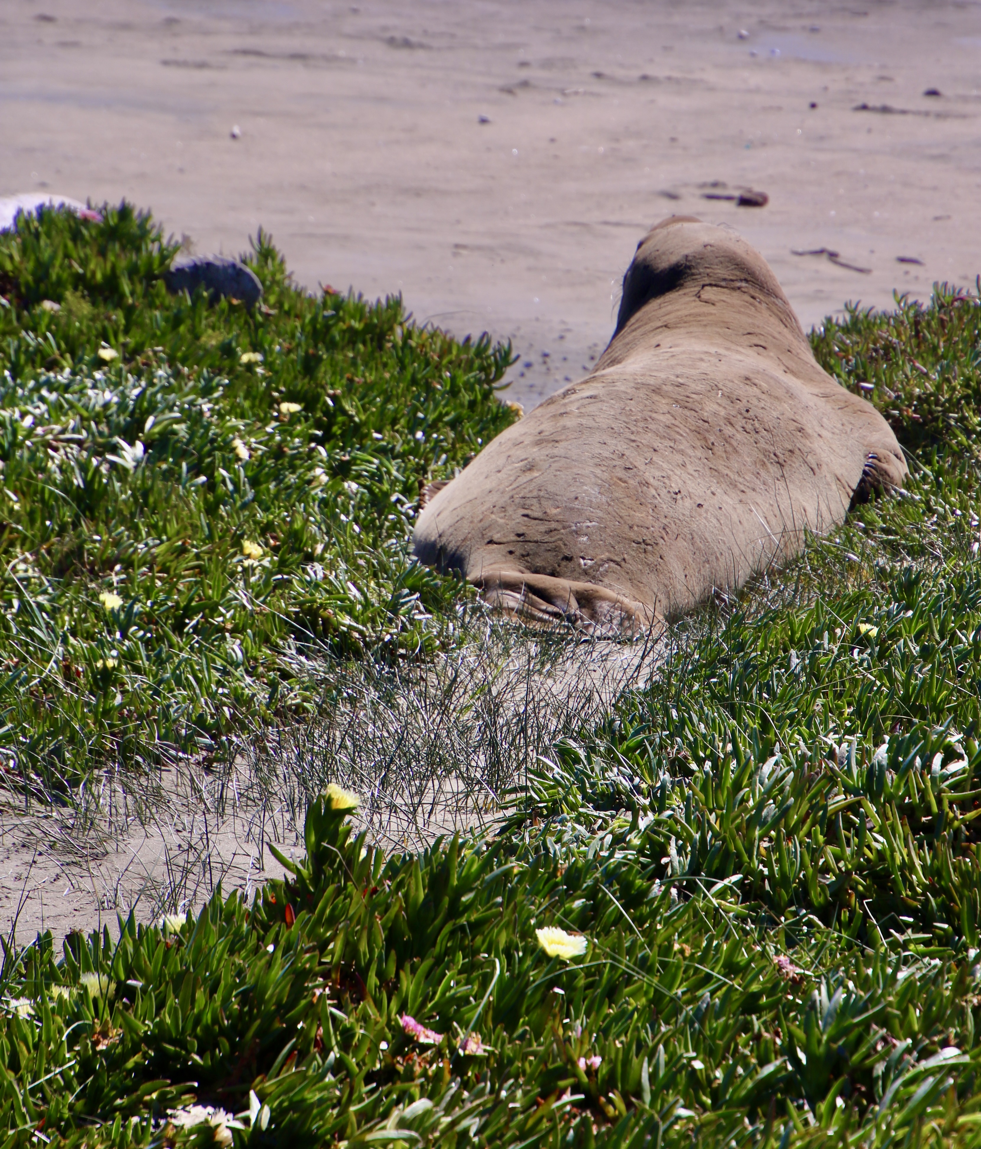 They are uniquely qualified for the dives. For example, while you or I take a deep breath before we dive, elephant seals expel theirs to avoid having their lungs crushed by the tremendous pressure that exists at 1000 plus feet under the sea. Instead, they store extra oxygen in their blood. They have three times as much blood as we do on a per pound basis, i.e. lots, and and their blood is much richer in hemoglobin. They also reduce their heart rate when they dive and focus the majority of their blood on servicing their vital internal organs. Using these evolutionary modifications they are able to dive for 30 plus minutes per time, resurfacing for a short 3 minutes. Elephant seals continue to forage constantly during the migrations between their primary feeding ranges and where they travel to breed, have pups, and molt. It’s a good thing. When they arrive, they fast for the time they are on shore, (2-3 months), living off of the fat they have stored.