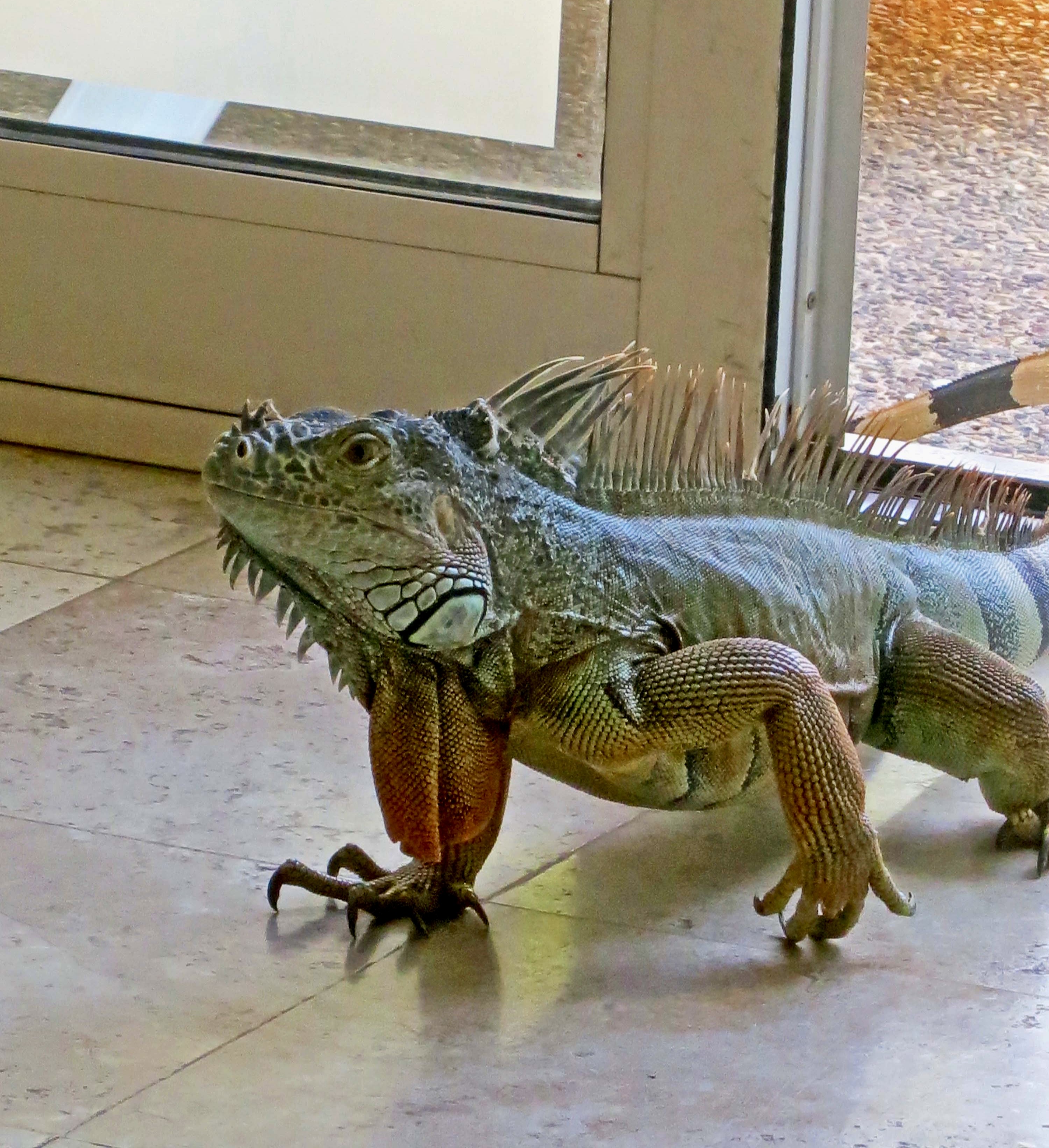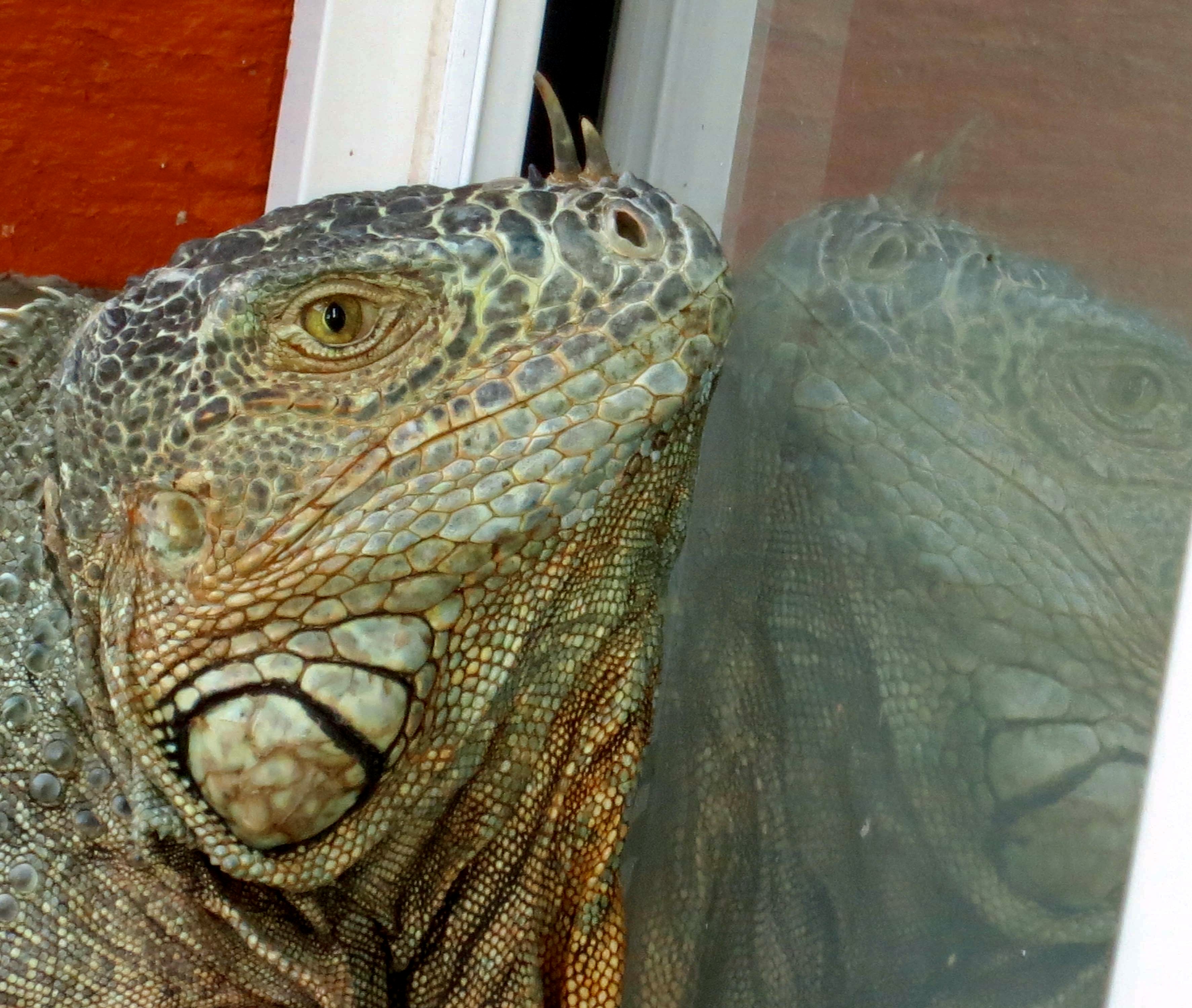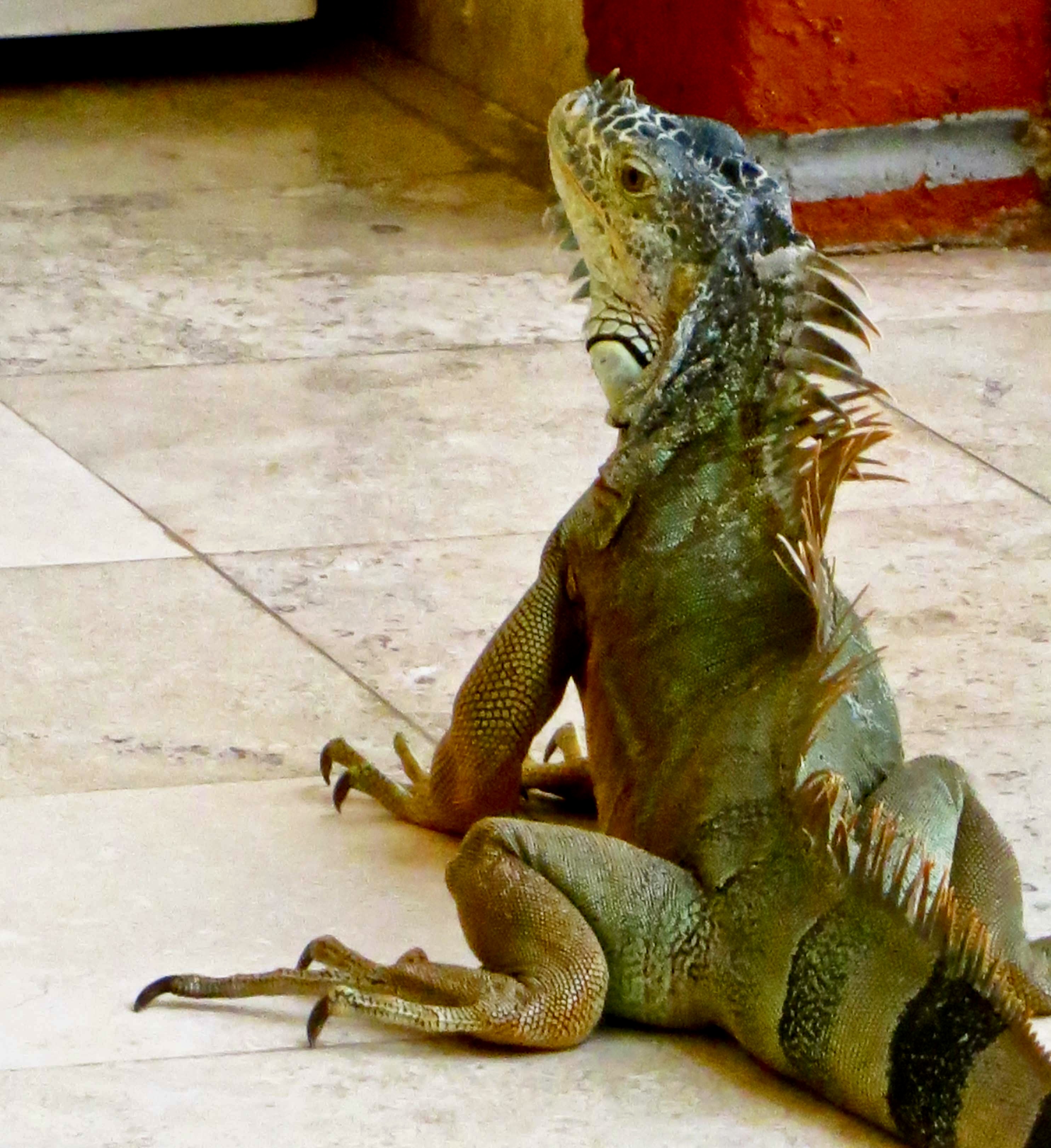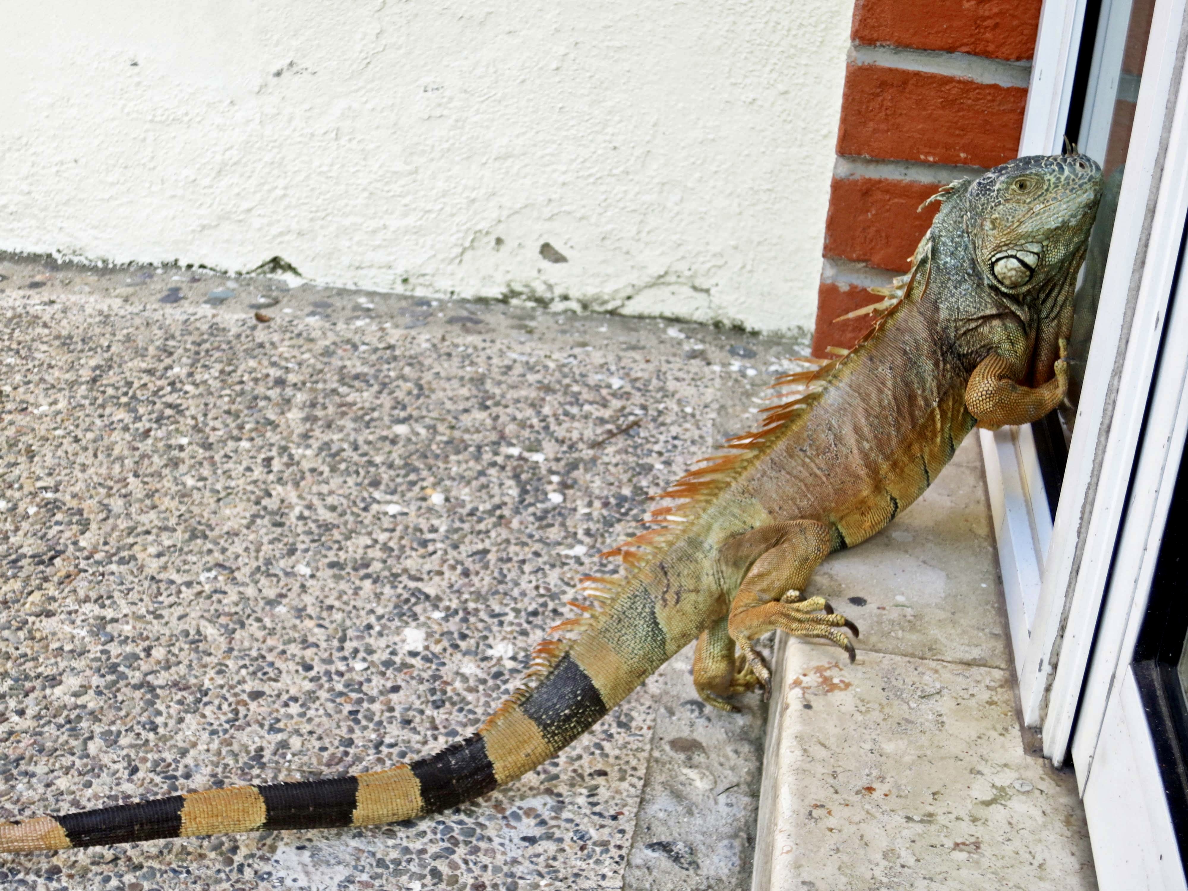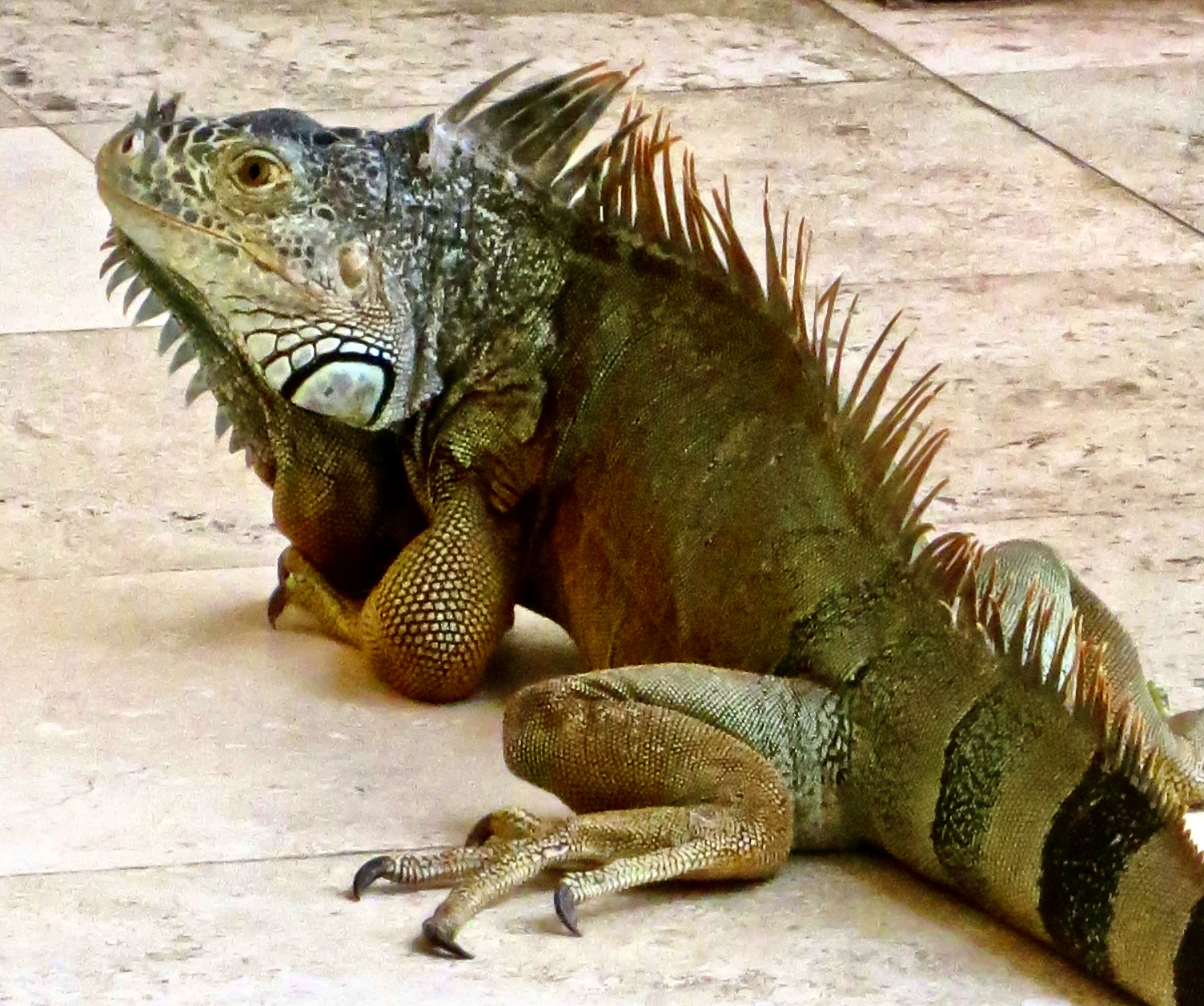A couple of other interesting facts: One, they are great swimmers. They often jump from trees into water when a predator is after them. Two, they can jump from great heights without harm, up to 50 feet. It isn’t always a jump, however. When the temperature drops to 50° F or below, their bodies ‘freeze’ up and they come cashing down. Every once in a while when Florida suffers from a cold spell, headlines warn, “Watch out for falling iguanas.” They aren’t kidding.
