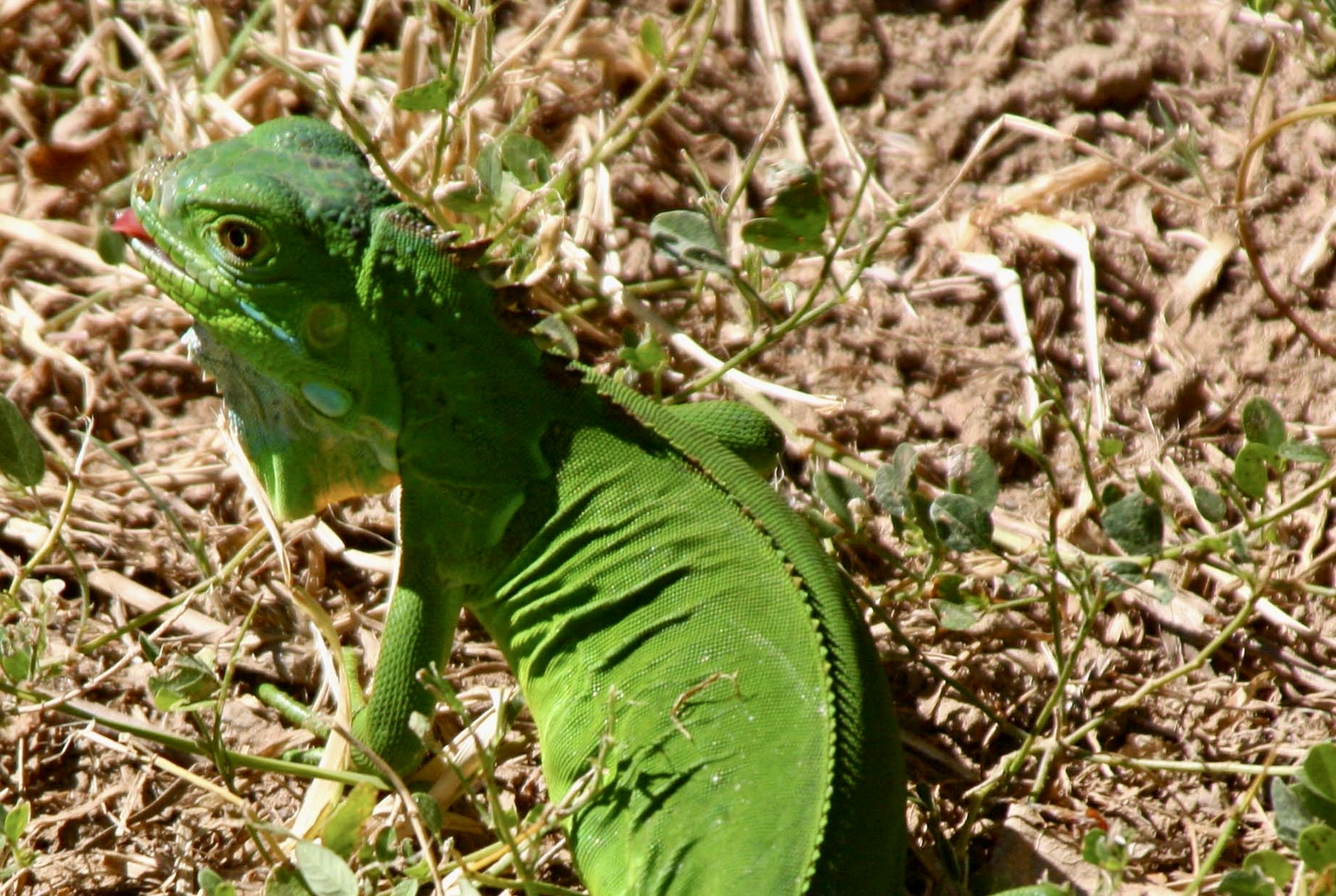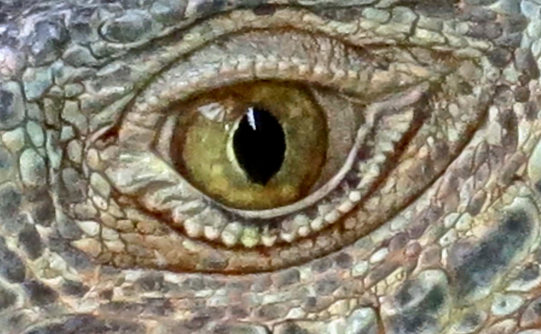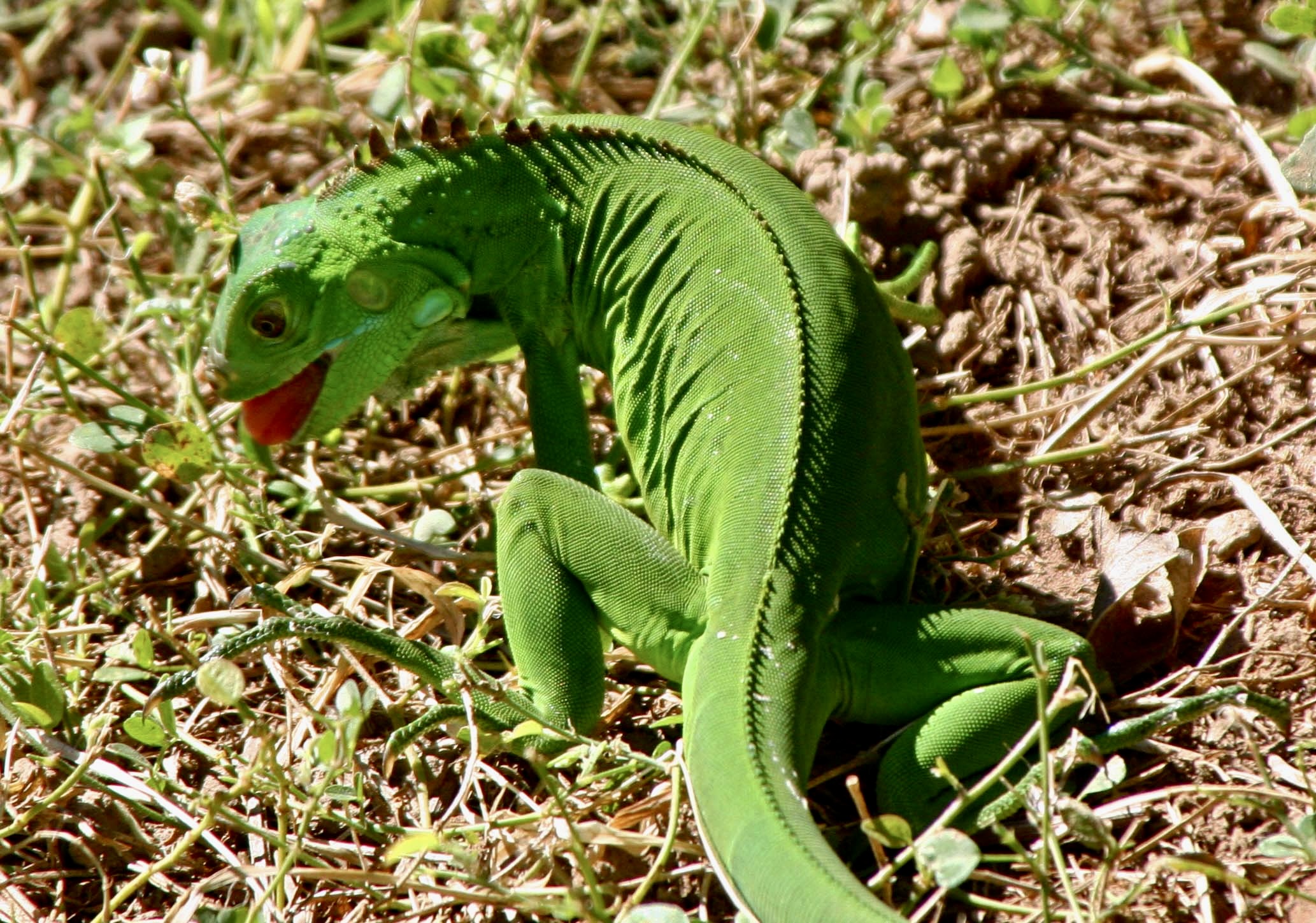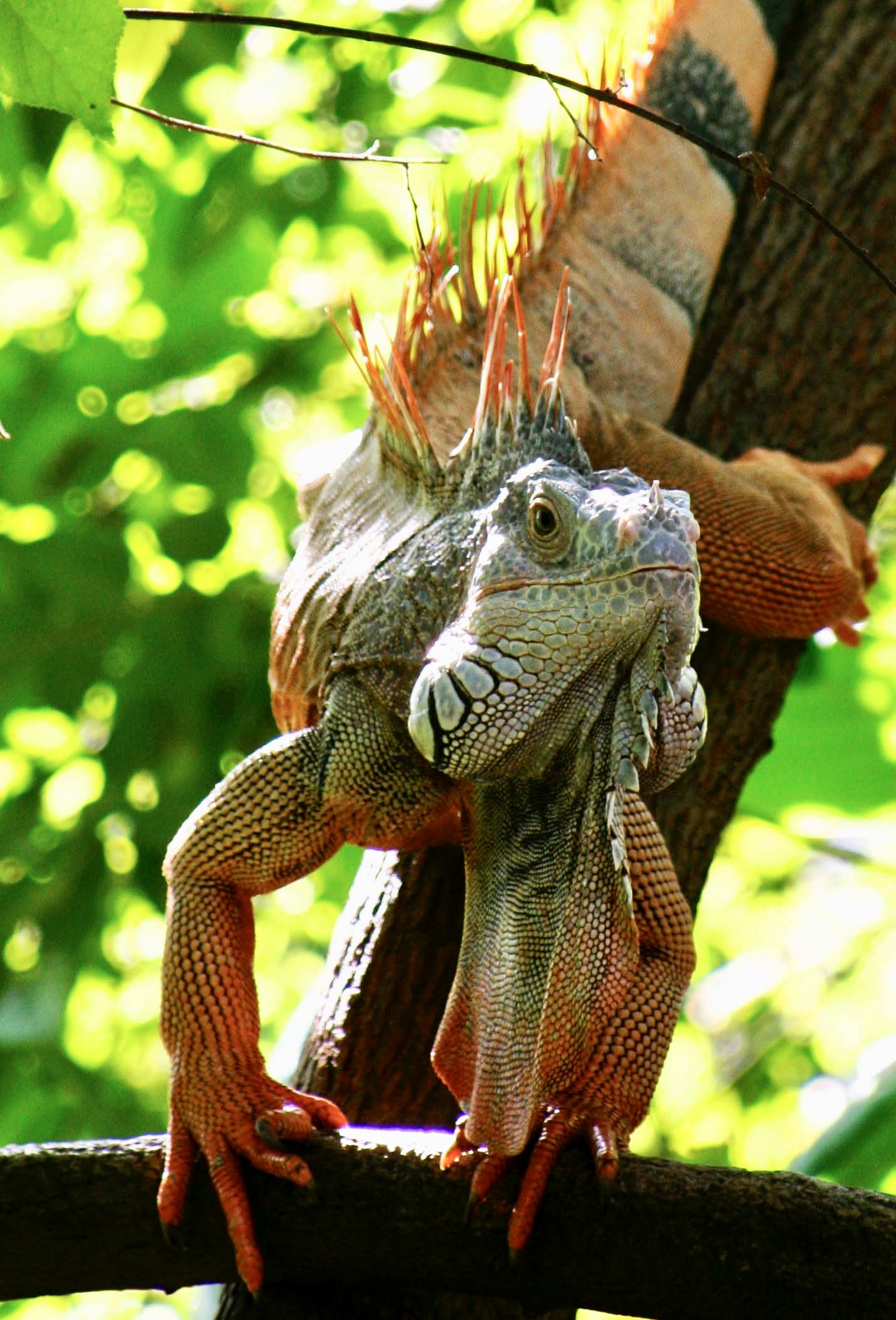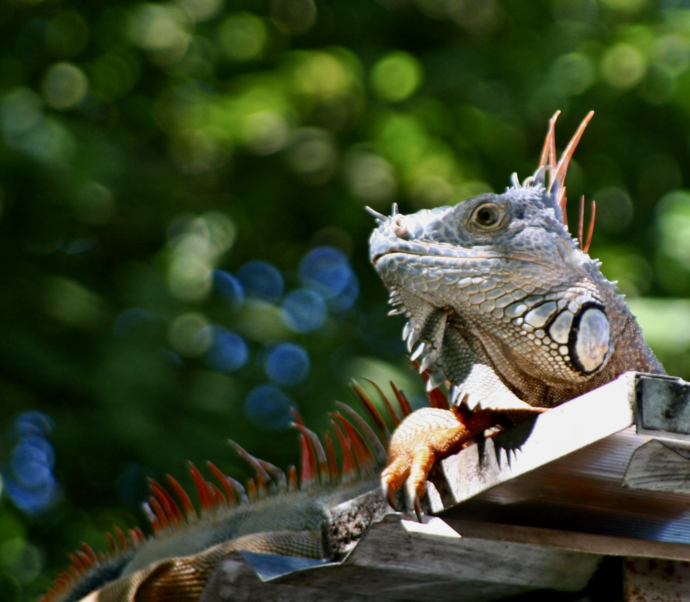 A couple of other interesting facts: One, they are great swimmers. They often jump from trees into water when a predator is after them. Two, they can jump from great heights without harm, up to 50 feet. It isn’t always a jump, however. When the temperature drops to 50° F or below, their bodies ‘freeze’ up and they come cashing down. Every once in a while when Florida suffers from a cold spell, headlines warn, “Watch out for falling iguanas.” They aren’t kidding.