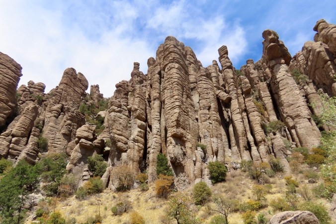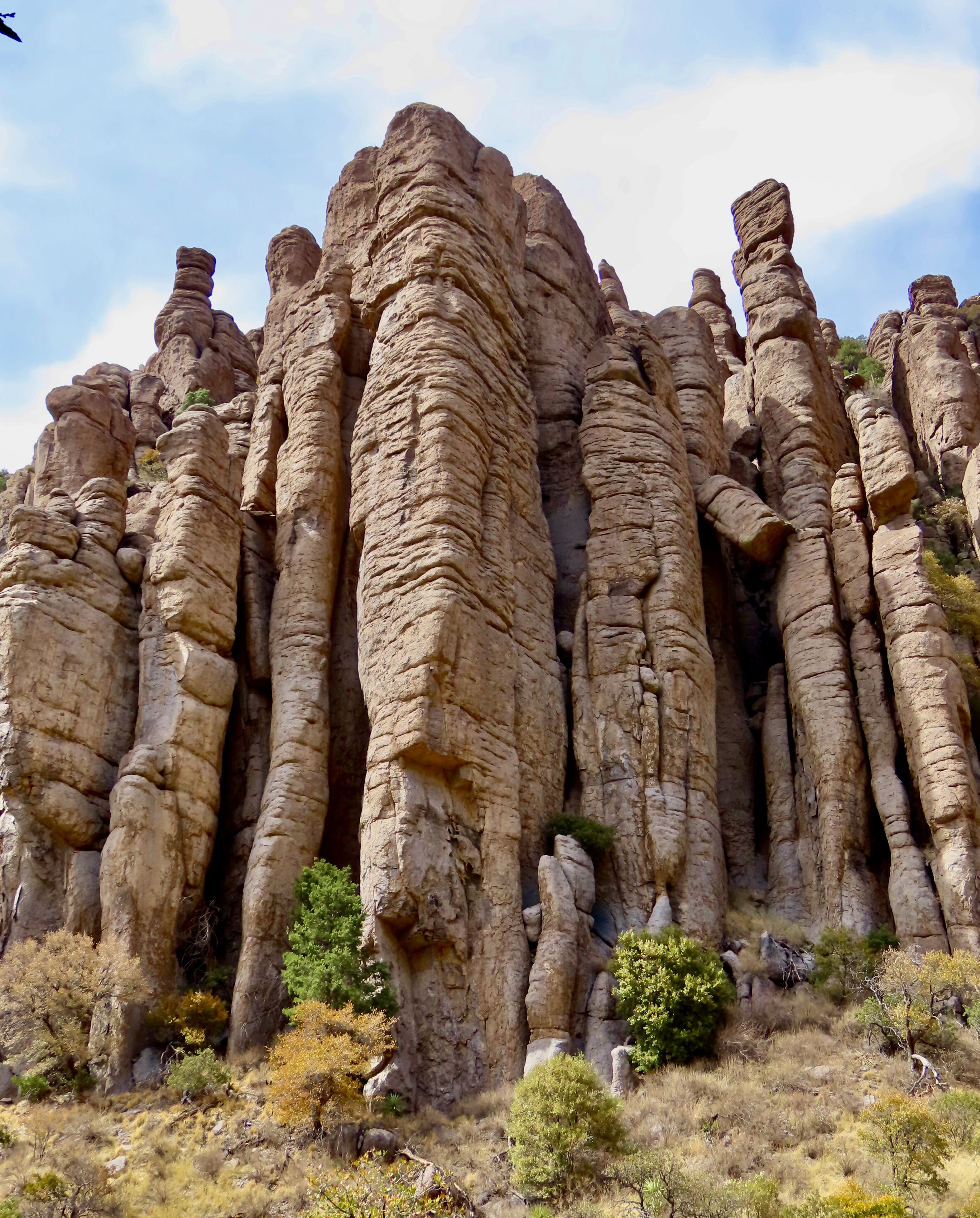 The rock formations got their start when a massive volcanic erupted 26.9 million years ago and buried the area under a combination of hot ash and pumice. Extreme heat then welded the ash and pumice into the rock known as tuff. As the tuff cooled, it contracted, creating cracks and joints. Water seeping into the cracks and then freezing, aided by wind and gravity, caused erosion, eventually creating the thousands of rock columns that Chiricahua National Monument is famous for.