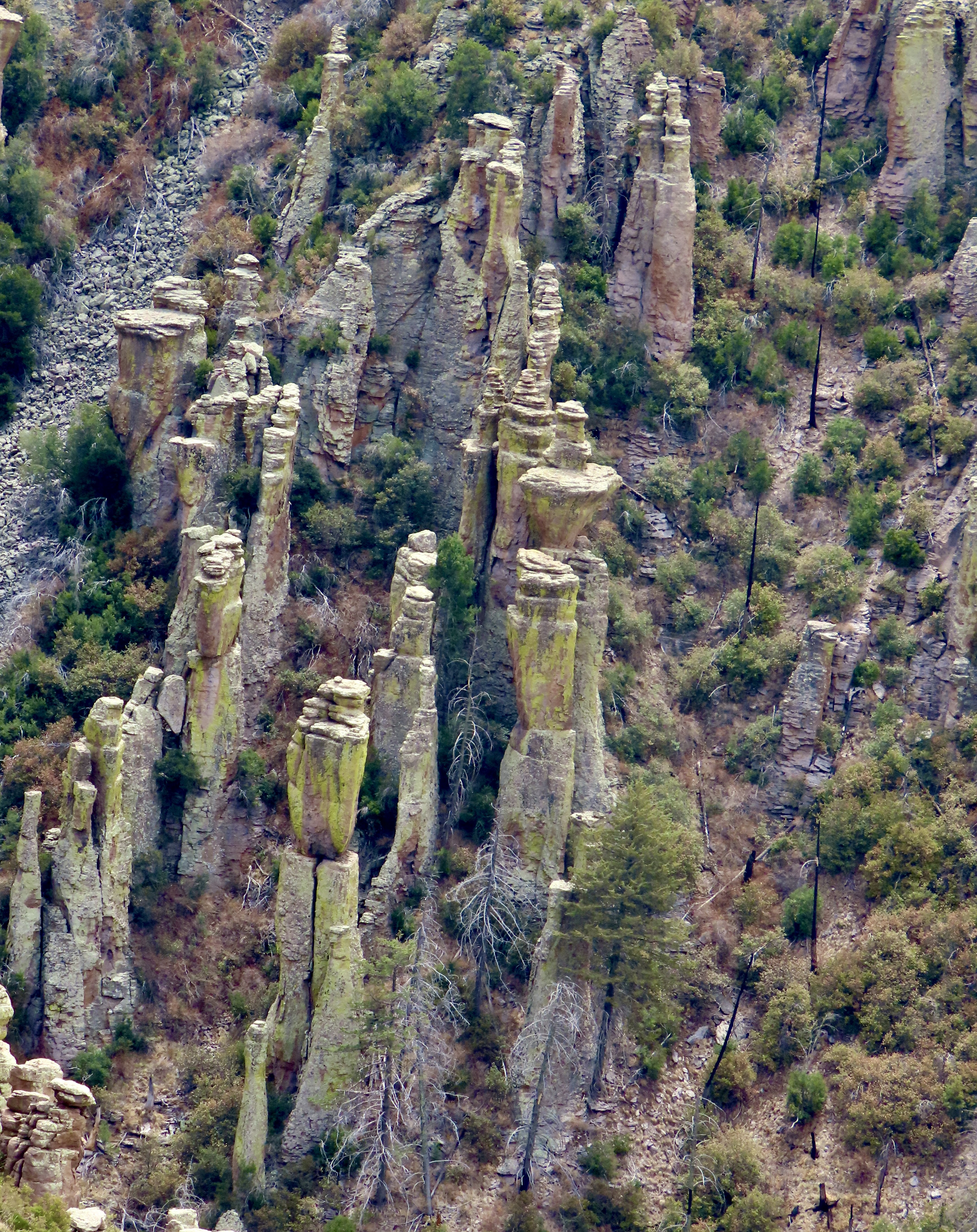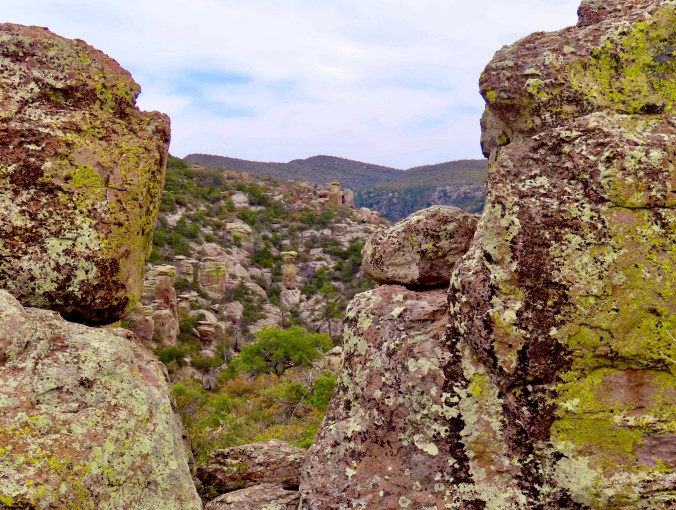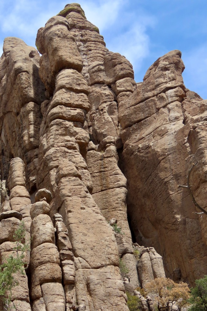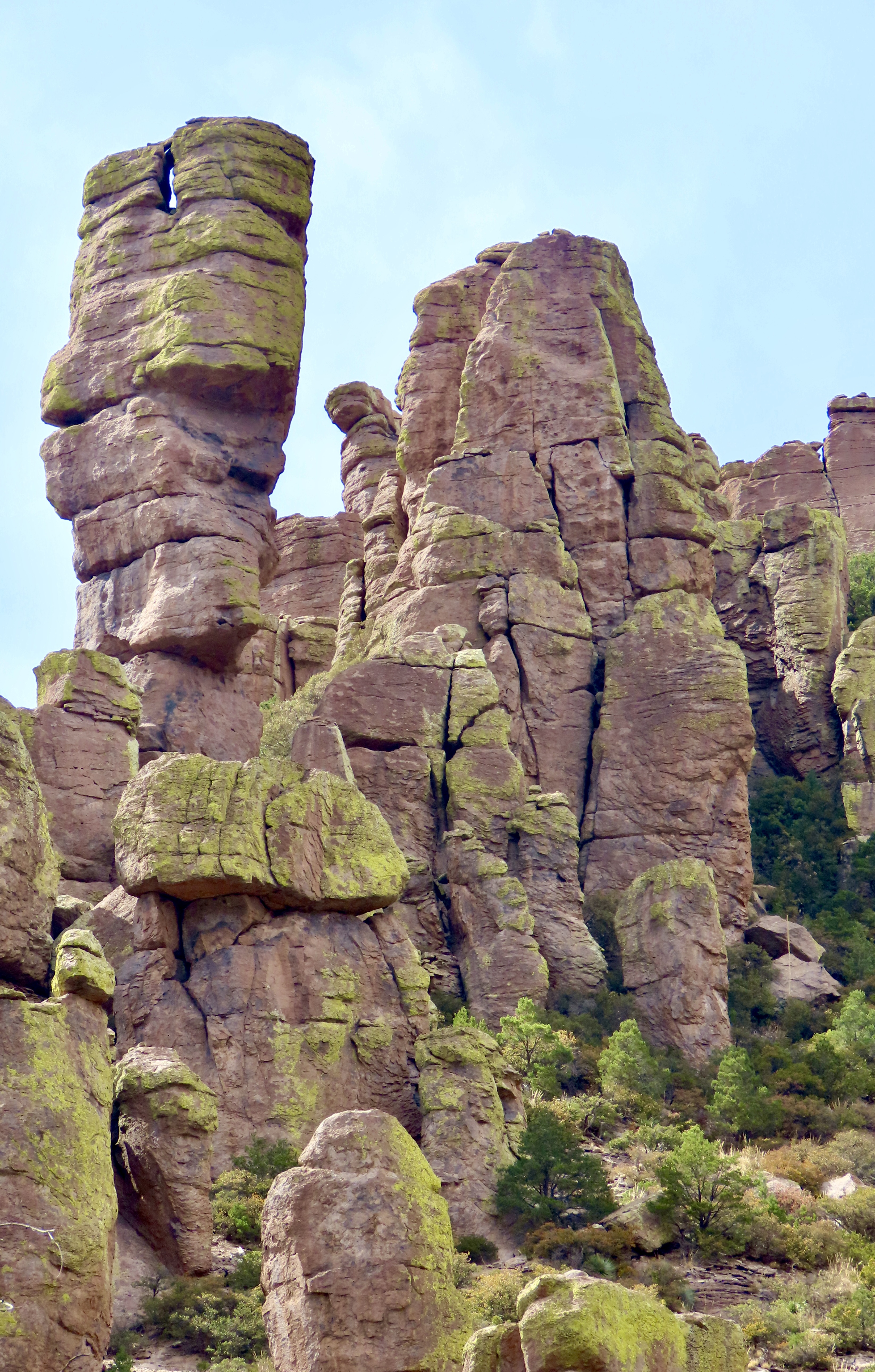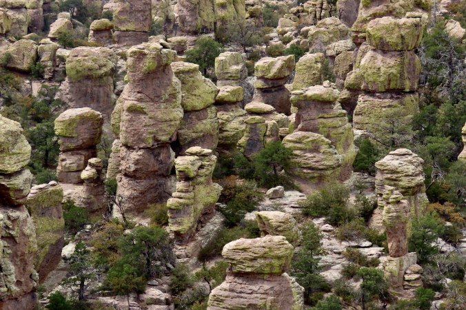 The first place that visitors usually stop at Chiricahua National Monument is the Far Away Ranch, which was built by the Swedish immigrants Emma and Neil Ericson. I think it was Emma who named the ranch Far Away because it was so darned far away from anything else. In addition to the usual challenges that settlers faced, such as irritated Chiricahua, Neil often had to work away from home for long periods to help support the family while Emma oversaw the ranch. Eventually, along with their children, they added a guest ranch to their cattle ranch. The family also became strong supporters of the creation of the National Monument. In addition to the windmill above, the ranch contains a number of buildings that tell the story of early settler life.This lizard was hanging out on the wall of one of them while scrutinizing me. (Or was it smiling?) I complimented the fellow on its camouflage.As we left the ranch and headed for the visitors center, this impressive rock monument came into view.Shortly afterwards we got our first glimpse of the columns we would soon be driving through.This attention-grabbing group of rocks was right across from the visitors center. We went in to check out the center. They are almost always a source of great information. Limited staff may make it difficult to keep them open this summer. A volunteer was busy urging visitors to contact their congressmen and women about the issue.Bonita Canyon Road was our guide into the monument. A campground was located near the entrance. The color of the trees looked like fall, but they were announcing spring.One of our first views of columns along the road was the Organ Pipe Formation towering 75 feet into the air.A closer look provides the view that is usually associated with Chiricahua National Monument. This view shows the joints (up, down and across) that allowed for the creation of the columns. We also found the crooked column interesting.Peggy was quite taken with this column because the top reminded her of a dog (eyes, ears and nose).Numerous other rocks caught our attention as we drove through the canyon including this balanced rock. Peggy thought this pair of large rocks looked like they were kissing. The green color, BTW, is created by lichen.A photo of the crustose lichen we found growing on the rocks.I was impressed with this formation along Bonita Canyon Road— and the lichen.At the end of Bonita Canyon the road made a right turn and began a steep climb up to Echo Canyon and Masai Point. We headed up to Masai Point first and were treated to the view of tall, skinny, capped-off columns.They seemed to be marching up the hill. A much different view was provided just up the trail…Short, stubby columns.Hundreds, maybe even thousands of them.They provided a view across Sulpher Springs Valley and the Distant Dragoon Mountains where Cochise had his stronghold.About a half mile down the road from Masai Point, the Echo Canyon Trail provided us with more scenic views and impressive rocks.A rock that looked bird like…A rock family.Two rocks from the same stone.And another balanced rock.We never would have guessed that Chiricahua National Monument held such treasures. But that is the story of America’s national parks, monuments and wilderness areas over and over and over. Next up, we will take you to Saguaro National Park where the giant cacti were just coming into bloom last week.