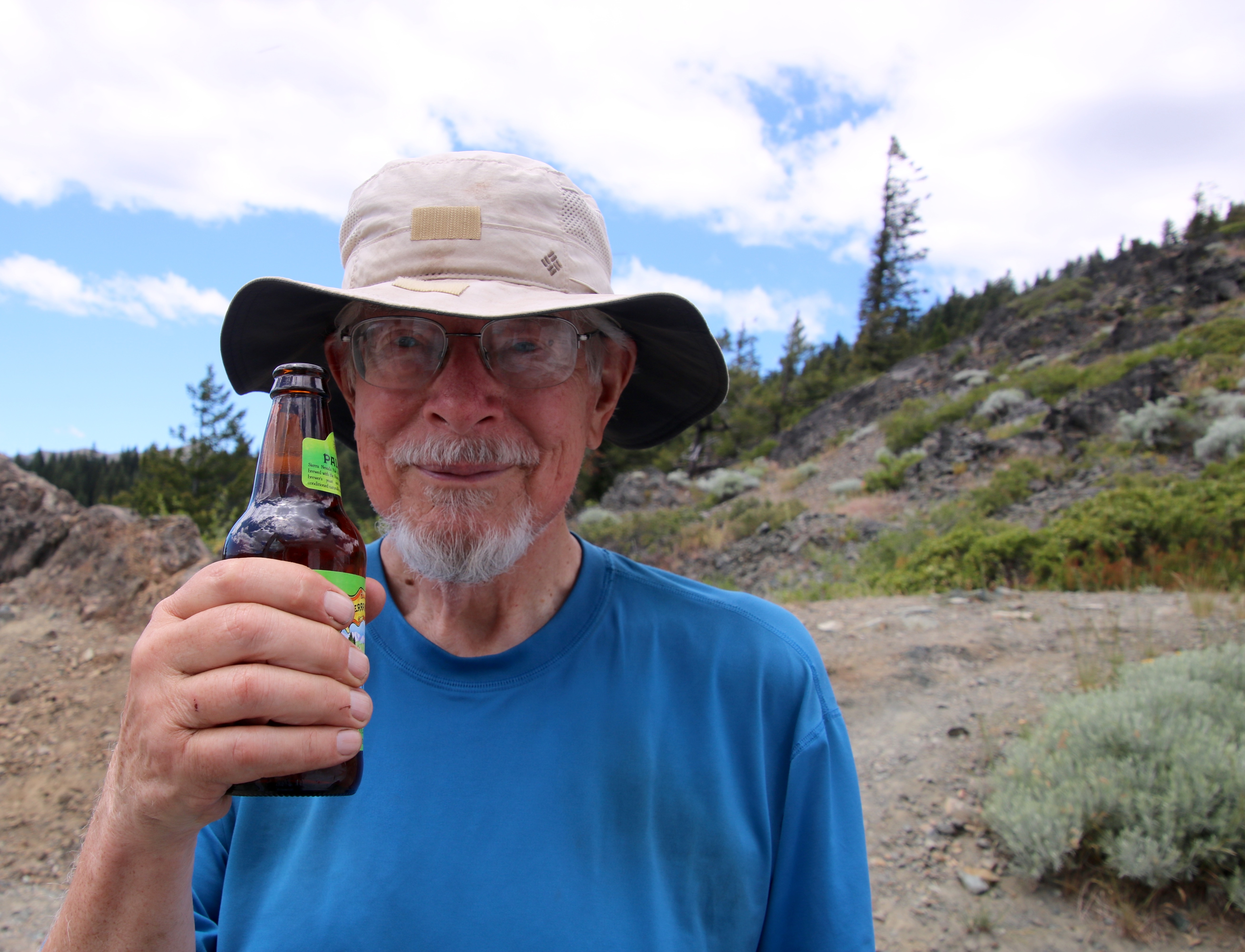 Just before my solo trip through the Marble Mountains, Peggy and I had concluded a 60 mile section of the PCT from Mt. Ashland in Southern Oregon to Seiad Valley in Northern California. Naturally, we had to reward ourselves. Cold beer was part of it. And no, I didn’t drink the other five! Just two. Our travel van is behind us. We had parked it in Seiad a few days earlier. Peggy would take over driving it from here as my backup ‘trail angel’ and meet me once a week for resupply and a break.Eating was another reward. The Seiad Cafe welcomed through hikers with its ‘Infamous Seiad Pancake Challenge.’There’s this thing about long distance hiking, you get hungry. Think about burning 5000 calories a day and taking in around 1500. There’s a deficit. By the end of my 750 mile trip, I resembled an escapee from a concentration camp. Each time I completed a section of the trail I stuffed myself. I had permission. I felt entitled. And manners? Grin. I was goofing around here. The actual pancake that the Seiad Cafe offers as its challenge is umpteen sizes bigger than the one I am chowing down on. Eat the whole thing and it’s free.A little hallucination can be expected when you are out on the trail for weeks or months. Especially if you are hiking by yourself. This handsome fellow was hanging out in the small Seiad Store where we bought the beer. That’s when I decided that a six pack was called for.Peggy drove me up the six miles to Grider Creek camp from Seiad. It was ‘cheating’ in PCT lingo, where every foot of the 2, 650 mile journey is supposed to be walked, even if it’s walking down a paved or dirt road. Through-hikers take that seriously. Admittedly, I was under pressure to reach my goal of backpacking 750 miles for my 75th birthday, but, truth be told, my trip was primarily an excuse to be out in the woods. This was the first section of the trail I would be hiking alone. Peggy was a bit nervous, as were our kids. Me? Not so much. I had done lots of solo trips over the years. Still, at 75… Okay, I was a little nervous.I started out slowly.