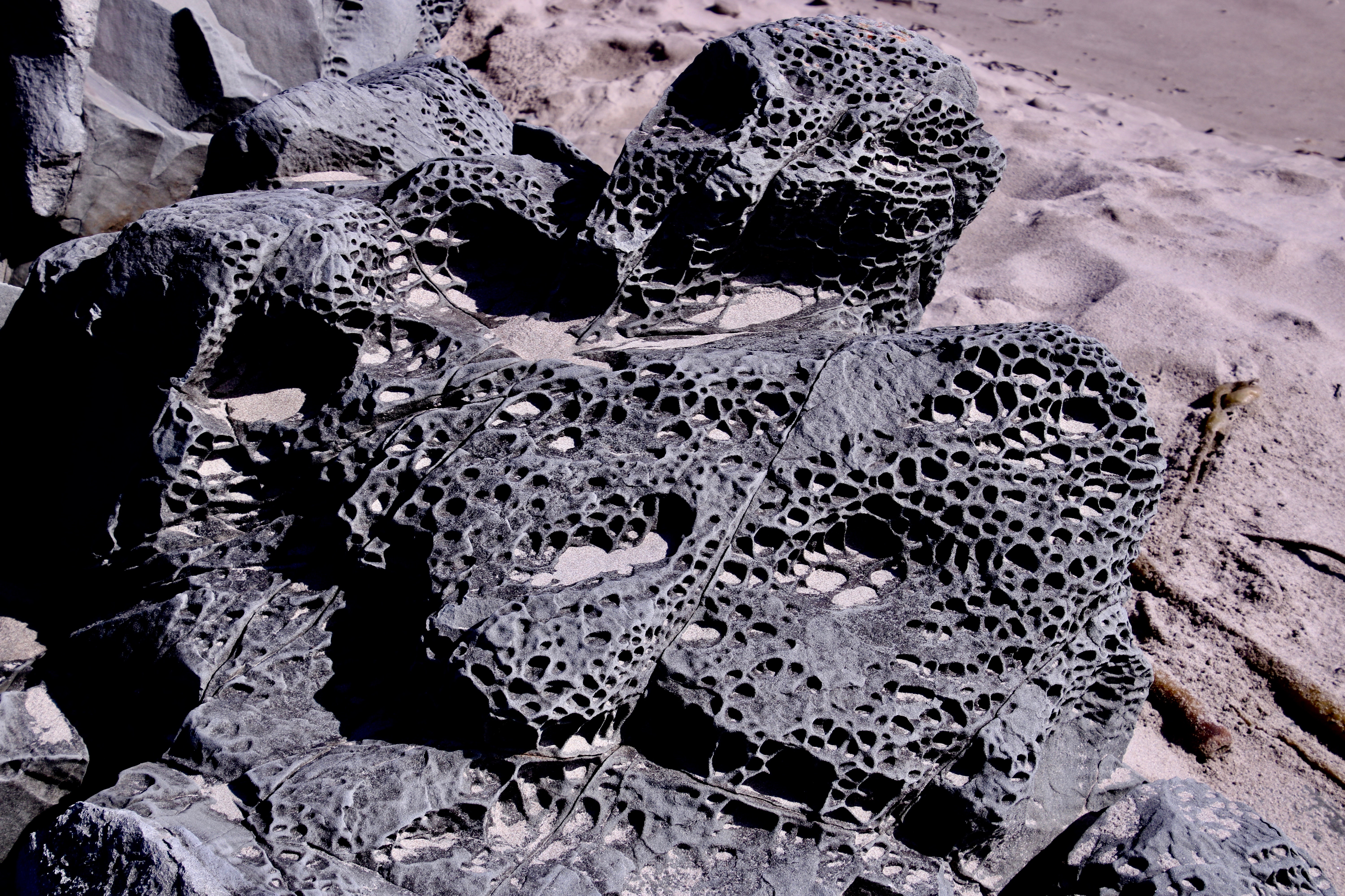 And finally, I would like to feature a strange, non-tectonic feature of Sunset Bay: concretions. Peggy and I first came across these round, rock-like structures on the southern coast of the South Island of New Zealand. They are created when groundwater triggers extra amounts of ‘cement’ around irregularities in the rock such as shells, creating a round structure that continues to grow as more cement is added. The hardness of the covering makes it harder to erode than the surrounding rock.