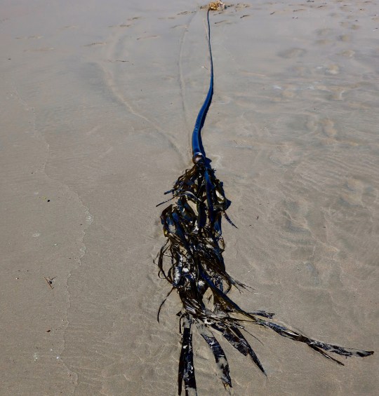 Piles of kelp and other sea treasures had been ripped away from their firm attachments to rocks by the stormy seas the day before and were left behind on the beach.