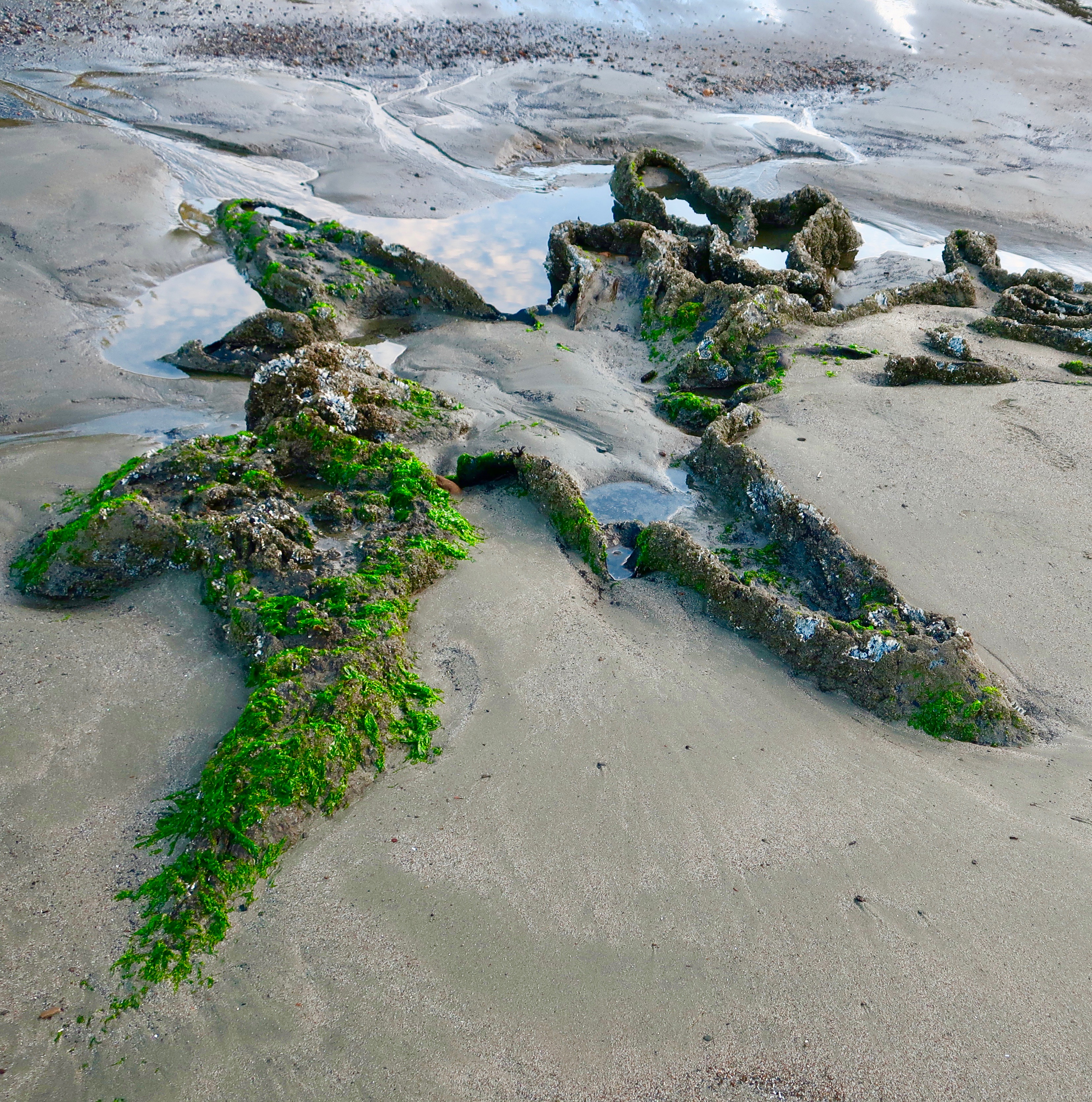 Faults, fractures in the earth’s surface along which the blocks of crust move relative to one another can be seen among the tilted and layered rocks of the Bay at low tide. The rocks, BTW, also provide an excellent area for tide pools that feature sea life loved by kids and adults alike.