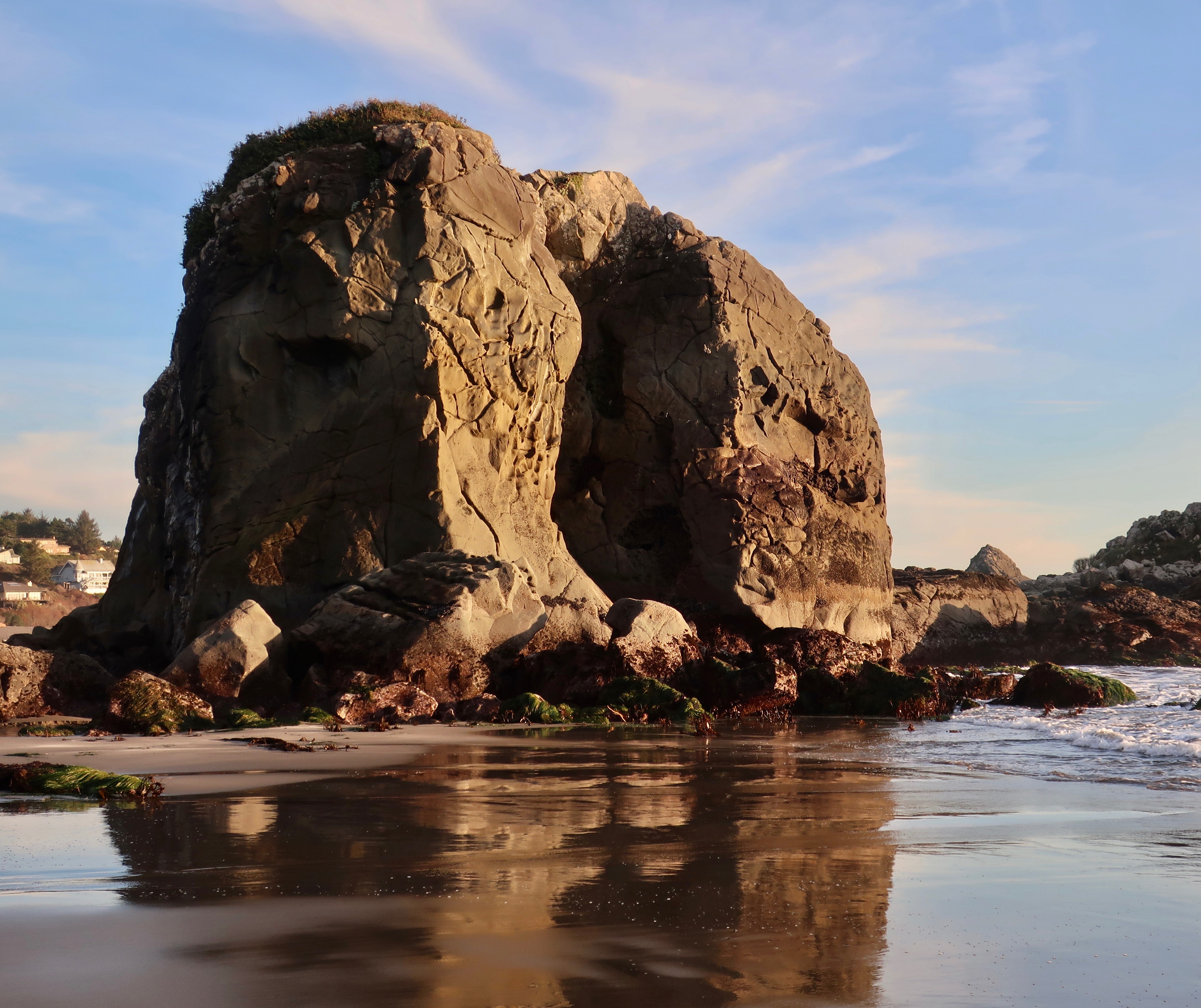 The large sea stack just off the coast from Devil’s Kitchen is known as Haystack Rock.Peggy discovered that a cave ran all the way through the massive rock and allowed the ocean to flow through. It is one of many such caves in the rocks off the coast of Bandon. (Photo by Peggy Mekemson.)I took a close up. At a really low tide, you could probably walk through to the other side.One thing, we had no problem social distancing on the beach at Devil’s Kitchen, as Peggy demonstrates. We were still carrying our masks, however.It had been storming the day before and waves were still crashing ashore.Some very impressive homes had been built on the cliffs above the beach. I figured this house could easily accommodate a large family with a dozen kids, or maybe 20. I’m a small-house type of person but with a dozen kids, I would definitely want this one!And another oneI was even more impressed by the rock in front of the house. I’d almost feel safe in case of a Tsunami. This section of the coast is threatened by a giant one as the Juan De Fuca Oceanic Plate continues it dive under the North American Continental Plate and threatens a massive earthquake. The last really big one with a rating of over 9 on the Richter scale was in 1700 and they are known to occur every 300-500 years. It could be a hundred years from now. Or tomorrow. I’d blame the Devil.This driftwood fort was not quite as fancy as the houses but a heck of a lot less expensive. A mom and three kids were playing in it. “Can I take a photo?” Peggy asked. The answer was, “Of course.” You can barely see the family. (Photo by Peggy Mekemson.)I found this driftwood fort just around the corner. It had been decorated with rocks and kelp.It was built at the base of an impressive rock.While on the subject of driftwood, I though this piece set off by ocean grass was rather attractive.