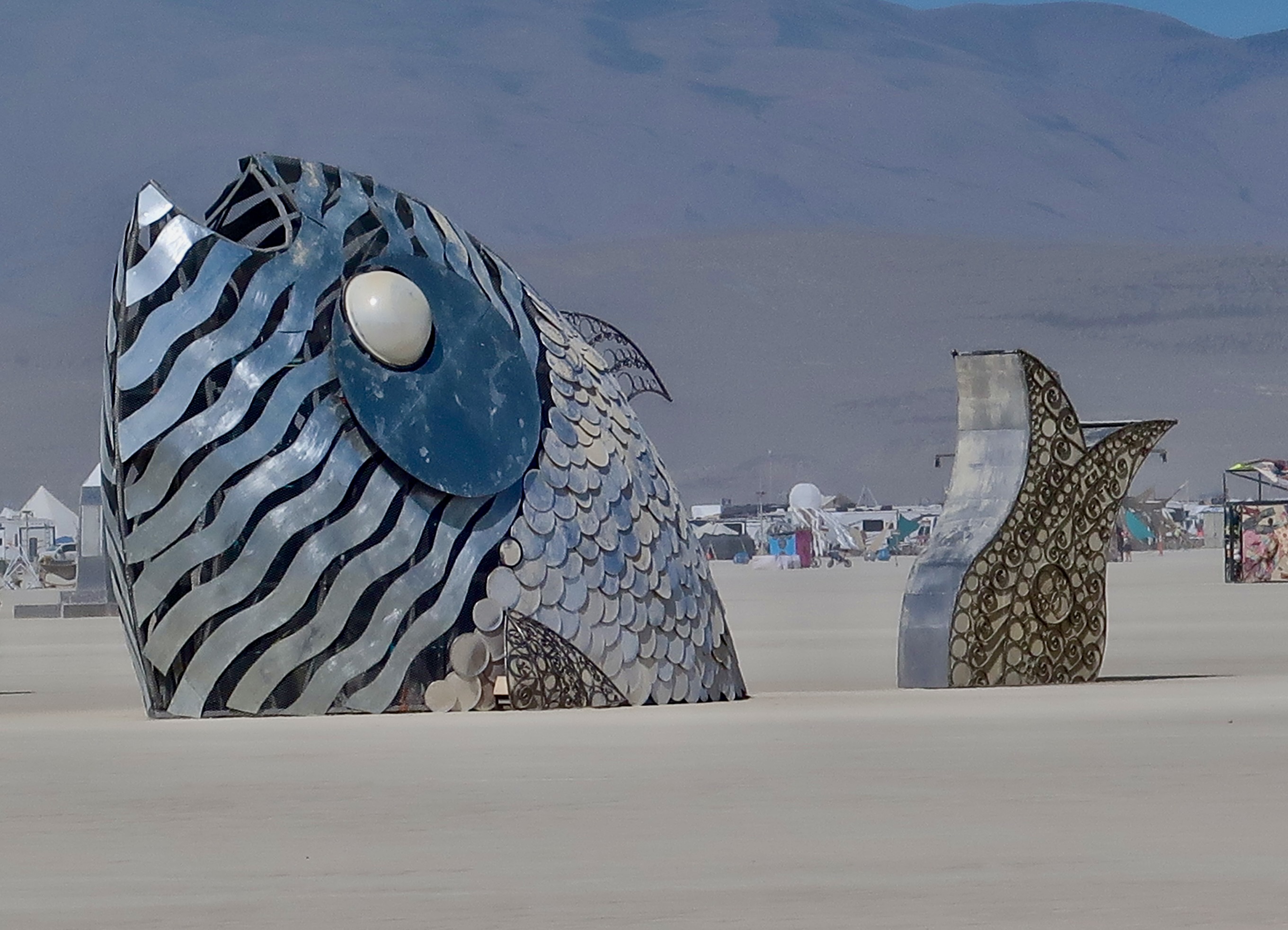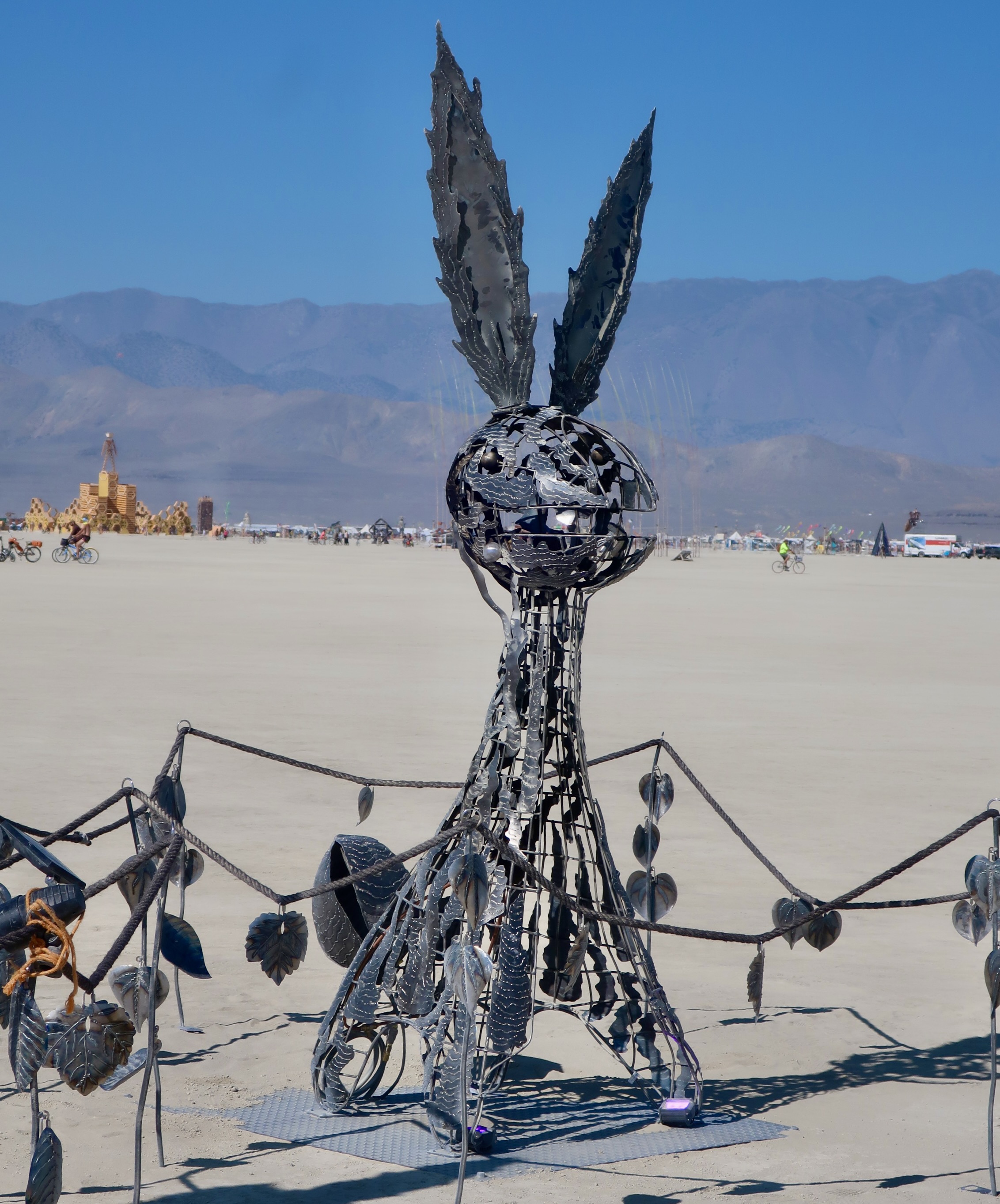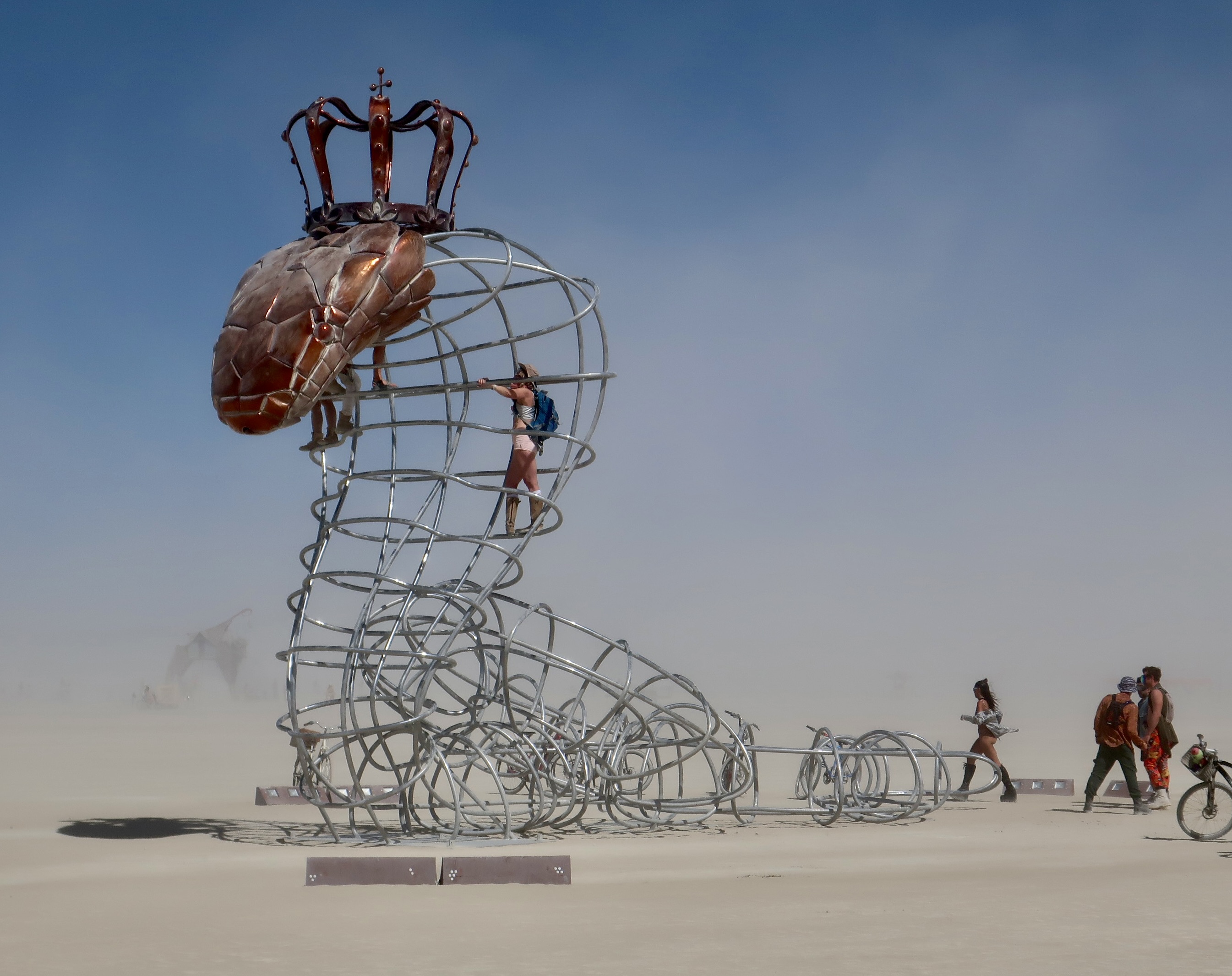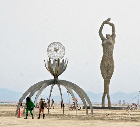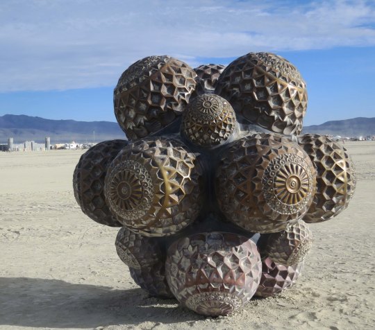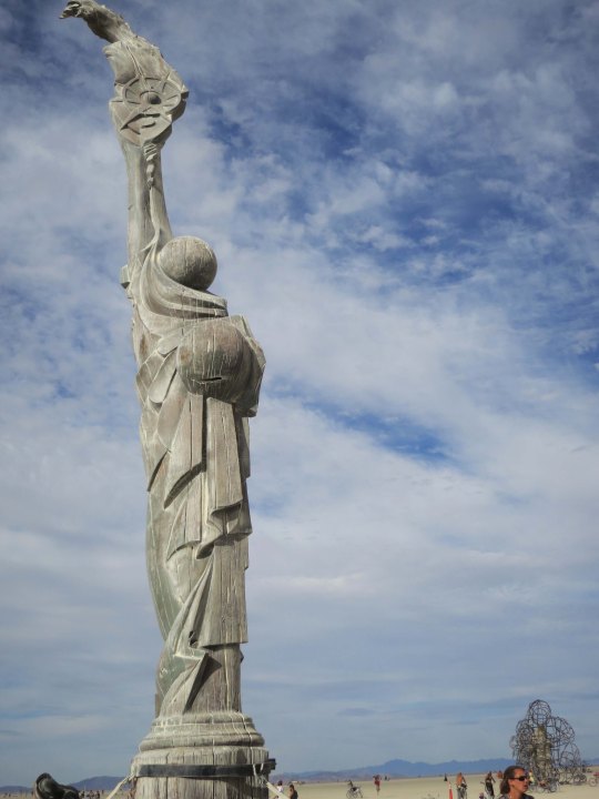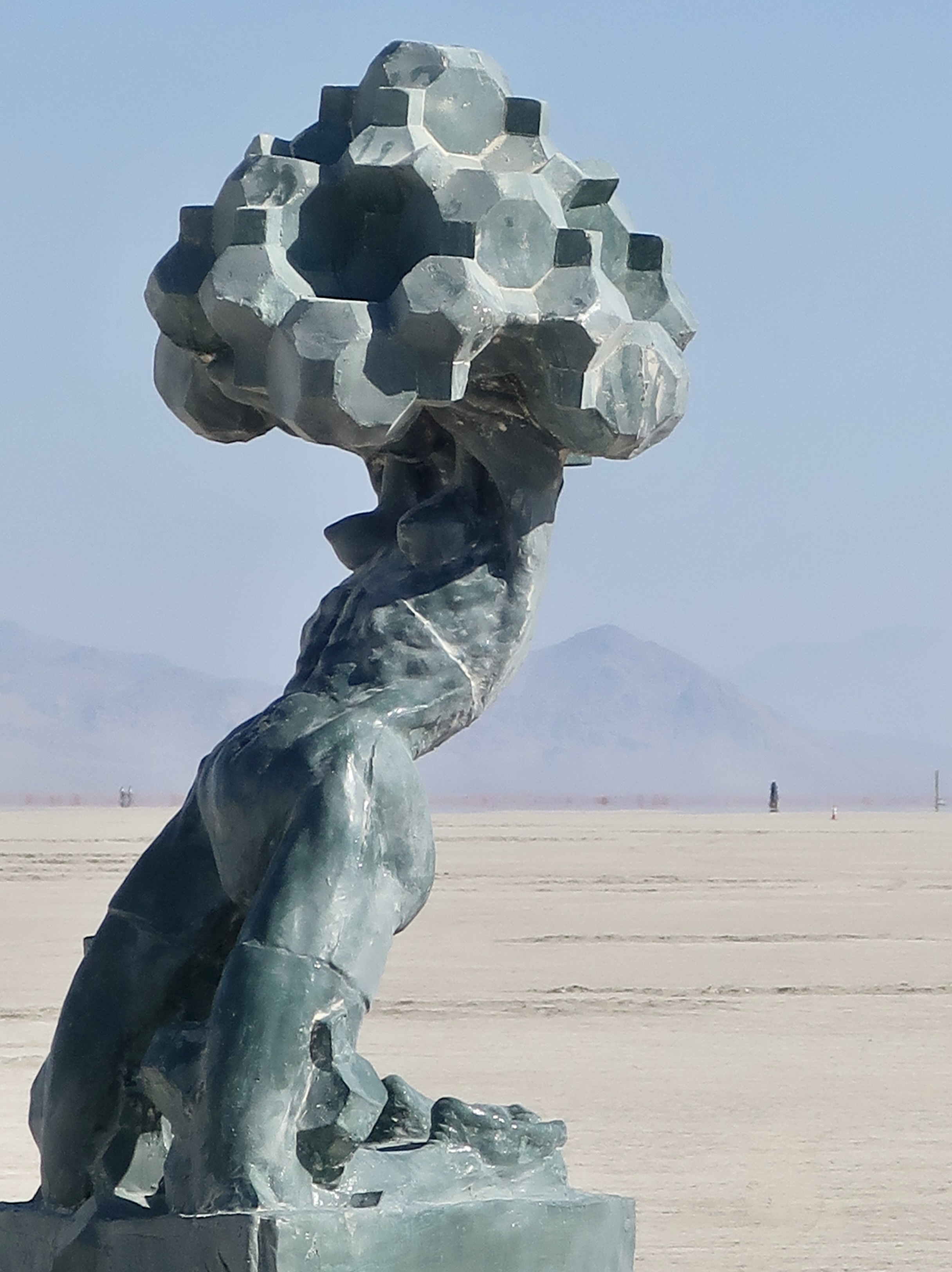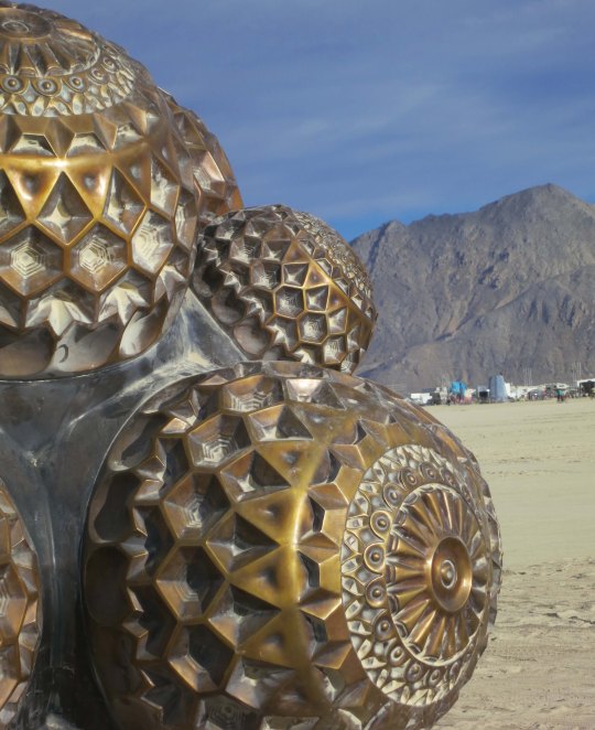 While partying, music and a unique culture draw thousands to Burning Man each year, it is the art such as this brass sculpture and the giant woman in the background that pull me back to the event year after year.