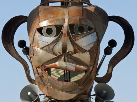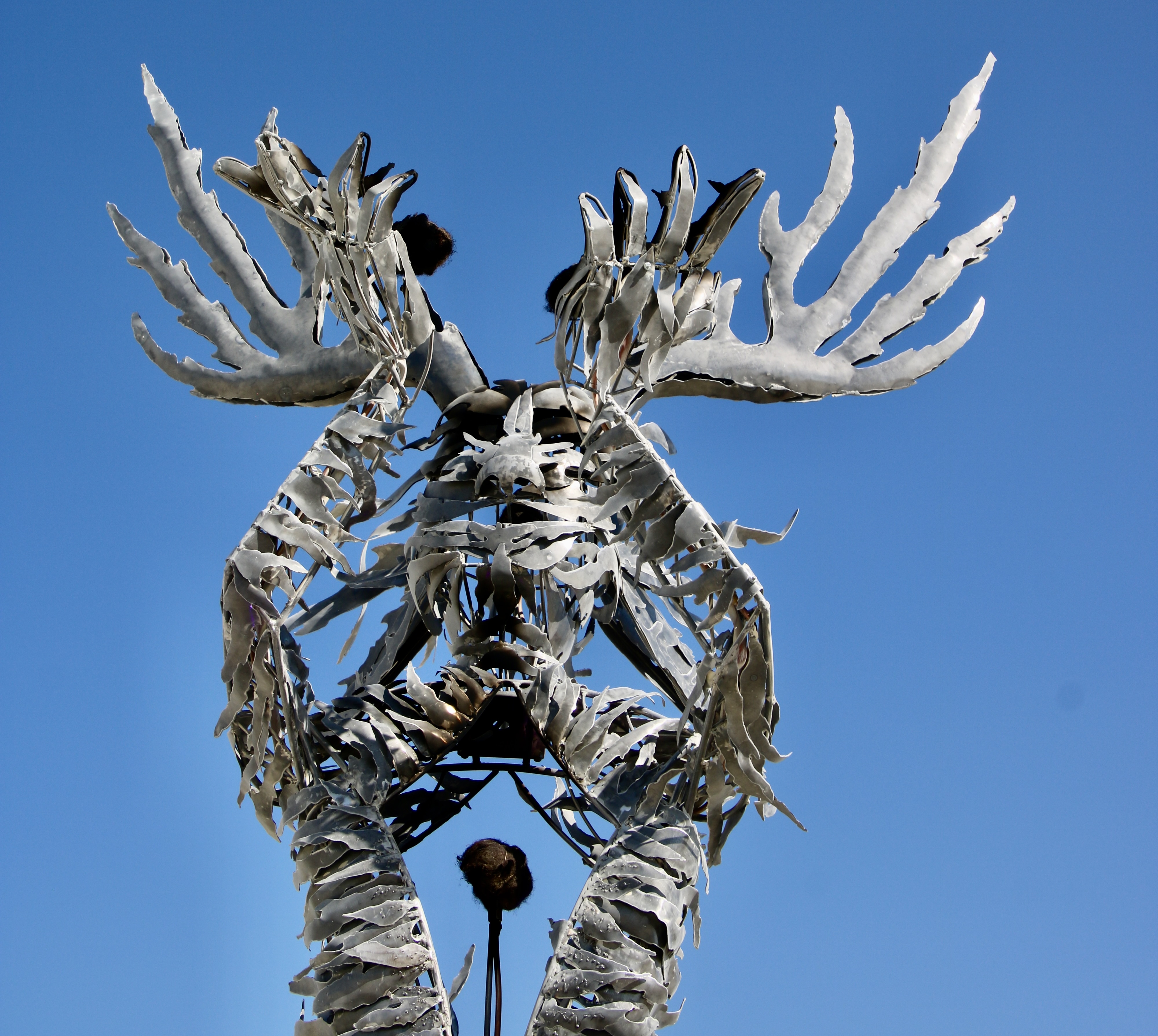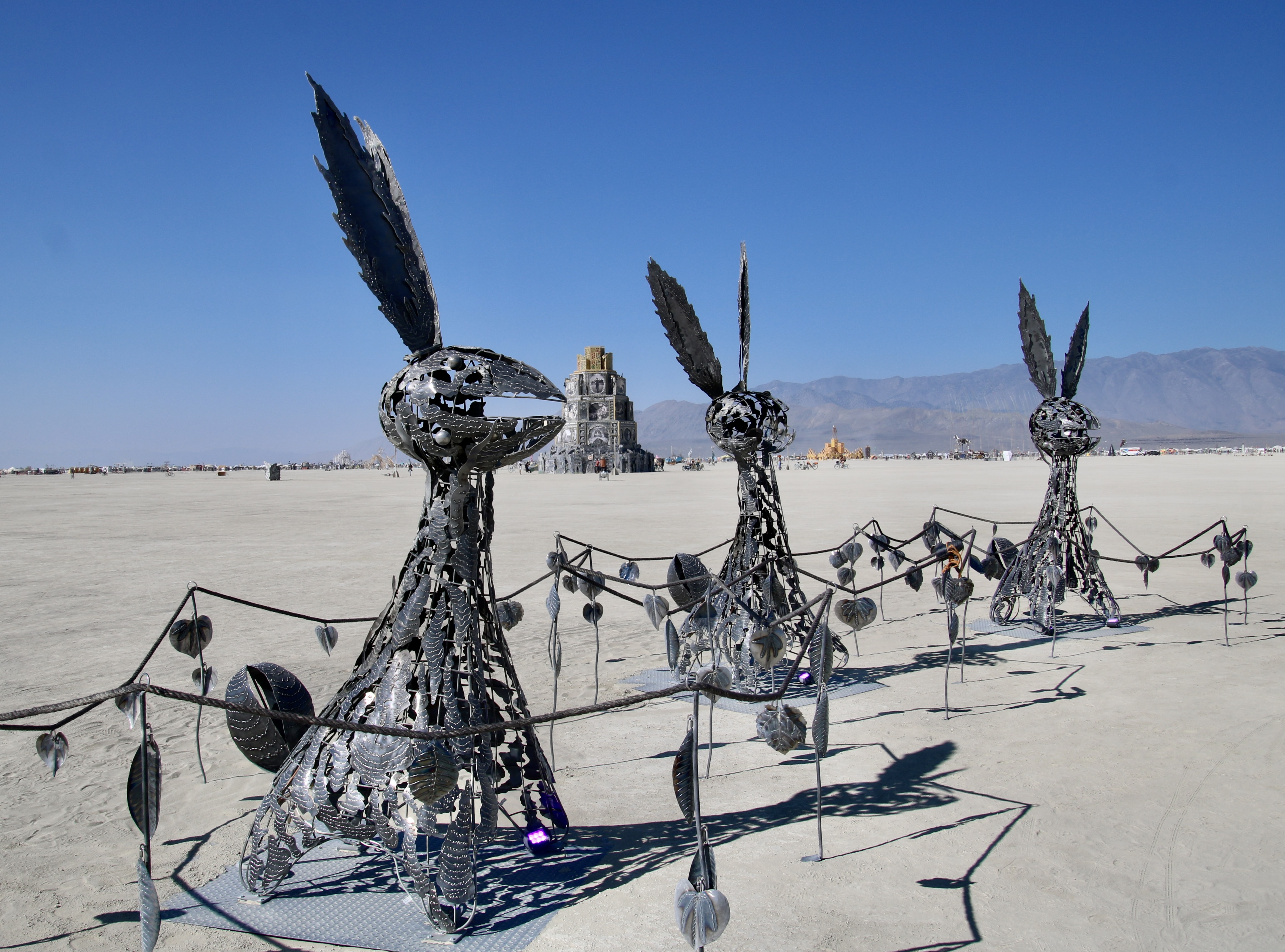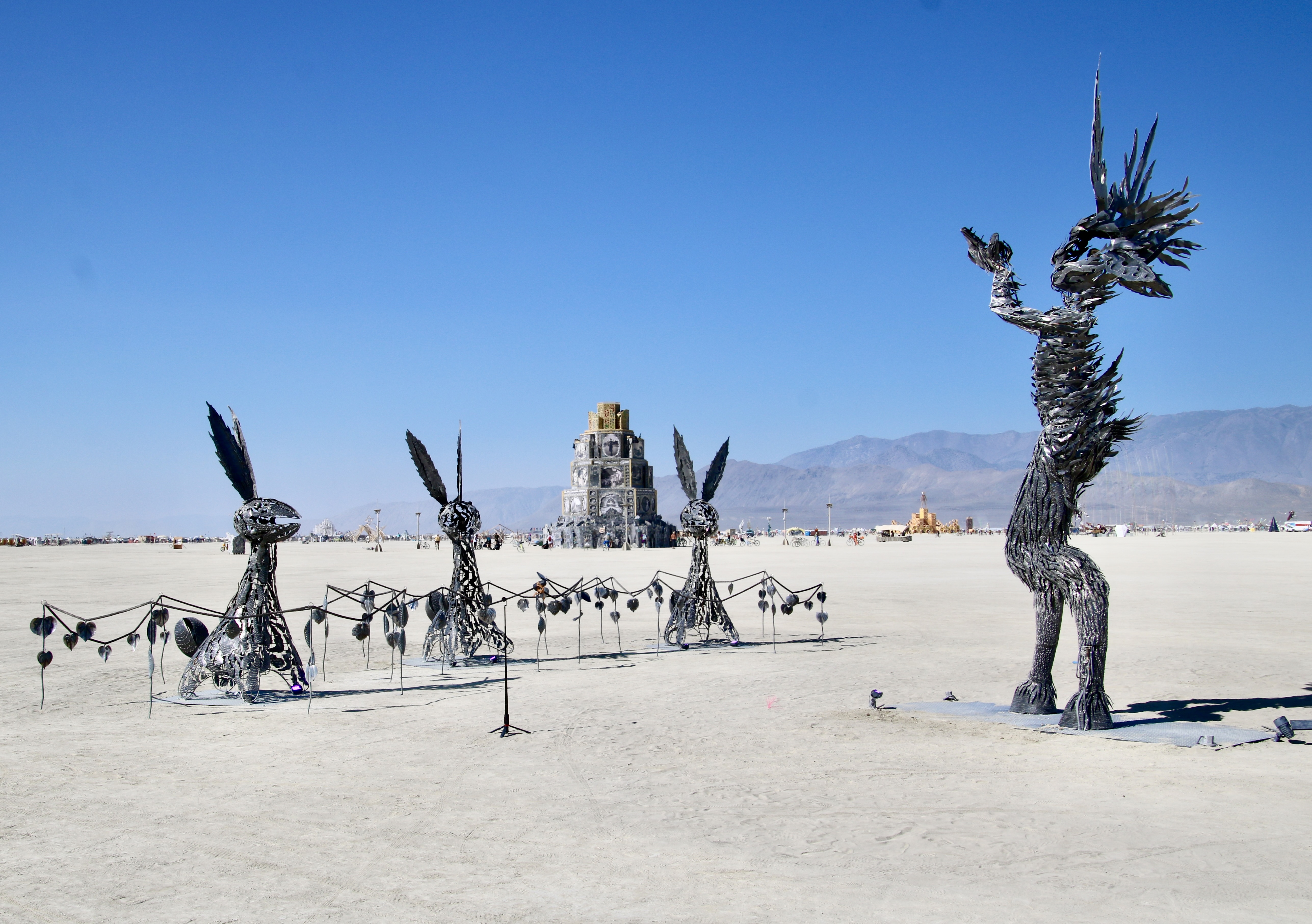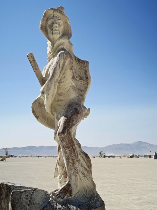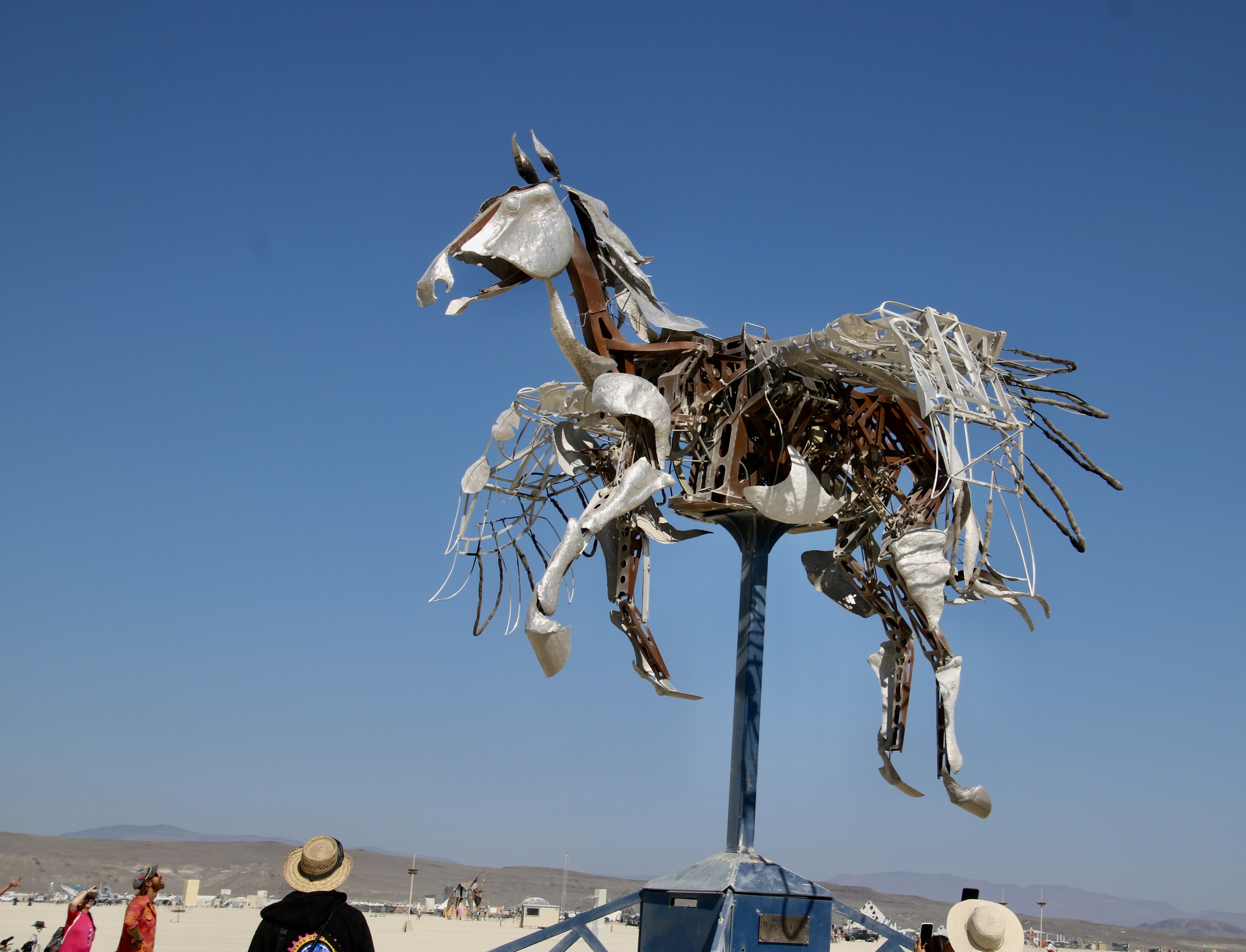 While partying, music and a unique culture draw thousands to Burning Man each year, it is the art such as this brass sculpture and the giant woman in the background that pull me back to the event year after year.