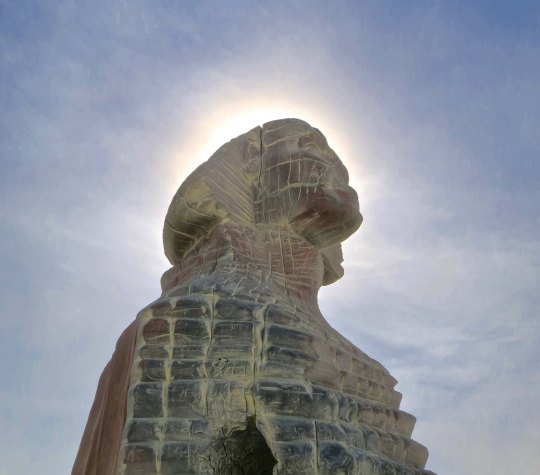 I’m not sure what these brass sculptures were suppose to represent, but I found them beautiful in the Black Rock Desert setting.Fantasy came to mind when I first saw this.Like much of Burning Man art, people were invited to be a part of the sculpture by climbing on it.A close up…And at night. You are looking at the type of light pollution you can expect at Burning Man.I’ve always found this simple sculpture made of bricks powerful.All types of media are used in the art at Burning Man. This is a carved wood sculpture of an Easter Island figure.From the front.The sphinx backlit by the sun.The Statue of Liberty, the symbol of American freedom and promise. ““Give me your tired, your poor, your huddled masses yearning to breathe free…”A ninja warrior.A clay bust of Maya Angelo symbolizing her book, “I Know Why the Caged Bird Sings.”This wild, metal dragon, guarding its egg has always been one of my favorite Burning Man sculptures. It was created by a group of women artists out of the Bay Area.The dragon with its egg.Lit up at night. The drama is increased by just how dark the Burning Man night is. I’ll conclude today’s post with this. When the egg opened and the baby dragon was born, it shot these flames into the night.
