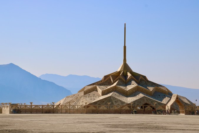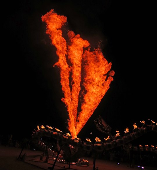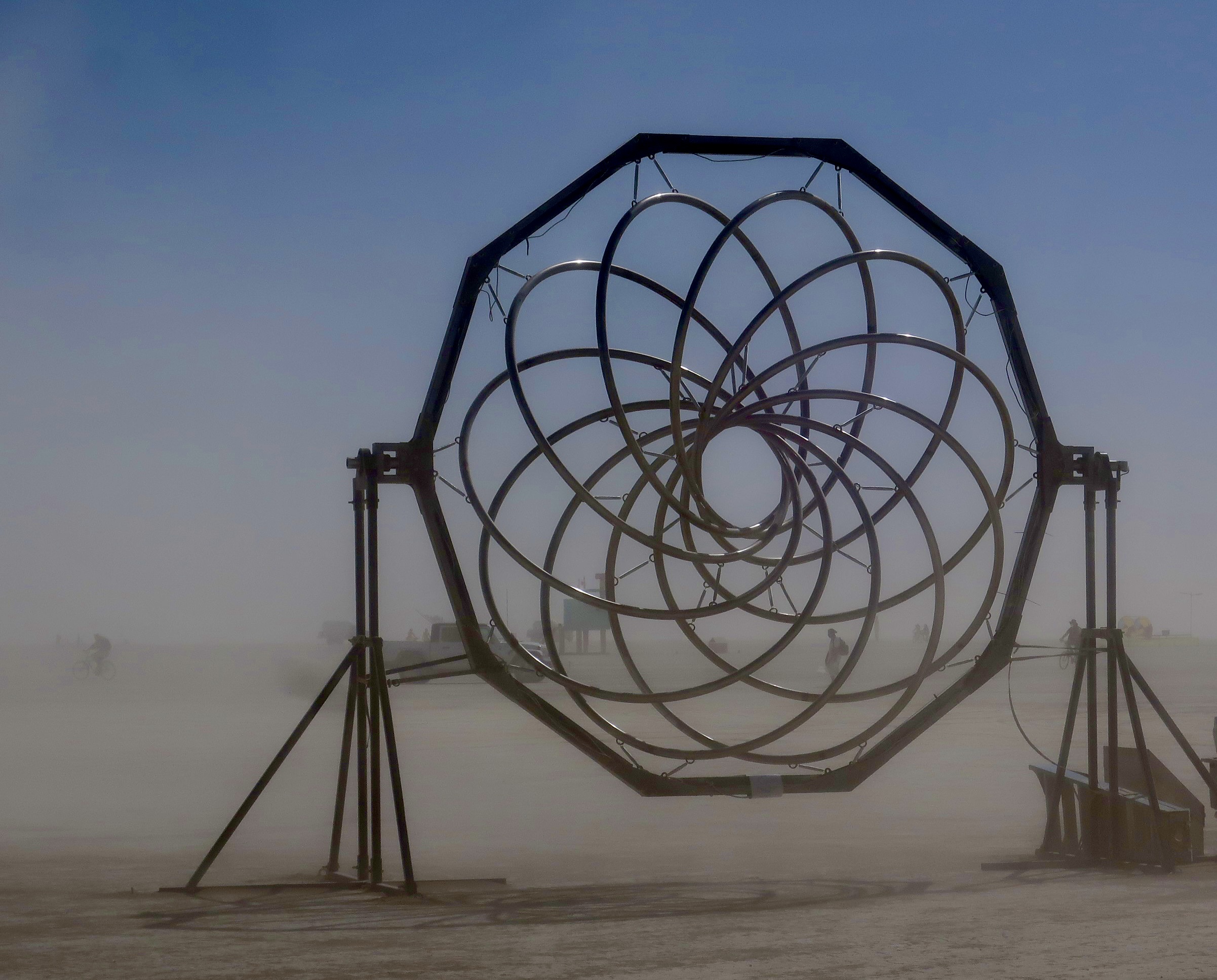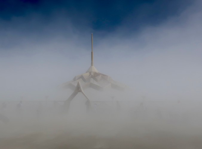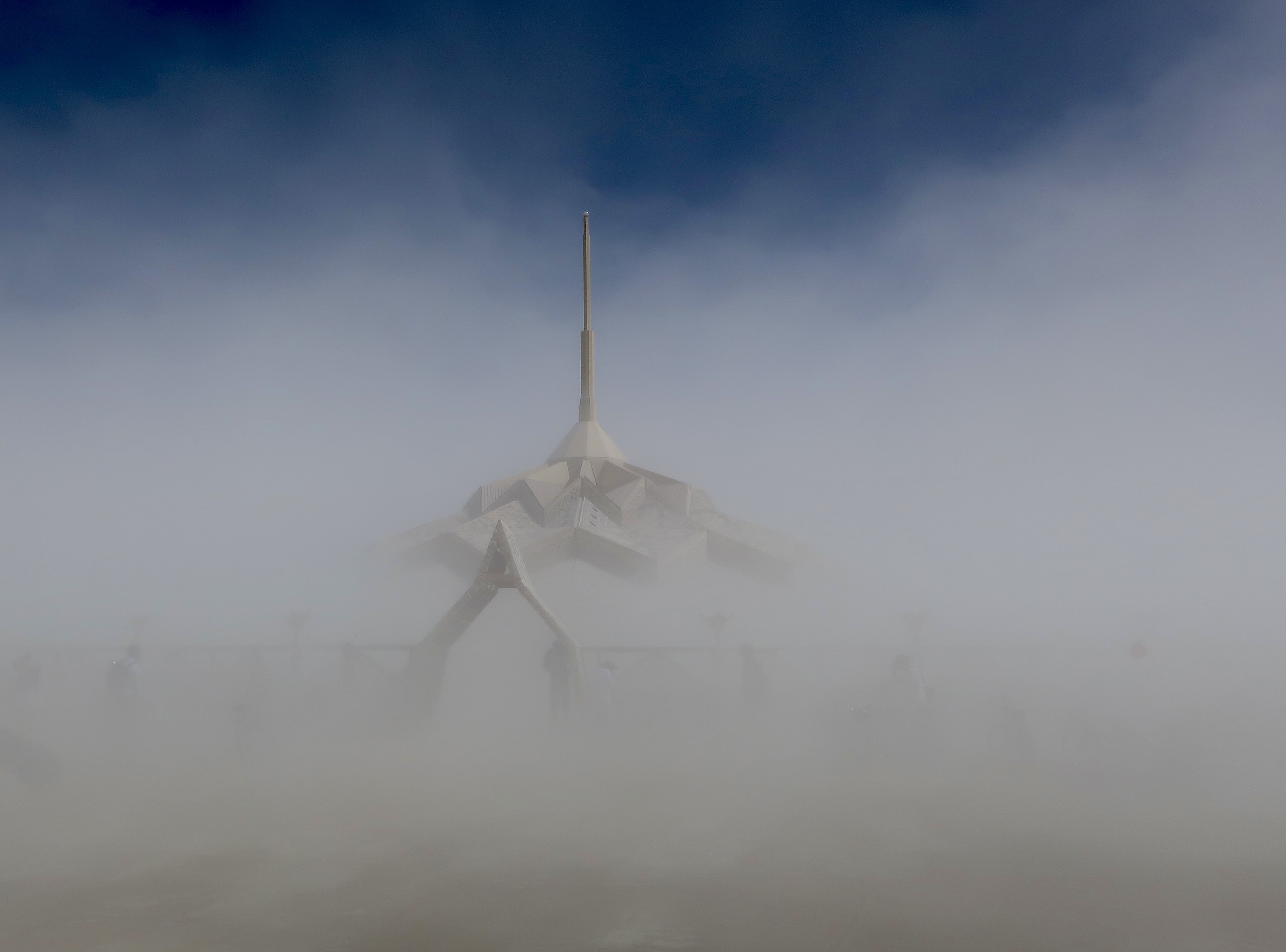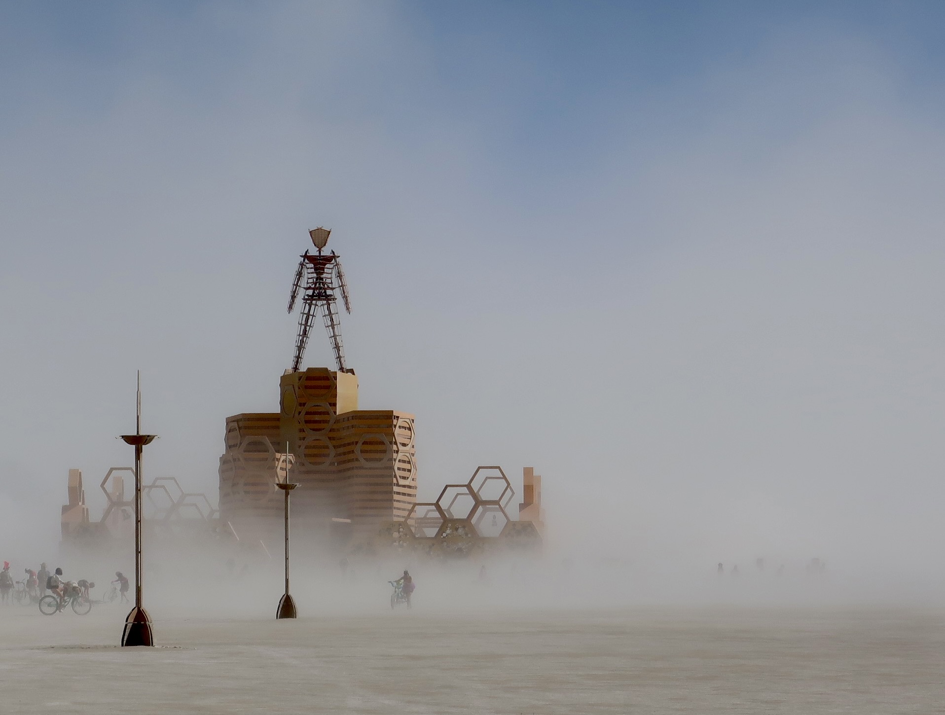 The Man has served as the symbol for Burning Man since its very beginning in 1986 when Larry Harvey and Jerry James built a stick man to celebrate the summer solstice at Baker Beach in San Francisco. His fate was preordained. He would burn. And, like the Phoenix, he rose again the next year and has been doing so ever since. Here, the 2023 version of the Man is emerging from a dust storm, which is much more common than the rain that captured the world’s attention this past week.