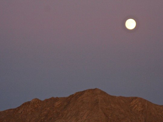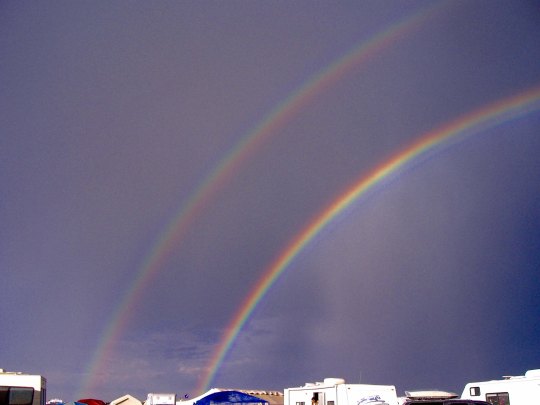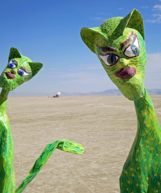 I like this photo because it emphasizes how flat the Playa is. You can barely see the fence that marks the outer boundary of Burning Man. Art can be found even in this remote section but it takes a bit of effort to get there. The flat playa has enabled some land speed records to be set here. It has also provided a good base for launching rockets.Of course, I like to spend time out there given my love of wide open spaces, desire to escape the crowds, and interest in the art. Here I am on the outside looking in. It was shortly after this that the Black Rock Rangers, the Border Patrol of BMO, came roaring over in an official truck. I hopped the fence and zoomed off on my bike. (Photograph by Peggy Mekemson.)The Border Patrol is wise to be vigilant on the outer edges of Burning Man, however. Aliens are known to hang out there.Some even resemble cats. This doesn’t surprise me. I’ve always thought that cats have a taint of alien blood. It may be more than a taint. Have you ever found your cat staring at you in a strange way and wondered what alien thoughts were passing through its mind?Another perspective. Note the rain clouds. The Black Rock Desert receives less than 10 inches a year, which is the definition of a desert. At times, it seems like the majority falls during Burning Man! All traffic is stopped. A thick, caky mud clings to vehicle tires, bike tires and shoes. A small garbage bag worn on the shoes helps feet avoid the worst of it.We’ve seen some spectacular rainbows accompany the storms.Another example.My friend, Ken Lake, caught a photo of this double rainbow hanging over Black Rock City.The first rays of the morning sun touch the mountains surrounding Burning Man. Early morning and evening are the best time to photograph the scenery.A few minutes later.This sunrise photo is an example of how the large event is dwarfed by its surroundings.Another example.The sun sinks into the west, signifying that life at Burning Man is about to be seriously ramped upward. While many Burners think party as night approaches, others pause to enjoy the beauty.And beauty there is.As the sun sets, the moon rises.With a beauty and drama of its own. (Photo by Don Green.)I’ll conclude with this photo of the moon hidden by the clouds— a contrast in light and dark.