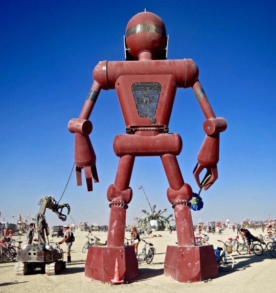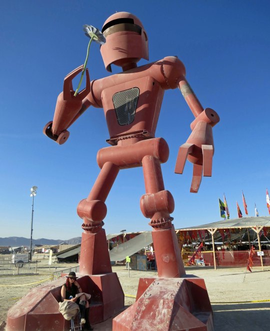 What’s the danger of a flower sniffing robot, however? This fellow was given one of Burning Man’s prime locations, just in front of the Center Camp Cafe bordering on the Playa. The woman provides some perspective on his size.