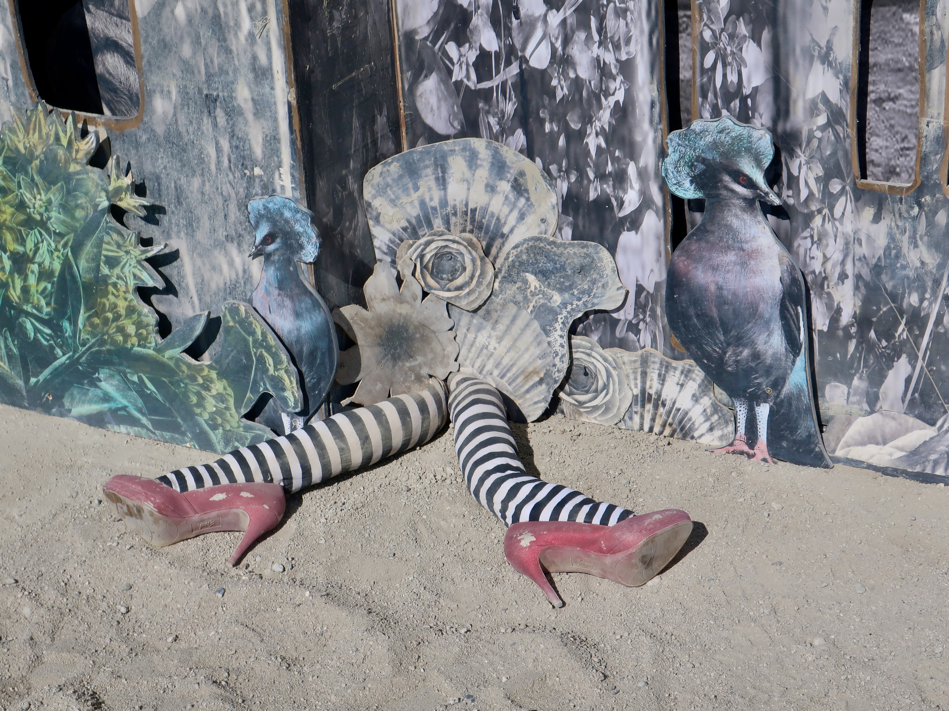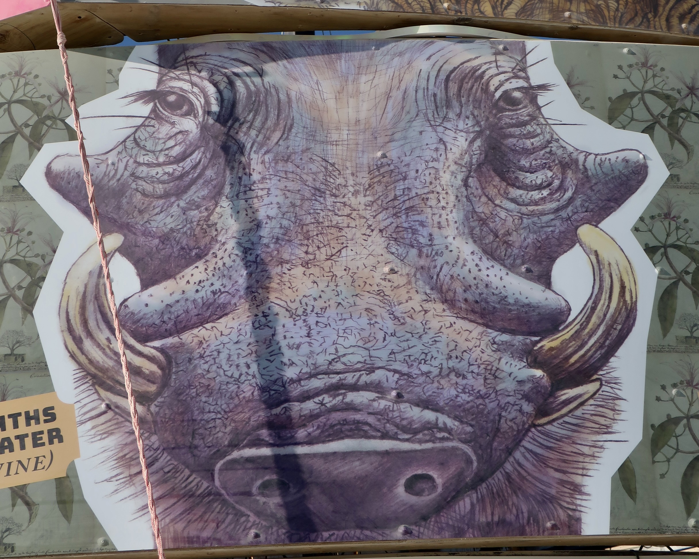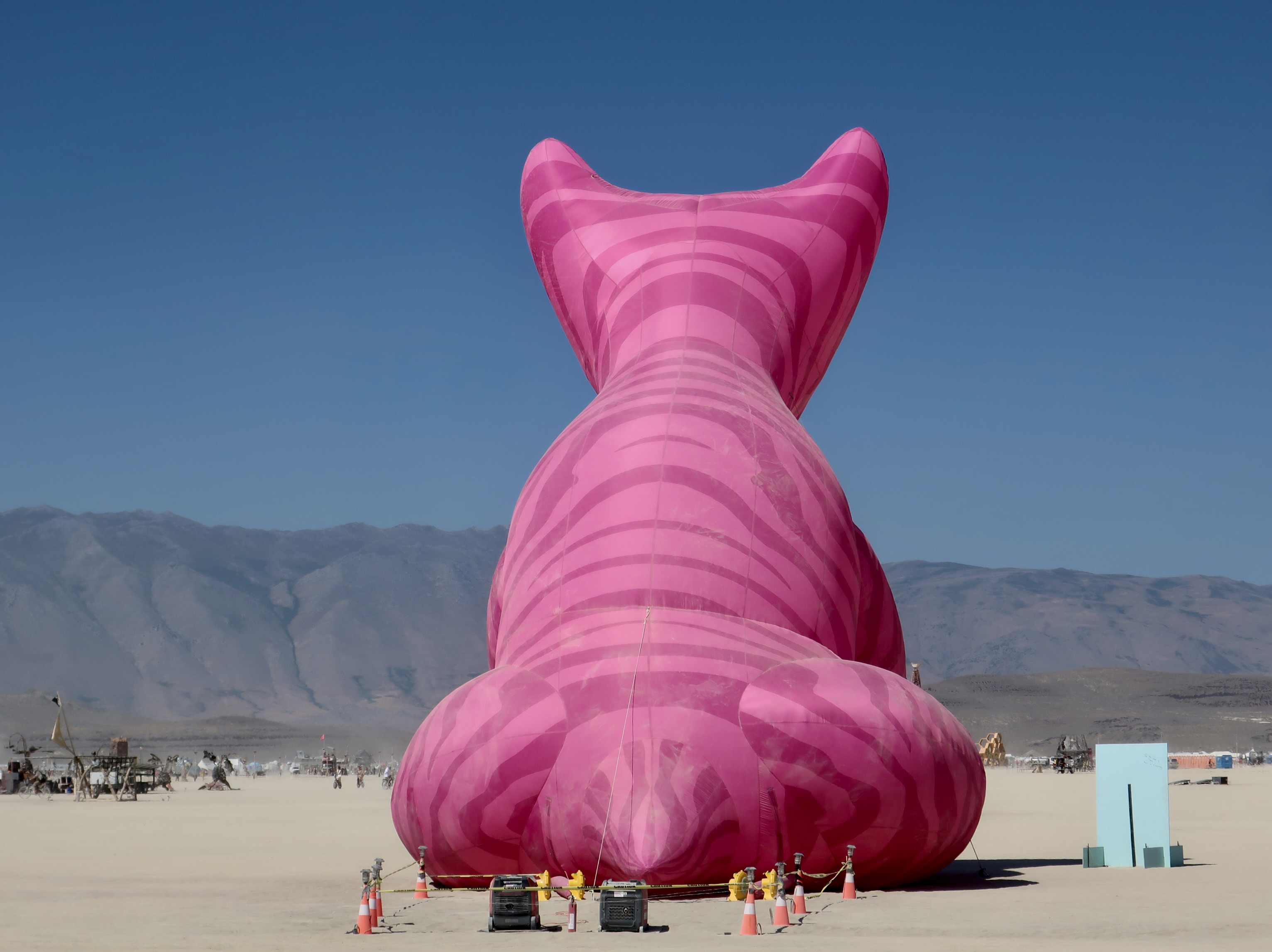 with glowing infinity mirrors, each reflecting mosaic drawings of extinct animals from the past 12 months.” From the outside, I couldn’t see the animals. Possibly, they would be clearer at night when lit up.Peggy, on the other hand, who isn’t endangered, was reflected numerous times. The guy wearing the hat above her on the right is me. I think. At 80, I’m a little more endangered than Peggy. But not here. Peggy got caught by a giant spider that undoubtedly thought of her as a tasty morsel. Always the optimist, she is laying back and enjoying the view. Spider Trap was created by Josh Zubkoff & Looking Up Arts from San Francisco, CA. Josh noted that “Spider Trap was not menacing.” Hmmm.These etherial, almost whimsical creatures floated above the Playa. They represent fairy shrimp. In real life they are found under the surface of the Playa. Rain brings them to life for a brief period of time when they mate and reproduce. Burning Man 2023 with its heavy rains was a banner year for them.Created by P. Michael Quinn from Gossburg, TN, this is at least the second time the shrimp have made an appearance on the Playa. I featured them in post several years ago. I like the effect of the sun.While we are featuring aquatic life, this fish hails from the Caribbean. Her creator, NiNo from Trujillo Alto, Puerto Rico, named his work ATABEY’s Treasure. Atabey, according to NiNo is “The goddess of fresh water to the indigenous Taíno people in the Caribbean.”ATABEY’s Treasure lit up at night with the Man in the background.Titled “Migrations,” this graceful white bird seems to be rising from its nest on the Playa on its way to wherever. Created by Olivia Guethling & Mar Ricketts – Superwhelm from Portland, OR, the migrating bird was even more beautiful at night than it was during the day.“These boots were made for walking,” Nancy Sinatra’s song popped into my mind when I saw this 8 meter/26 foot tall inflatable bunny named “Mona” sporting tall yellow boots.According to the artist, Miao He from Shehong, China, Mona “serves as a symbol of love, warmth, and childhood memories.” I confess that my reaction as a child would have been to scream and run as fast as my little legs would have carried me in the opposite direction if an 8 meter bunny came striding toward me. This child, however, ran up to the bunny and threw its arm around the forward boot, seemingly proving Miao’s point. “Exquisite Animalus,” an art piece by Stefan Spins & KJ Bohéme, included six animals that could be moved by ropes and handles to become the animals they were meant to be. Obvious a little work was required. I took on the challenge, pulling first on the ropes and then on the handles. The animals hardly budged. Maybe they liked being who they had become. Or maybe the playa dust had gotten in their gears… I particularly liked this critter, a common warthog. I once met a family of them when I was driving a VW bug through the Serengeti National Park in East Africa.Queen Cobra, by Andrea Greenlees, Andy Tibbetts, and Josh Haywood from London, United Kingdom & Reno, NV. Like many works of art at Burning Man, The Queen was designed so people could climb on it. She reminds me of Wadjet, an important goddess of lower Egypt. (And yes, I will get back to my posts on the Nile. Eventually.) This wraps up my blog today. Next up, I will be featuring three huge planets that made their way onto the Playa.