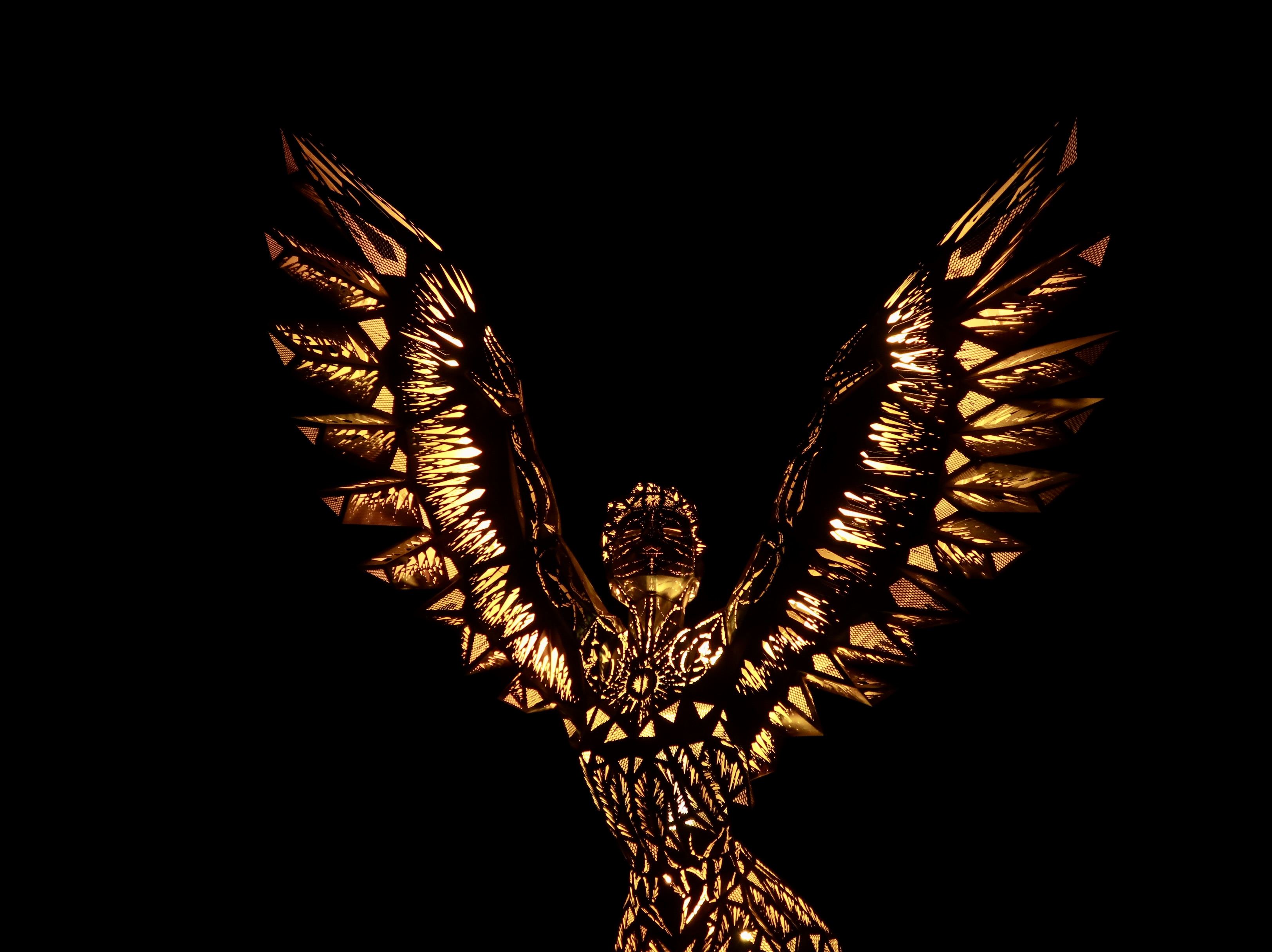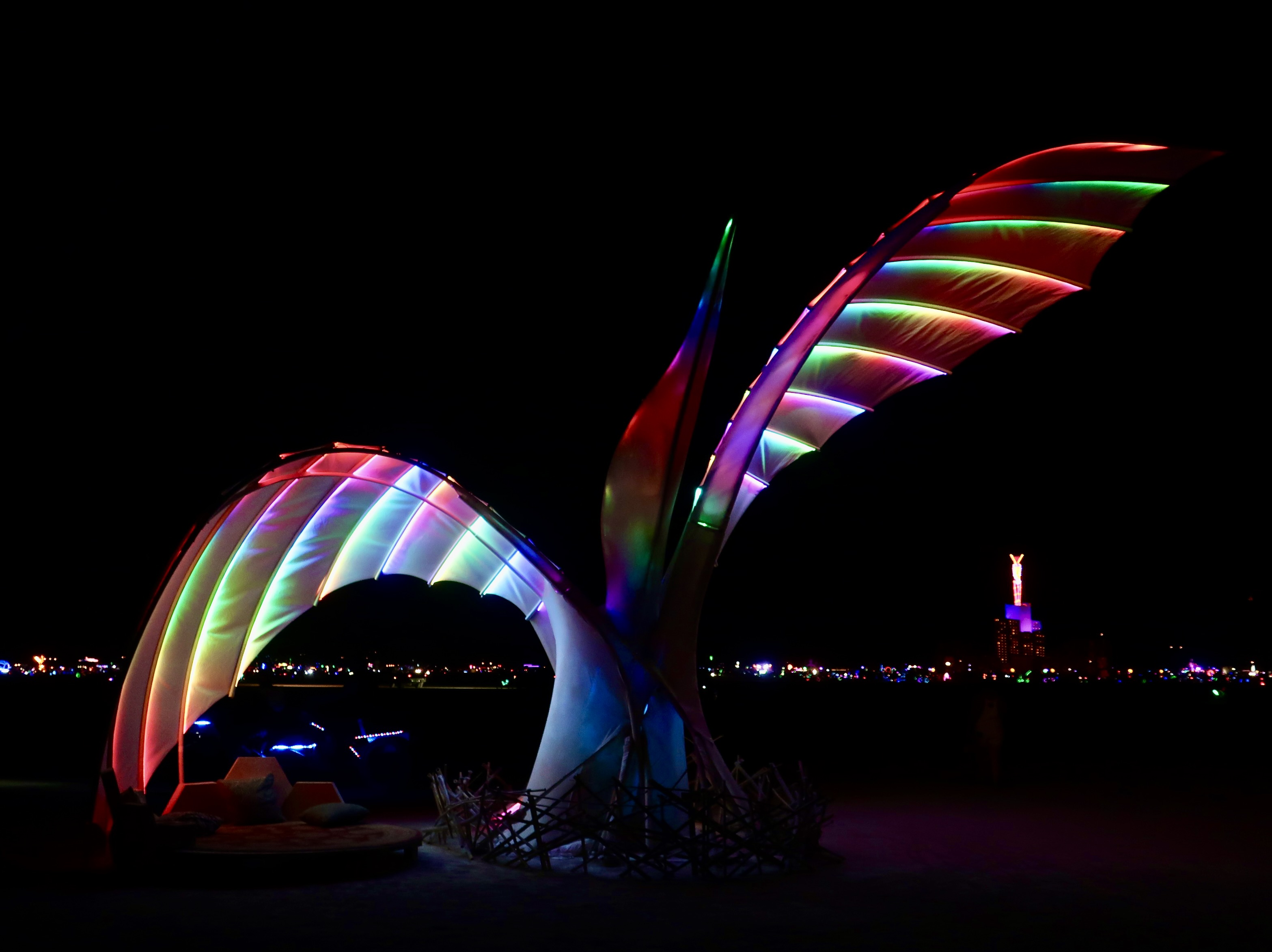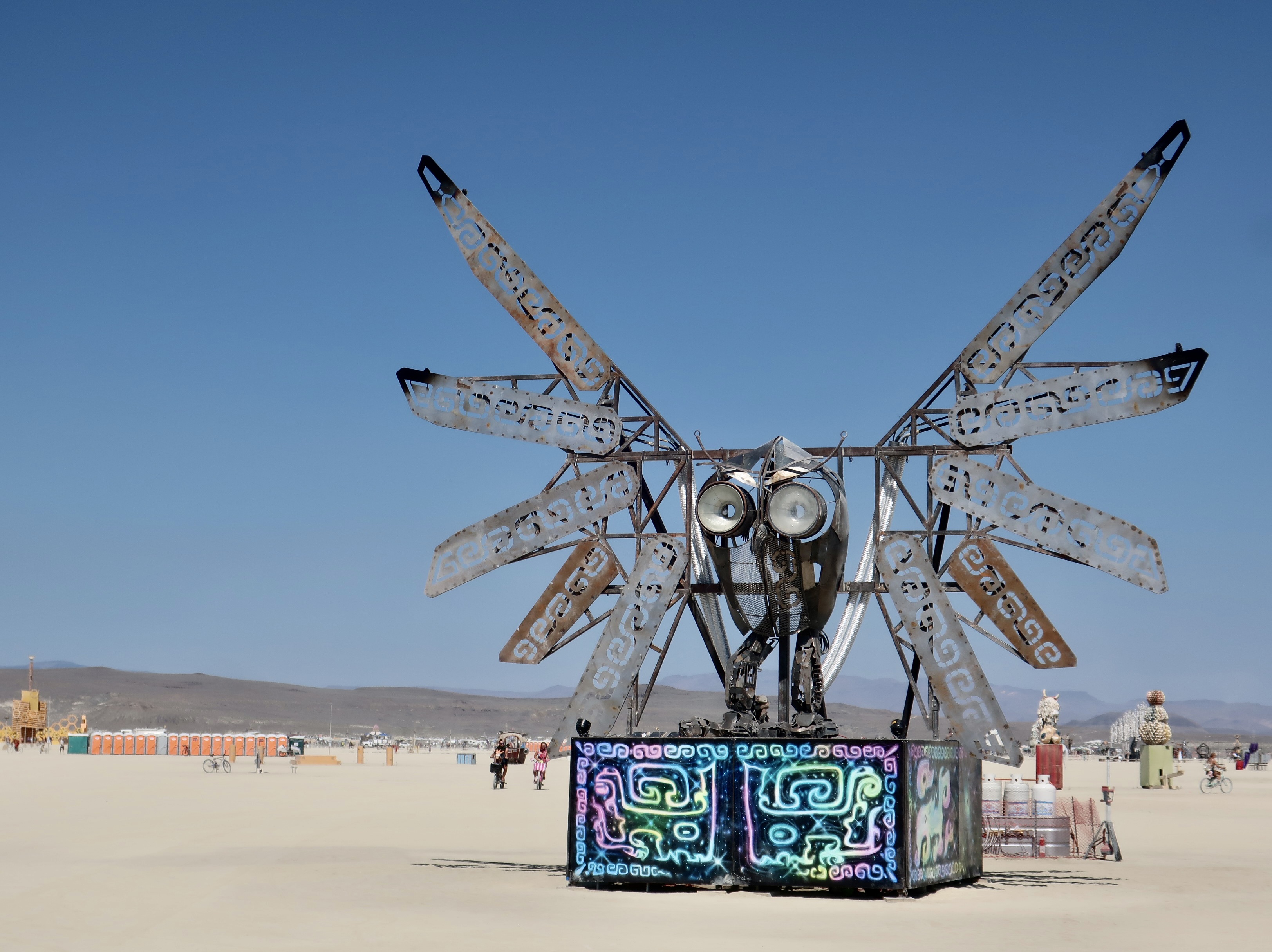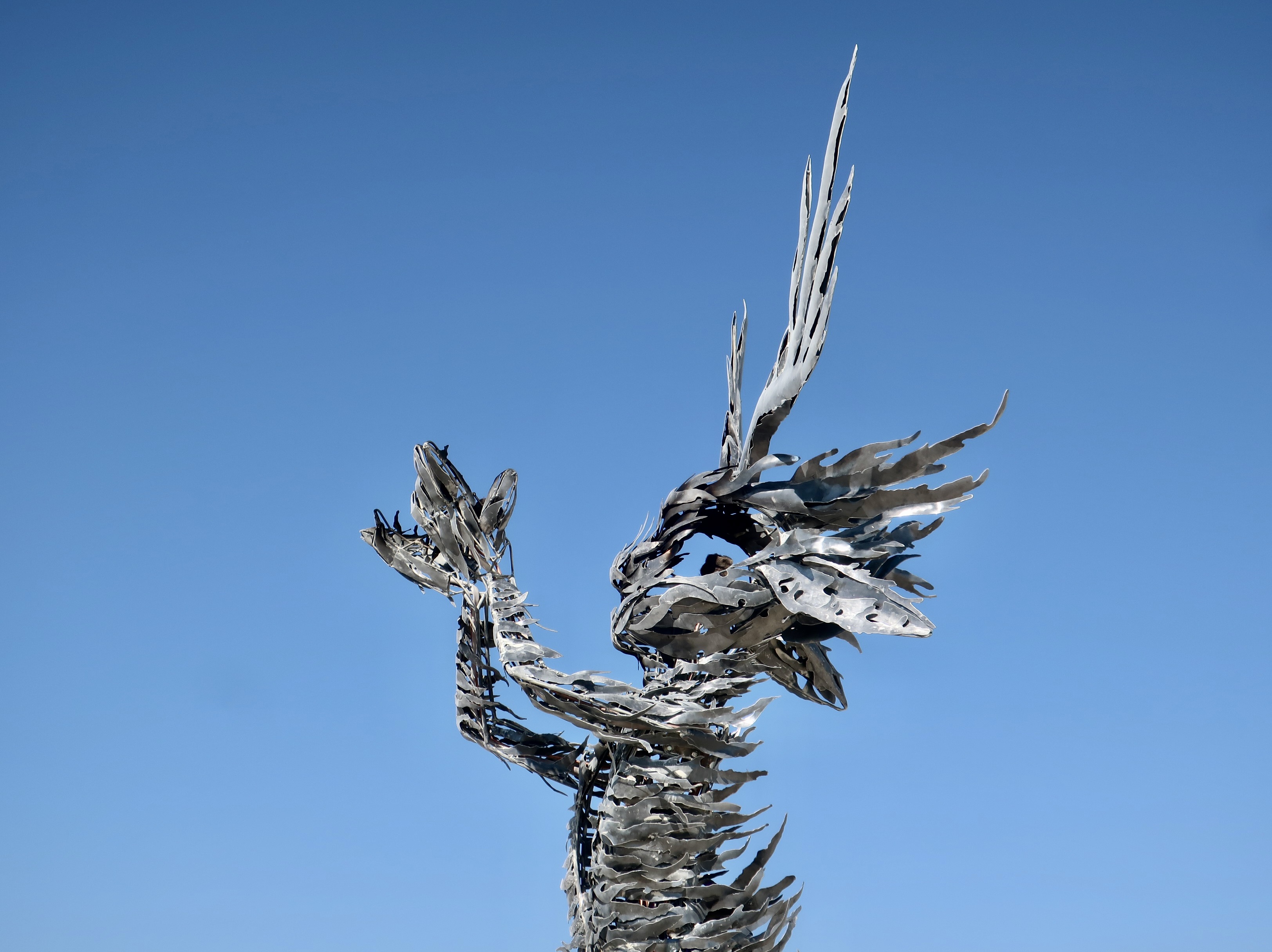 Reaching toward the sky, this beautiful winged creature rises above the Playa of Burning Man 2023. The Man, with his red pants, can be seen in the background.