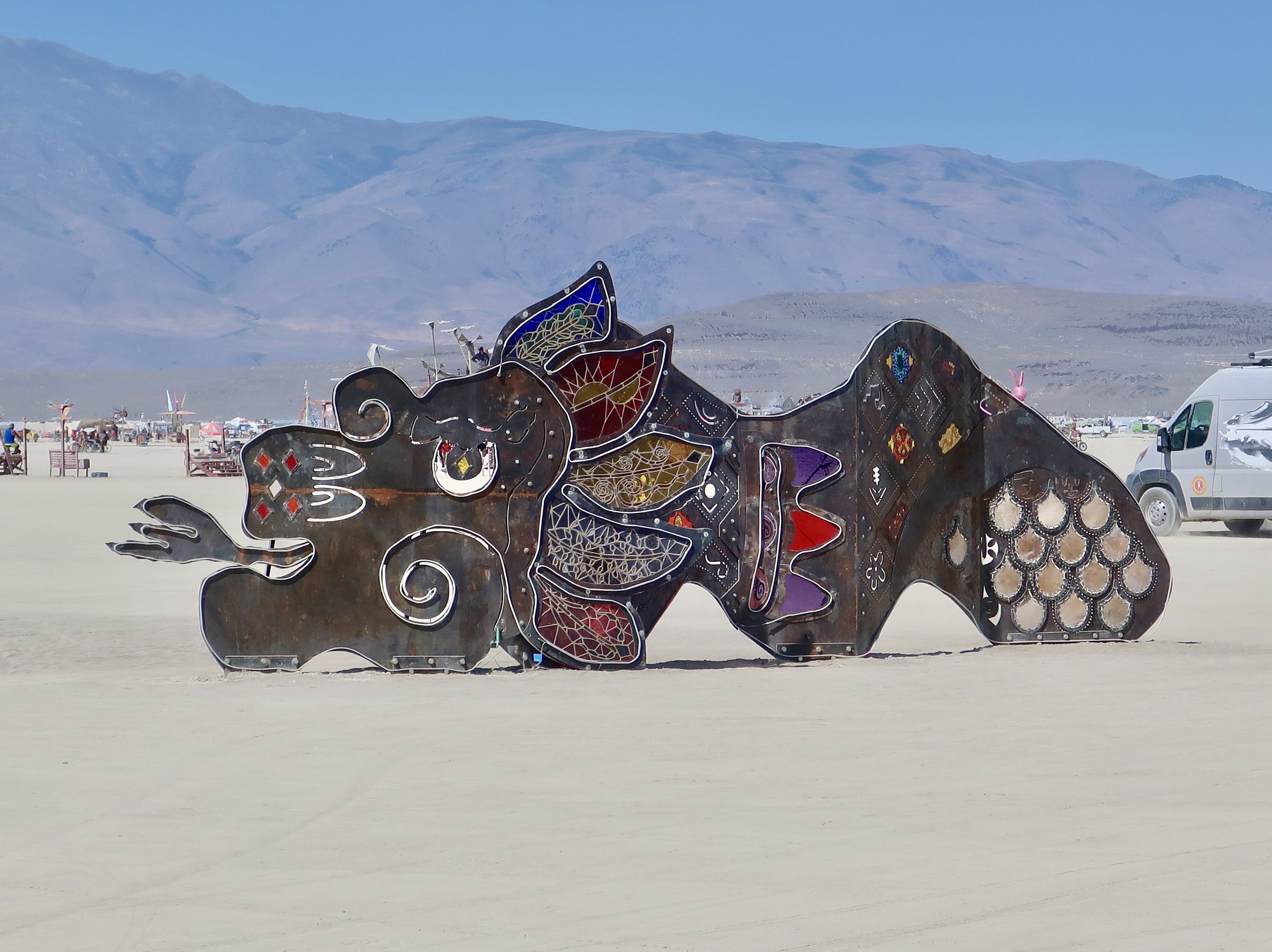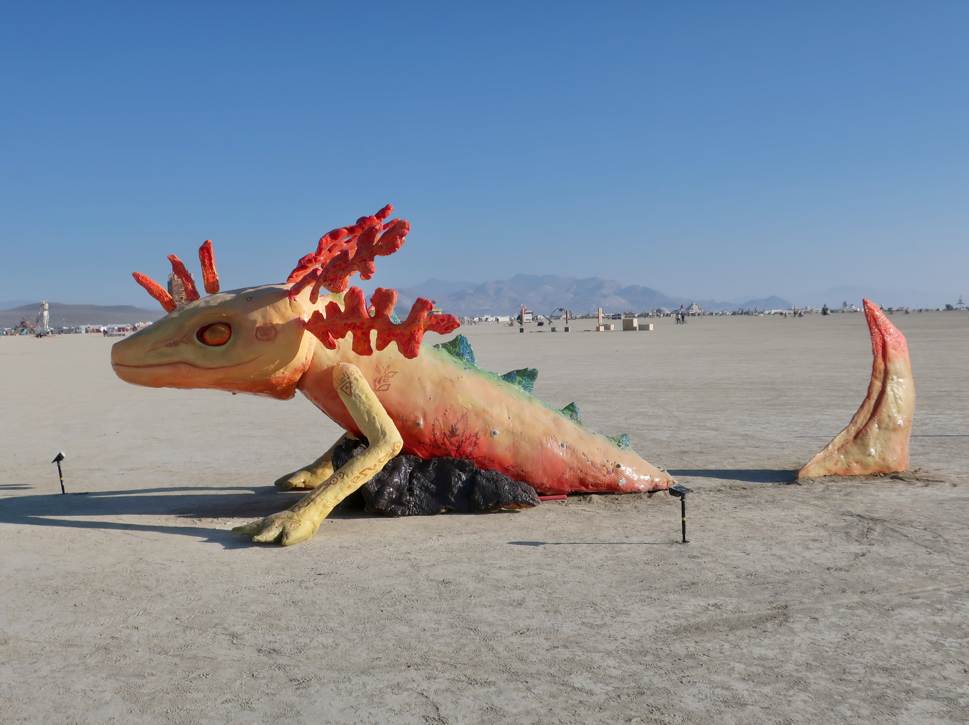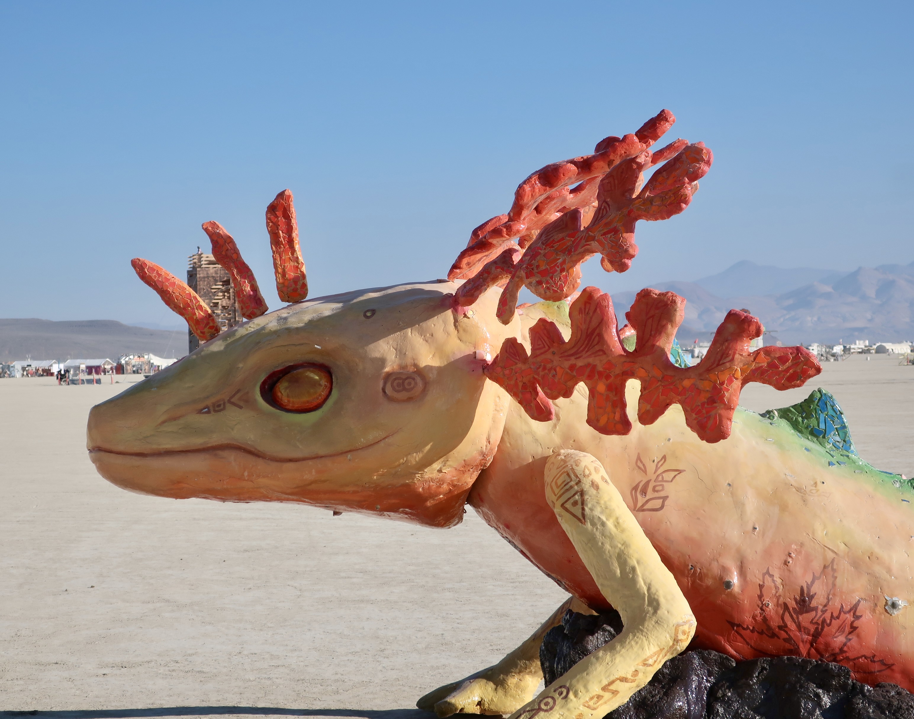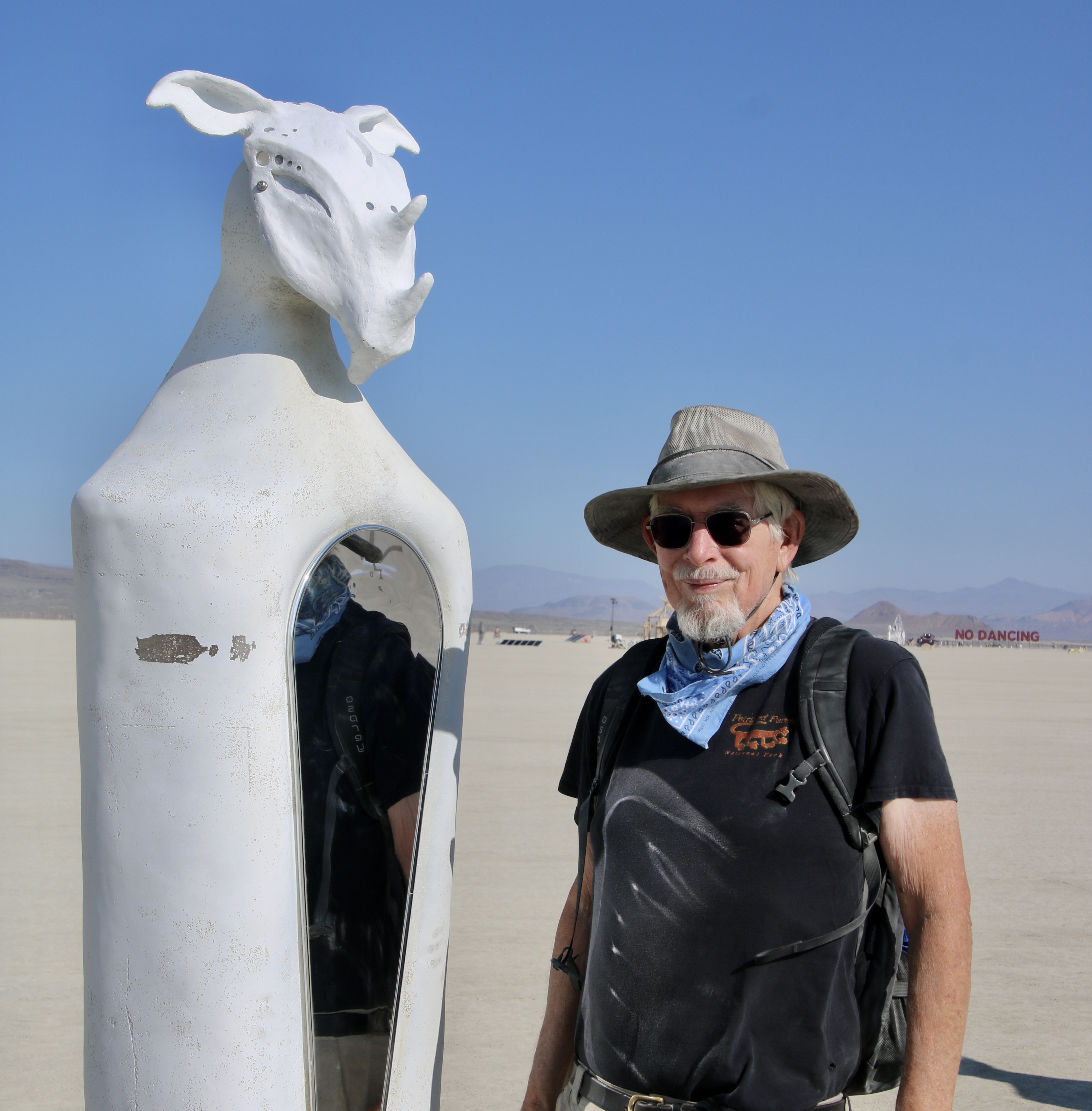 This handsome fellow is Chacc, the Mayan Rain God. Nice tongue. Peggy and I met him before when we were on our honeymoon in Mexico back in the early 90s. We spent the night in a motel next to the ancient Mayan ruins of Chichén Itzá and went out to visit him and other gods after all the tourists had left. They were carved in stone. According to legend, Chacc lived in a cenote next to the ruins. (Cenotes are natural wells created by the collapse of overlying limestone.) In times of drought, human sacrifices would be tossed into the well to appease whatever was irritating him and bring rain. Here’s Chacc standing tall at Burning Man 2023. Miguel Guzman from Mexico City and lyvone Khoo from Singapore created the sculpture. Since there weren’t any cenotes around in the Black Rock Desert to throw human sacrifices into, we figured that the bowl on the stand in front was a substitute.The ever curious (and mischievous) Bone decided to see if Chacc would accept him as a sacrifice. Apparently, the answer was yes. Chacc grabbed Bone up quickly in his long, bony fingers. You know the rest of the story. It rained in the desert for three days and stuck 70,000 Burners in the mud— becoming world-wide news. The moral of this story is watch what you ask for. Bone has been very quiet about his role. Somewhere, maybe down in his cenote, Chacc is laughing. (Note: For those of you who aren’t familiar with Bone, I’m posting an updated interview done with him in the past in conjunction with today’s post.)While we are on focusing on the gods of Ancient Mexico, I should also include this version of the Aztec god, Quetzalcóatl, the Feathered Serpent, by the Crescent Art Collective/Lisa Regan & Ley Brashka from Coahuila, Mexico & Tulsa, OK. Among his several roles, he was patron god of the Aztec Priesthood.Here’s another great beast. An RV with legs perhaps? I’m thinking it would make a great off-road vehicle. Getting in and out might be a little challenging.The artist, Walker Babington from New Orleans, had more than a house on legs with his creation, however. From the front, his sculpture became a buffalo with the house serving as his torso. Both the house and the buffalo were made of materials repurposed from structures and trees that had been destroyed by hurricanes in New Orleans. Babington titled his work “Burden of the Beast” and says his work “symbolizes the task of relocating one’s intrinsic understanding of ‘home.'” The forces of nature magnified by global warming will require more and more of us to pick up the pieces of our homes and lives and move on to higher and safer ground. Migration may become a way of life.Meet Axototl Frequency, a 2023 Burning Man artwork created by Gio Mantis & Elana Novali from Mexico City.Axolotl is modeled after an endangered salamander that can be only be found in one place, Lake Xochimilco near Mexico City. We think it’s cute. According to Mantis and Novali, “These art pieces aim to express the importance of protecting this endangered animal…” One thing that helps assure their continued existence is they are quite popular as pets. I want one.One of my all time favorite group of artists at Burning Man is the Flaming Lotus Girls out of San Francisco who are known for their imaginative creatures that light up the night skies of Burning Man in strange and wonderful ways. This was one of several sculptures we found together on the Playa. We wondered if they were plants, animals or machines. The Flaming Lotus Girls claimed that they were a bit of all three, evolving. Unfortunately, due to the rain, we never got to see them flaming at night.Leaves or wings? A flower head or an animal head?Not a creature I would like to meet at night shooting out flames. (Actually, I would have.)A photo I took of a dragon created by the Flaming Lotus Girls at Burning Man 2015.Zea Narvaez from Portland, Oregon urged viewers to face and love their beasts in a series of sculptures arranged in a circle with each one different and with a mirror. Peggy caught this photo of me next to my favorite. “Damn,” I told Peggy when we were reviewing our photos after Burning Man, “the beast marked me.” I swear, it was the first and only time I noticed the claw marks on my chest! Reflected Playa dust on the mirror? Maybe.Mainly we took selfies, as Peggy is here. If that isn’t a form of “Loving Thy Beast,” what is? Speaking of possible beasts, do you see that sculpture in the distance on the right in the far distance? We hopped on our bikes to check it out.“Well, I have an idea what it might be,” I told Peggy.“You are looking at it wrong,” Peggy told me. Oh. “Tip of the Iceberg” is what Melissa “Syn” Barron from Oakland & Big Sur, CA calls her sculpture. The comment was “Monumentalizing this misunderstood & mysterious piece of anatomy, we hope our sculpture will educate, empower, & honor its rightful place in biology.” Right. You are looking at an ‘invisible Trojan Unicorn’ according to artists, Invisible Pink Unicorns from Los Angeles. It’s certainly pink and a unicorn. Here’s what the artists had to say, “Given the challenge of getting the tickets, we invited the easiest and cheapest way to get to Burning Man – inside the Trojan unicorn. Please come and check if it is open and if we successfully get out to the Playa and are not trapped inside (and help us get out if we are still in)!” My money would have been on Burning Man Org blocking free entry into the event. They are a lot tougher than the Trojans were! Grin. They even checked the bathroom in our trailer to make sure we weren’t trying to slip someone in! Little did they know about the trap door on our black water tank. Heh, heh. Just kidding. I’ll conclude with this fun winged beast I couldn’t find any information on. Next up, I’ll feature a Hedge Hog from Ukraine made from tank traps and other fun animals including a giant bear and a bunny.