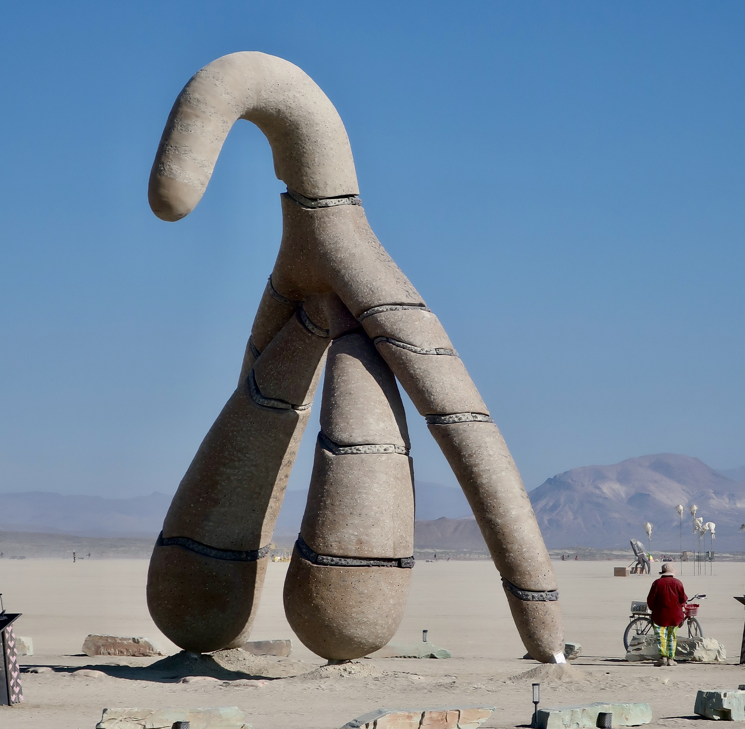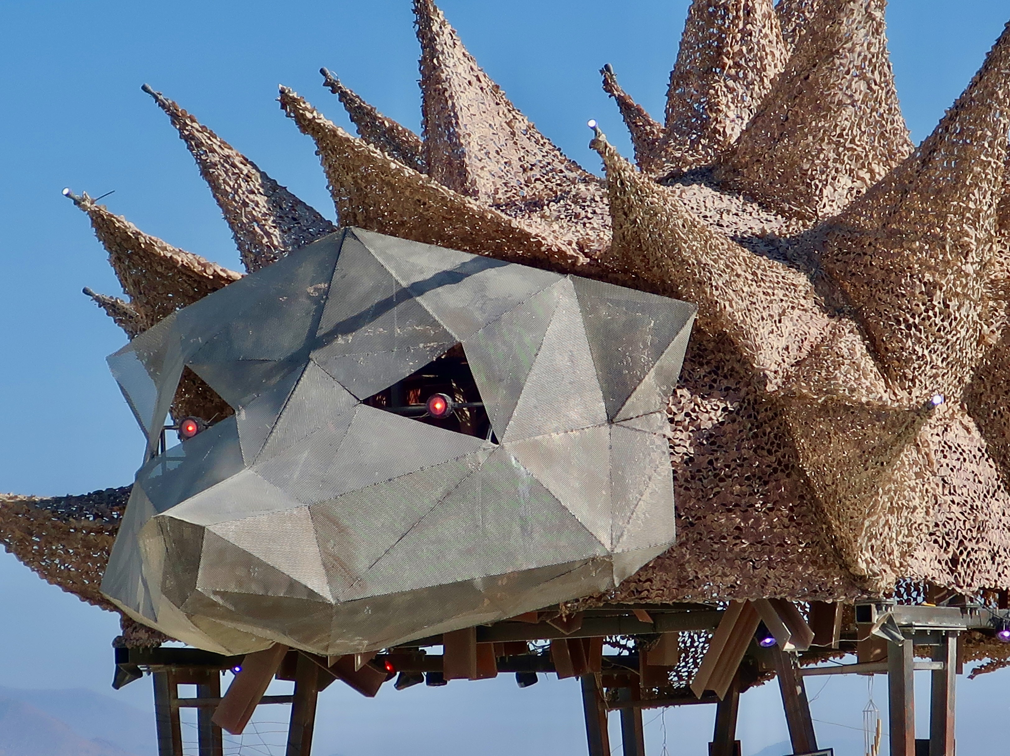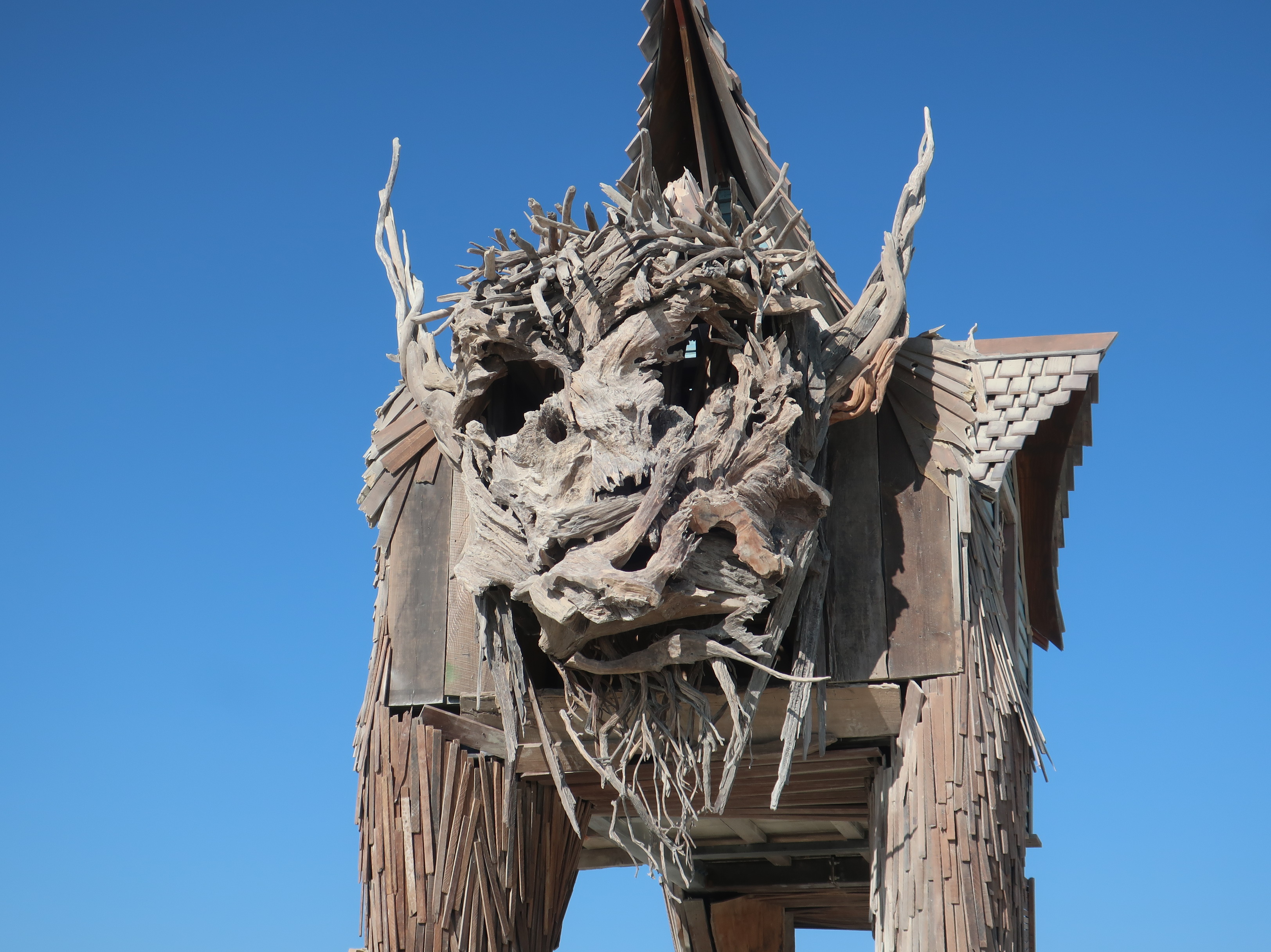 This handsome fellow is Chacc, the Mayan Rain God. Nice tongue. Peggy and I met him before when we were on our honeymoon in Mexico back in the early 90s. We spent the night in a motel next to the ancient Mayan ruins of Chichén Itzá and went out to visit him and other gods after all the tourists had left. They were carved in stone. According to legend, Chacc lived in a cenote next to the ruins. (Cenotes are natural wells created by the collapse of overlying limestone.) In times of drought, human sacrifices would be tossed into the well to appease whatever was irritating him and bring rain. Here’s Chacc standing tall at Burning Man 2023. Miguel Guzman from Mexico City and lyvone Khoo from Singapore created the sculpture. Since there weren’t any cenotes around in the Black Rock Desert to throw human sacrifices into, we figured that the bowl on the stand in front was a substitute.The ever curious (and mischievous) Bone decided to see if Chacc would accept him as a sacrifice. Apparently, the answer was yes. Chacc grabbed Bone up quickly in his long, bony fingers. You know the rest of the story. It rained in the desert for three days and stuck 70,000 Burners in the mud— becoming world-wide news. The moral of this story is watch what you ask for. Bone has been very quiet about his role. Somewhere, maybe down in his cenote, Chacc is laughing. (Note: For those of you who aren’t familiar with Bone, I’m posting an updated interview done with him in the past in conjunction with today’s post.)While we are on focusing on the gods of Ancient Mexico, I should also include this version of the Aztec god, Quetzalcóatl, the Feathered Serpent, by the Crescent Art Collective/Lisa Regan & Ley Brashka from Coahuila, Mexico & Tulsa, OK. Among his several roles, he was patron god of the Aztec Priesthood.Here’s another great beast. An RV with legs perhaps? I’m thinking it would make a great off-road vehicle. Getting in and out might be a little challenging.The artist, Walker Babington from New Orleans, had more than a house on legs with his creation, however. From the front, his sculpture became a buffalo with the house serving as his torso. Both the house and the buffalo were made of materials repurposed from structures and trees that had been destroyed by hurricanes in New Orleans. Babington titled his work “Burden of the Beast” and says his work “symbolizes the task of relocating one’s intrinsic understanding of ‘home.'” The forces of nature magnified by global warming will require more and more of us to pick up the pieces of our homes and lives and move on to higher and safer ground. Migration may become a way of life.Meet Axototl Frequency, a 2023 Burning Man artwork created by Gio Mantis & Elana Novali from Mexico City.Axolotl is modeled after an endangered salamander that can be only be found in one place, Lake Xochimilco near Mexico City. We think it’s cute. According to Mantis and Novali, “These art pieces aim to express the importance of protecting this endangered animal…” One thing that helps assure their continued existence is they are quite popular as pets. I want one.One of my all time favorite group of artists at Burning Man is the Flaming Lotus Girls out of San Francisco who are known for their imaginative creatures that light up the night skies of Burning Man in strange and wonderful ways. This was one of several sculptures we found together on the Playa. We wondered if they were plants, animals or machines. The Flaming Lotus Girls claimed that they were a bit of all three, evolving. Unfortunately, due to the rain, we never got to see them flaming at night.Leaves or wings? A flower head or an animal head?Not a creature I would like to meet at night shooting out flames. (Actually, I would have.)A photo I took of a dragon created by the Flaming Lotus Girls at Burning Man 2015.Zea Narvaez from Portland, Oregon urged viewers to face and love their beasts in a series of sculptures arranged in a circle with each one different and with a mirror. Peggy caught this photo of me next to my favorite. “Damn,” I told Peggy when we were reviewing our photos after Burning Man, “the beast marked me.” I swear, it was the first and only time I noticed the claw marks on my chest! Reflected Playa dust on the mirror? Maybe.Mainly we took selfies, as Peggy is here. If that isn’t a form of “Loving Thy Beast,” what is? Speaking of possible beasts, do you see that sculpture in the distance on the right in the far distance? We hopped on our bikes to check it out.“Well, I have an idea what it might be,” I told Peggy.“You are looking at it wrong,” Peggy told me. Oh. “Tip of the Iceberg” is what Melissa “Syn” Barron from Oakland & Big Sur, CA calls her sculpture. The comment was “Monumentalizing this misunderstood & mysterious piece of anatomy, we hope our sculpture will educate, empower, & honor its rightful place in biology.” Right. You are looking at an ‘invisible Trojan Unicorn’ according to artists, Invisible Pink Unicorns from Los Angeles. It’s certainly pink and a unicorn. Here’s what the artists had to say, “Given the challenge of getting the tickets, we invited the easiest and cheapest way to get to Burning Man – inside the Trojan unicorn. Please come and check if it is open and if we successfully get out to the Playa and are not trapped inside (and help us get out if we are still in)!” My money would have been on Burning Man Org blocking free entry into the event. They are a lot tougher than the Trojans were! Grin. They even checked the bathroom in our trailer to make sure we weren’t trying to slip someone in! Little did they know about the trap door on our black water tank. Heh, heh. Just kidding. I’ll conclude with this fun winged beast I couldn’t find any information on. Next up, I’ll feature a Hedge Hog from Ukraine made from tank traps and other fun animals including a giant bear and a bunny.