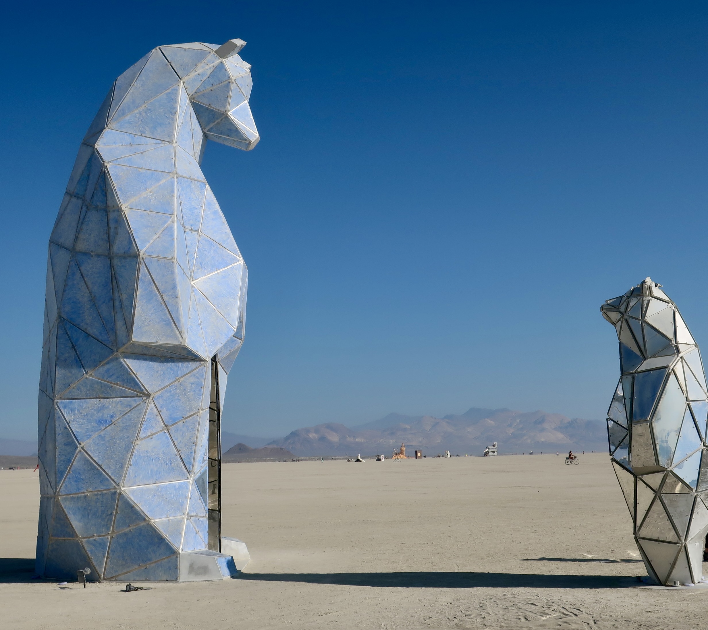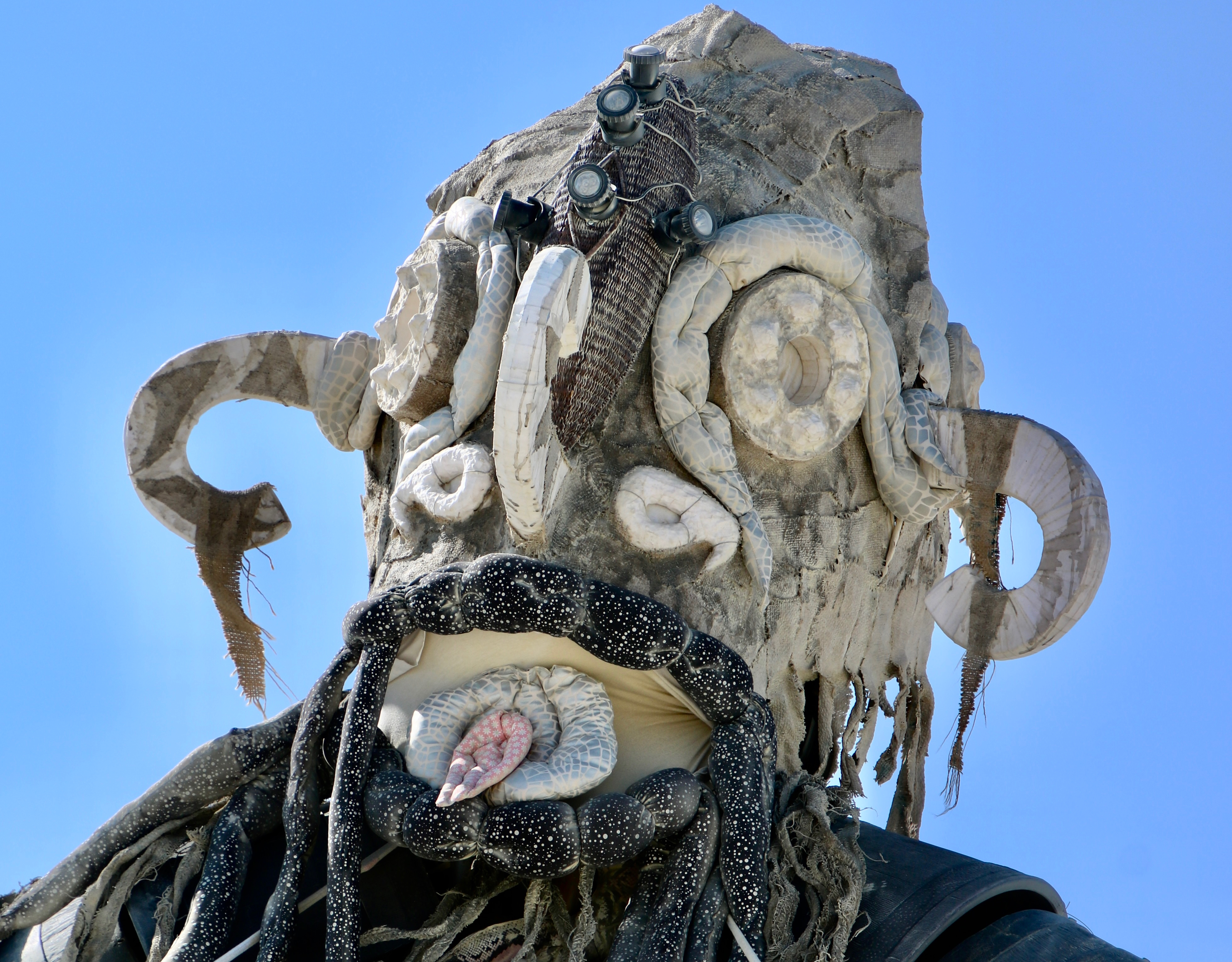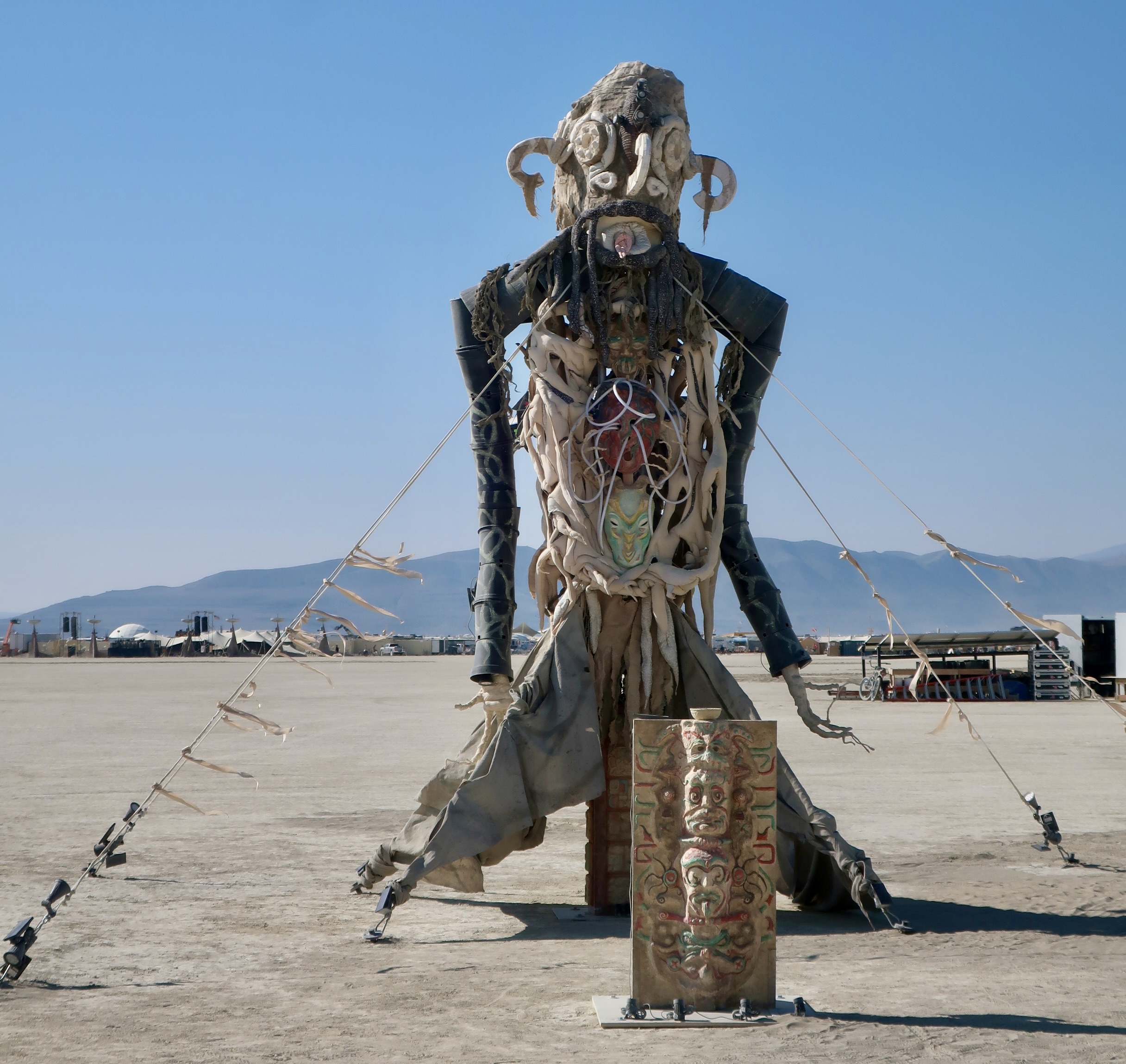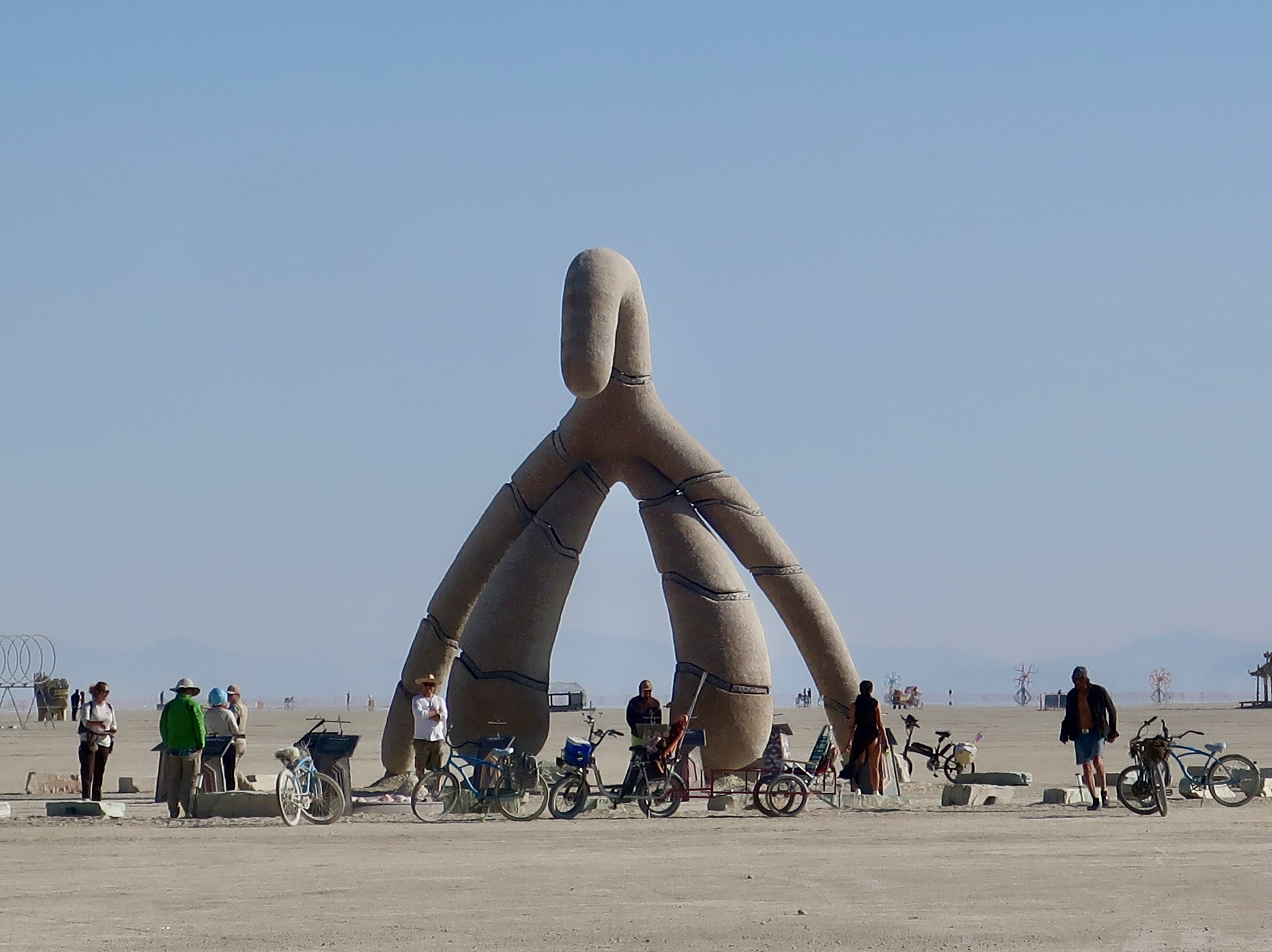 This handsome fellow is Chacc, the Mayan Rain God. Nice tongue. Peggy and I met him before when we were on our honeymoon in Mexico back in the early 90s. We spent the night in a motel next to the ancient Mayan ruins of Chichén Itzá and went out to visit him and other gods after all the tourists had left. They were carved in stone. According to legend, Chacc lived in a cenote next to the ruins. (Cenotes are natural wells created by the collapse of overlying limestone.) In times of drought, human sacrifices would be tossed into the well to appease whatever was irritating him and bring rain. Here’s Chacc standing tall at Burning Man 2023. Miguel Guzman from Mexico City and lyvone Khoo from Singapore created the sculpture. Since there weren’t any cenotes around in the Black Rock Desert to throw human sacrifices into, we figured that the bowl on the stand in front was a substitute.The ever curious (and mischievous) Bone decided to see if Chacc would accept him as a sacrifice. Apparently, the answer was yes. Chacc grabbed Bone up quickly in his long, bony fingers. You know the rest of the story. It rained in the desert for three days and stuck 70,000 Burners in the mud— becoming world-wide news. The moral of this story is watch what you ask for. Bone has been very quiet about his role. Somewhere, maybe down in his cenote, Chacc is laughing. (Note: For those of you who aren’t familiar with Bone, I’m posting an updated interview done with him in the past in conjunction with today’s post.)While we are on focusing on the gods of Ancient Mexico, I should also include this version of the Aztec god, Quetzalcóatl, the Feathered Serpent, by the Crescent Art Collective/Lisa Regan & Ley Brashka from Coahuila, Mexico & Tulsa, OK. Among his several roles, he was patron god of the Aztec Priesthood.Here’s another great beast. An RV with legs perhaps? I’m thinking it would make a great off-road vehicle. Getting in and out might be a little challenging.The artist, Walker Babington from New Orleans, had more than a house on legs with his creation, however. From the front, his sculpture became a buffalo with the house serving as his torso. Both the house and the buffalo were made of materials repurposed from structures and trees that had been destroyed by hurricanes in New Orleans. Babington titled his work “Burden of the Beast” and says his work “symbolizes the task of relocating one’s intrinsic understanding of ‘home.'” The forces of nature magnified by global warming will require more and more of us to pick up the pieces of our homes and lives and move on to higher and safer ground. Migration may become a way of life.Meet Axototl Frequency, a 2023 Burning Man artwork created by Gio Mantis & Elana Novali from Mexico City.Axolotl is modeled after an endangered salamander that can be only be found in one place, Lake Xochimilco near Mexico City. We think it’s cute. According to Mantis and Novali, “These art pieces aim to express the importance of protecting this endangered animal…” One thing that helps assure their continued existence is they are quite popular as pets. I want one.One of my all time favorite group of artists at Burning Man is the Flaming Lotus Girls out of San Francisco who are known for their imaginative creatures that light up the night skies of Burning Man in strange and wonderful ways. This was one of several sculptures we found together on the Playa. We wondered if they were plants, animals or machines. The Flaming Lotus Girls claimed that they were a bit of all three, evolving. Unfortunately, due to the rain, we never got to see them flaming at night.Leaves or wings? A flower head or an animal head?Not a creature I would like to meet at night shooting out flames. (Actually, I would have.)A photo I took of a dragon created by the Flaming Lotus Girls at Burning Man 2015.Zea Narvaez from Portland, Oregon urged viewers to face and love their beasts in a series of sculptures arranged in a circle with each one different and with a mirror. Peggy caught this photo of me next to my favorite. “Damn,” I told Peggy when we were reviewing our photos after Burning Man, “the beast marked me.” I swear, it was the first and only time I noticed the claw marks on my chest! Reflected Playa dust on the mirror? Maybe.Mainly we took selfies, as Peggy is here. If that isn’t a form of “Loving Thy Beast,” what is? Speaking of possible beasts, do you see that sculpture in the distance on the right in the far distance? We hopped on our bikes to check it out.“Well, I have an idea what it might be,” I told Peggy.“You are looking at it wrong,” Peggy told me. Oh. “Tip of the Iceberg” is what Melissa “Syn” Barron from Oakland & Big Sur, CA calls her sculpture. The comment was “Monumentalizing this misunderstood & mysterious piece of anatomy, we hope our sculpture will educate, empower, & honor its rightful place in biology.” Right. You are looking at an ‘invisible Trojan Unicorn’ according to artists, Invisible Pink Unicorns from Los Angeles. It’s certainly pink and a unicorn. Here’s what the artists had to say, “Given the challenge of getting the tickets, we invited the easiest and cheapest way to get to Burning Man – inside the Trojan unicorn. Please come and check if it is open and if we successfully get out to the Playa and are not trapped inside (and help us get out if we are still in)!” My money would have been on Burning Man Org blocking free entry into the event. They are a lot tougher than the Trojans were! Grin. They even checked the bathroom in our trailer to make sure we weren’t trying to slip someone in! Little did they know about the trap door on our black water tank. Heh, heh. Just kidding. I’ll conclude with this fun winged beast I couldn’t find any information on. Next up, I’ll feature a Hedge Hog from Ukraine made from tank traps and other fun animals including a giant bear and a bunny.