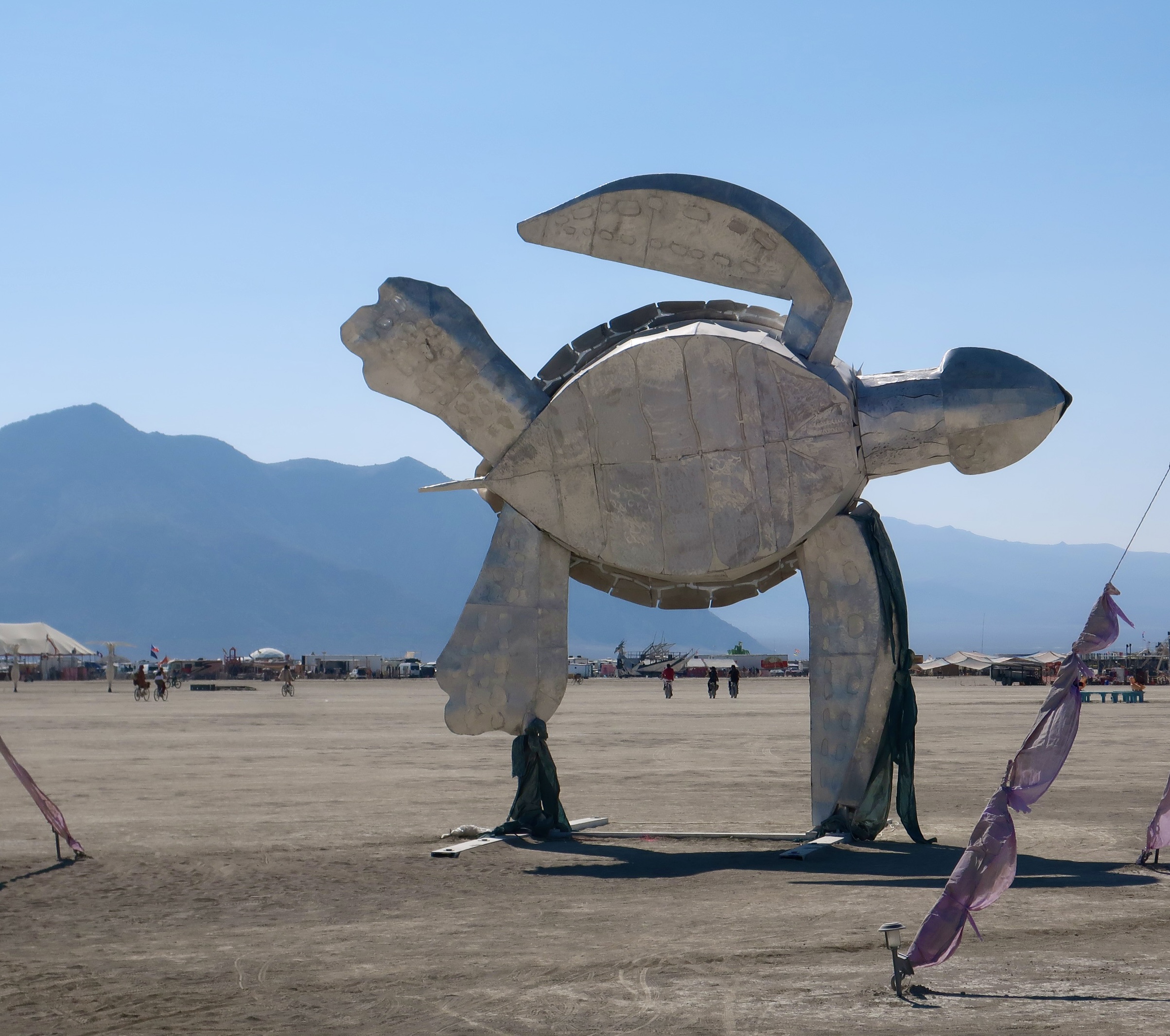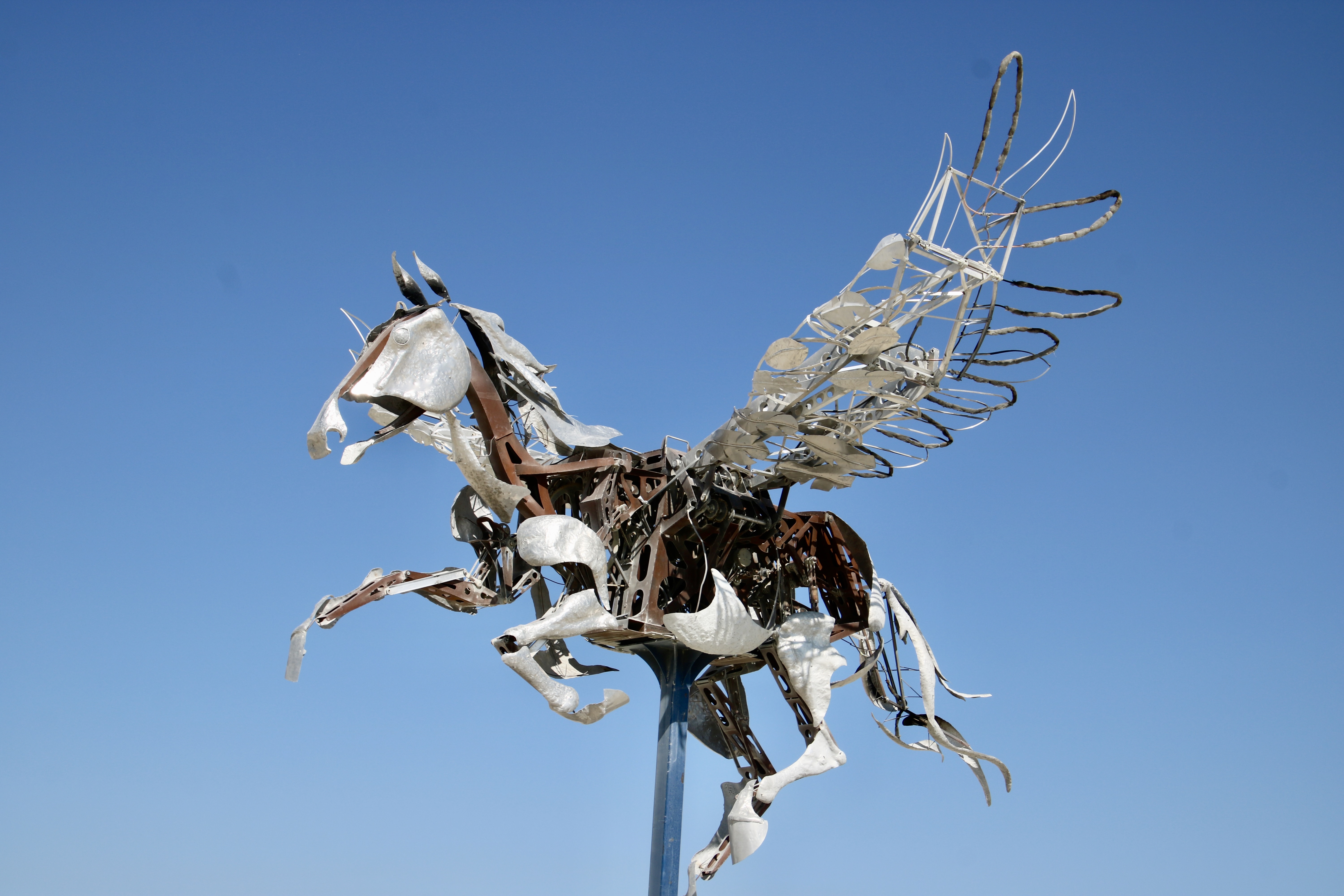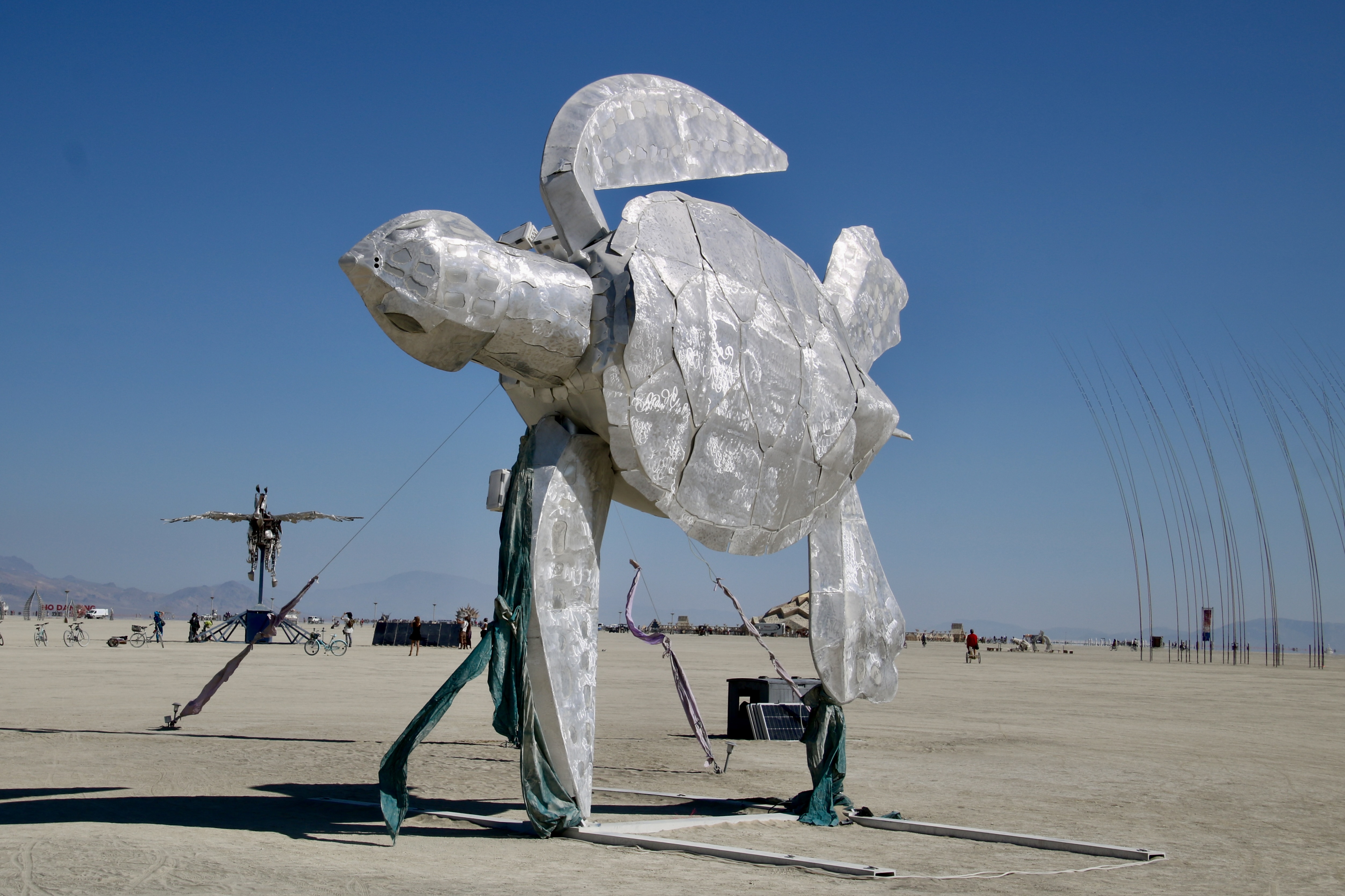 “Touch the Sky” was created by Martin Taylor and Chromaforms out of Oakland, CA. He describes it as “a sculpture of a mythical winged creature with the head of a human preparing to take flight.” He also notes, it “serves as a visual metaphor for taking leaps of faith to achieve our dreams and fly.” This photo provides a comparison between “Touch the Sky” in the day with the sculpture at night.A close up of “Touch the Sky.” Taylor noted that the sculpture “is outlined by geometric tattoo-like perforations that accentuate the shape of the body and emit light at night.”I’m featuring metallic art from Burning Man 2023 in this post. Meet Anya of “Anya and the Void Bunnies.” The artist is Steffin Griswold from Minneapolis, MN. Griswold’s description is “Visiting dignitaries from beyond space and time receive a gift from the heart of fire.” Anya is a fire goddess. While we didn’t get a photo of her at night, flames emerge from her hands.Here are the void bunnies from outer space, waiting patiently for their gift of fire. Sorry guys, you will have to wait until dark.A close up of a void bunny with his bunny ears and bunny tail.A frontal shot of Anya. The dark spots on her hands and heart are what emit the flames. You can see the tubes leading from her heart that connect to a propane tank.And finally, Anya and the void bunnies together. She’s got a pretty good tail and ears of her own! The Temple of Babel, which I will feature later, can be seen in the background.This handsome turtle sculpture by Mark Dill from Fleming Island, FL is titled “Journey of the Aquatic.”Here’s the underside. Mark says the sculpture is “5 times life size of a loggerhead turtle. It is meant to express the joy and wonder of seeing turtles in the ocean. As well as the fragility of the turtles’ lives and the dangers to their existence. I was snorkeling once on the island of Hawaii and came on a sea turtle that I started to follow. My ‘joy and wonder’ were so strong that I ran head on into a fishing boat!”You may have noticed the flying horse, or Pegasus, behind the first turtle picture. Titled “Wings of Glory,” this is his second trip to Burning Man. He is a magnificent creature that runs and flies slowly on his pedestal above the Playa. The artist, Adrian Landon, hails from Reno, Nevada, so Pegasus had a short flight to get back to the Black Rock Desert. Peggy and I watched him strut his stuff, a truly magical creature, a myth come to life.Wings down, Pegasus continues to fly.My first thought was of strange but attractive looking nuts piled on top of each other when I first saw this sculpture by the L’Attitude Collective from Petaluma, CA. Imagine my surprise when I learned it was a Complexahedron. A ‘what’ you say. Here’s how the artists described it: A shrine to commemorate the moment when unicellular eukaryotes began to aggregate and become one. Now you know, right. Grin. Petaluma, BTW, is home to a number of Burning Man’s top artists creating impressive works year after year.Bicycling around it, I discovered it had a face. And the sculpture in front holding what I assume is a smaller Complexahedron. I took a closeup.A muscular woman is holding the Complexahedron up in the air, like Atlas, or possibly giving birth to it out of her head/brain, creating early life.Wizard, and I’ll assume that is his Burning Man name (I’m Outlaw), hails from Oakland, California. He describes it as looking like “a 12 foot silver donut.” This was our day for dust storms on the Playa.Stainless steel, curved tubes wrap around each other and form the body of the donut.Here is OHM at night. While I couldn’t find the name of the artist who created this piece, I’ve always liked mobile art ever since I was introduced to the work of Alexander Calder. I’ll wrap up this post here. Next art post: The Fantastic Beasts of Burning Man 2023.