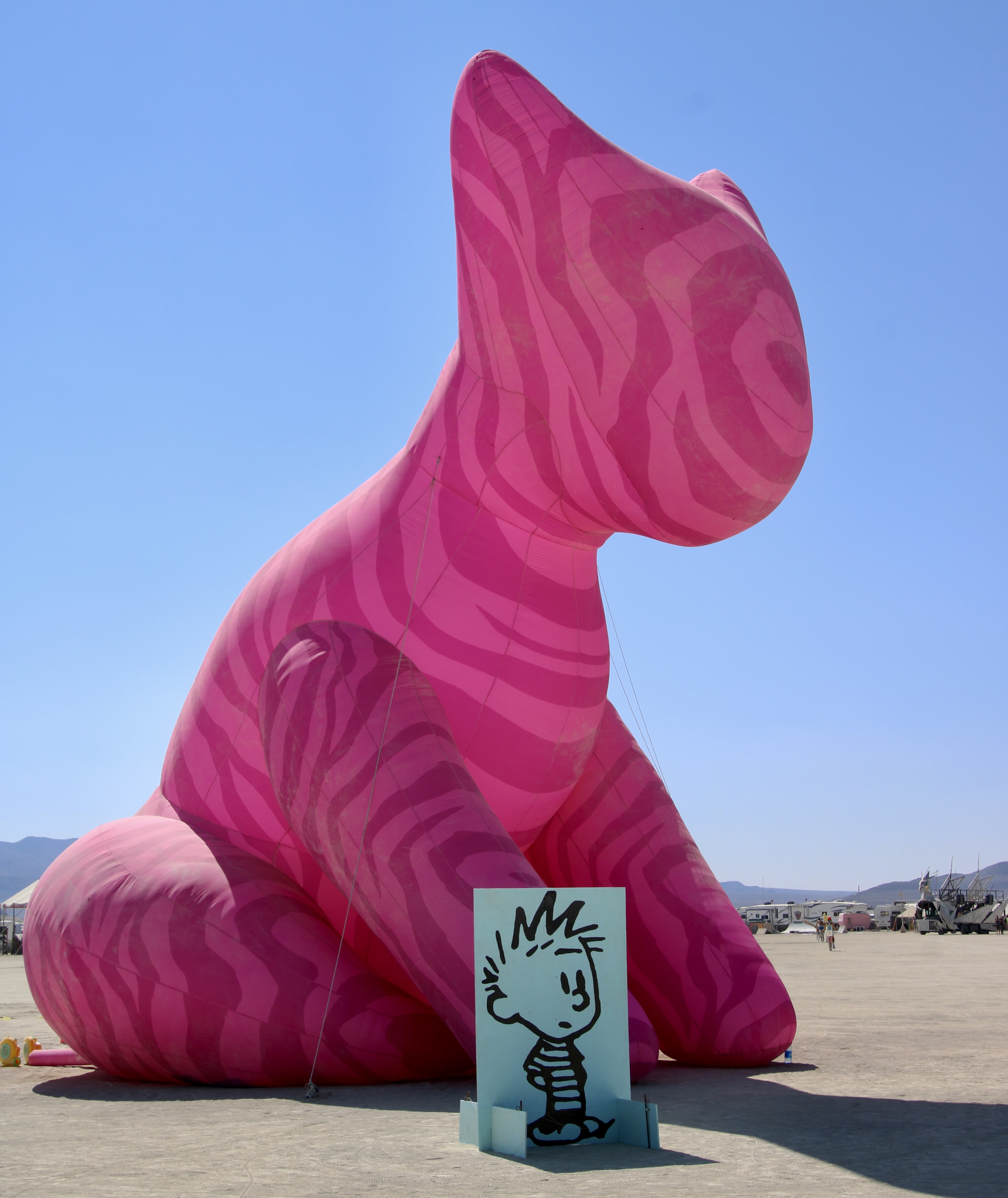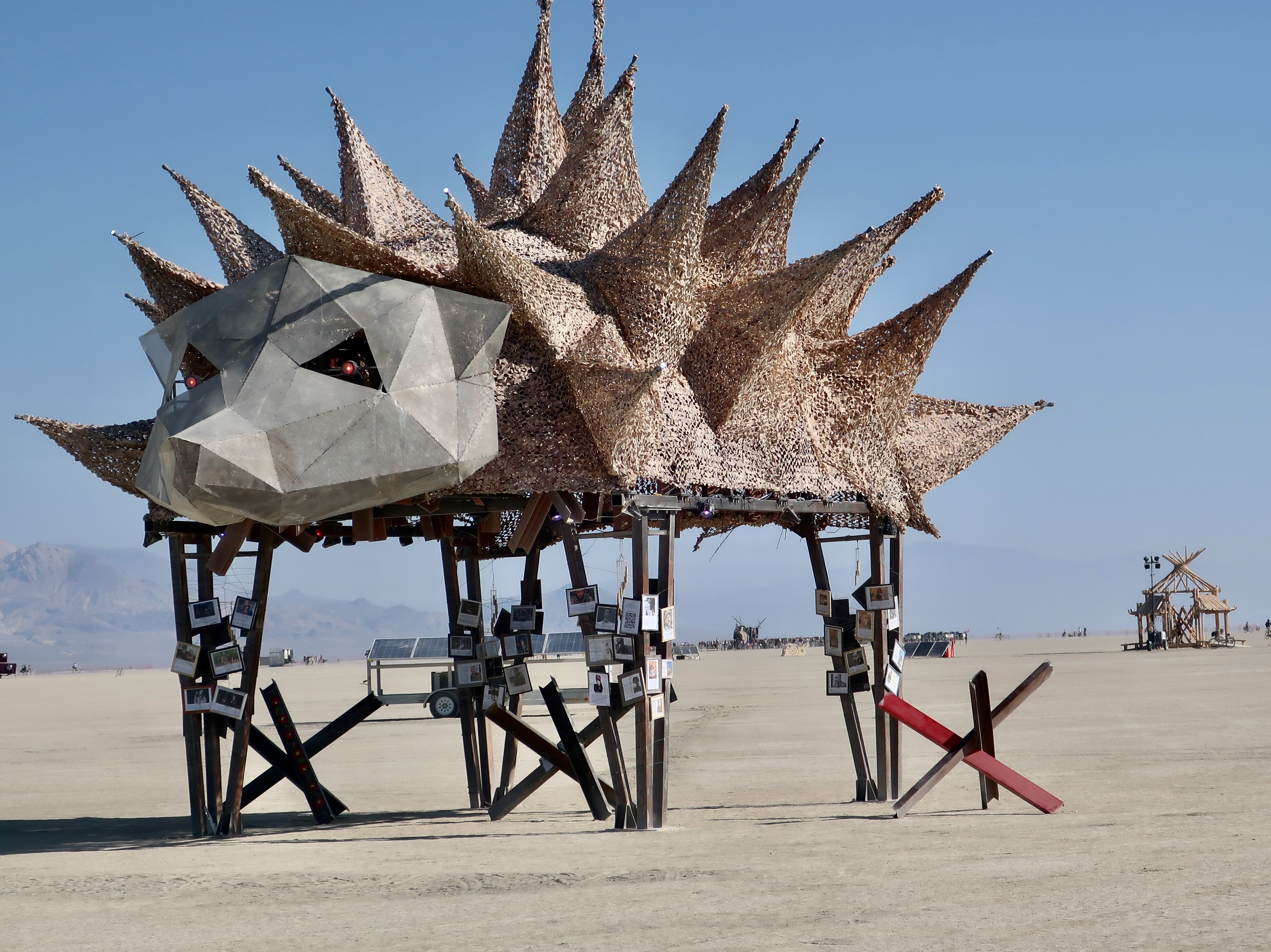 A huge, inflatable tiger was one of the prominent works of art on the Playa at Burning Man 2023 . Its size and pink color guaranteed it stood out. Bicyclists provide perspective on its size. A tails-eye take on the towering tiger! The artist, Misha Libertee from Armenia, named her sculpture Vagr, which is Armenian for tiger. She stated that the “Bright pink color of the installation serves as a reminder of the struggles that these animals face due to habitat loss, poaching, and climate change.” We wondered if the sign on the right would provide more information.I’m pretty sure that another Burning Man artist decided to add Calvin to the equation. While it may not have been what Libertee had in mind, it certainly resonated with me. Calvin and Hobbes was one of my all-time favorite cartoons. Created by Bill Watterson in 1985, it was discontinued ten years later. The cartoon has been missed by millions ever since, including me! Maybe there is a message here about endangered tigers… Another interesting animal that caught our attention immediately was a large hedgehog. It came with a story…Created by Ukrainian artists Yaroslav Korets and Kurenivka from Kyiv, the sculpture memorializes artists who died defending Ukraine against the Russian invasion. At the base of the sculpture are tank traps that Ukrainians created to slow the progress of Russian tanks through their cities. The tank traps are known as hedgehogs. Hundreds were made by the Ukrainian Railway utilizing new rails. Two Polar Bears stood out as stars on the Playa, literally. They were named Ursa Major and Ursa Minor after the constellations. The little fellow had been to Burning Man before. Little is relative. She stands 13 feet tall. Her big sister, Ursa Major, is over three stories. The artist, Jen Lewin from Brooklyn, said that Ursa Minor’s infinity mirrors were a reminder to “Look up.”The 30 foot tall Ursa Major had an opening that also featured mirrors. Lewin noted that “Ursa Major’s hollow body is filled