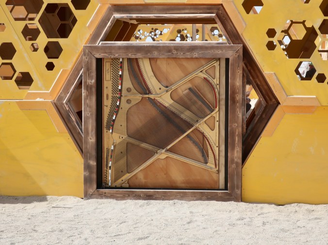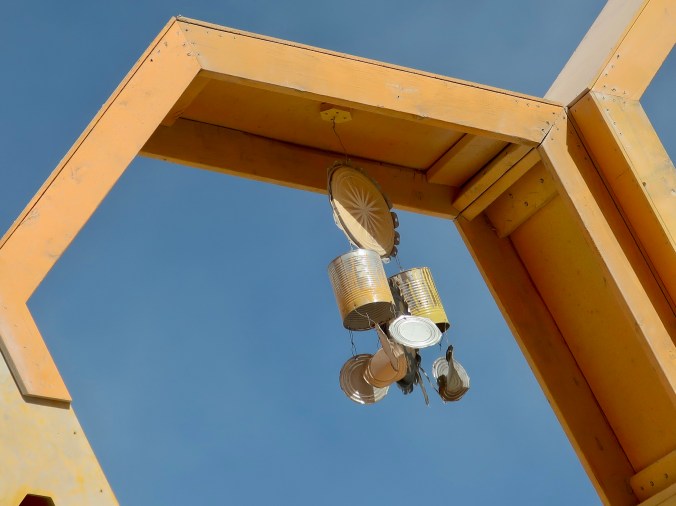 The Man was surrounded by a beehive-like structure that was in line with the Animalia theme. This photo also places the Man in his dramatic backdrop of the Black Rock Desert.A close up of the beehive with the Man in the background. Note the object dangling from the beehive.It served as Burning Man’s concept of a wind chime. Grin.The ground level of the beehive included xylophones that people could play!
