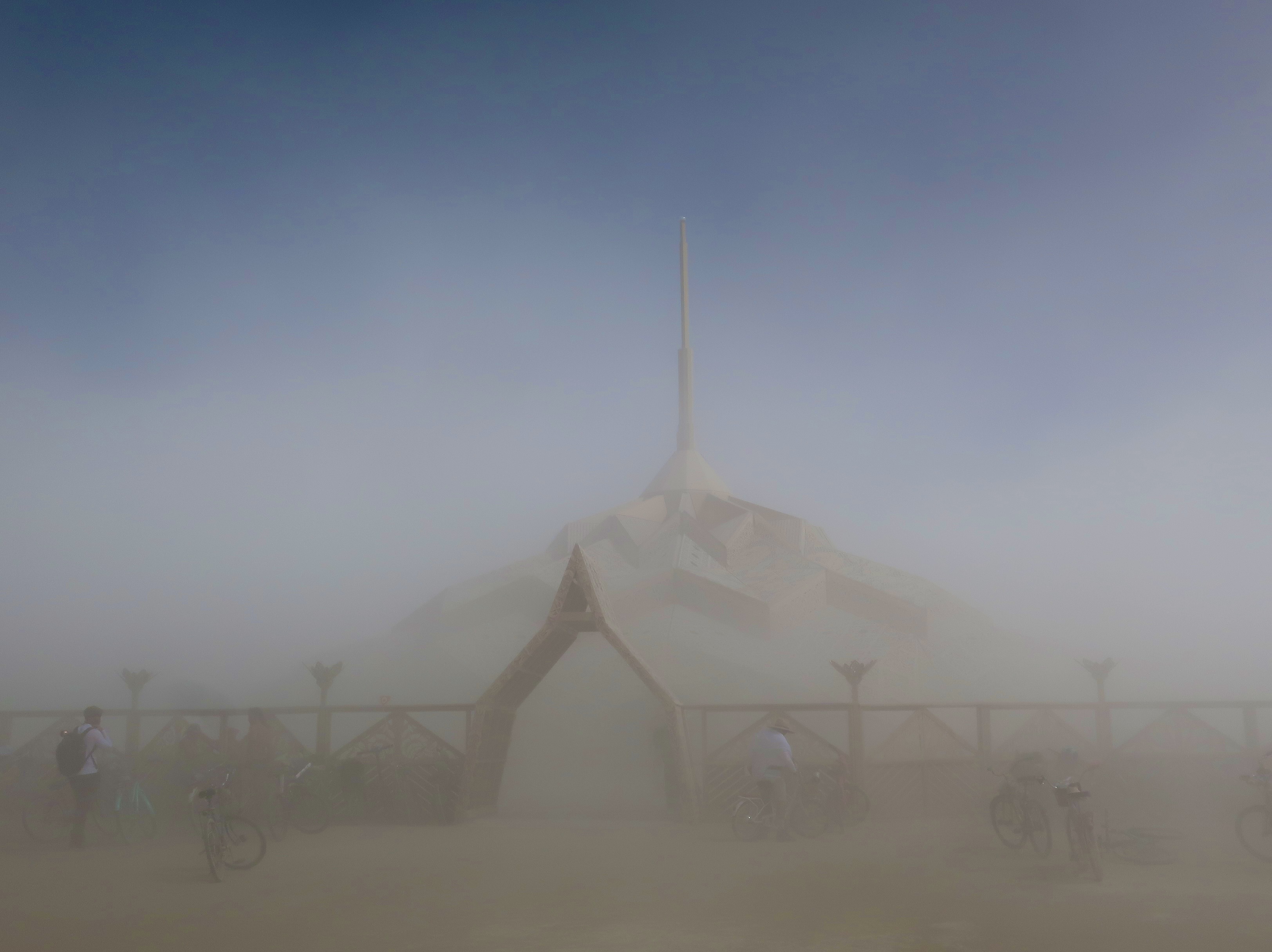 By this dust storm. No kidding, this is what a Burning Man dust storm looks like. The wisest thing to do is just hunker down and wait for it to blow over. Not doing so will get you lost. Peggy and I once spent over two hours along with at least a thousand other Burners trying to find our way home when we had been to an event way out by the fence on the outer edge of the Playa. When we could finally see the the Man, we discovered that we had walked in a huge circle. Thankfully, Burning Man keeps a fence around the area. Otherwise, we might still be wandering. Or worse.The Temple finally began to emerge from the dust storm.The Temple is a special, sacred site for Burning Man participants. Thousands leave messages to loved ones, friends, and even pets who have passed on. Several are shown on the front here. When the Temple burns at the end of the event, the messages are released to the sky, giving a degree of closure to those who left the messages. Year after year the Burning Man organization and volunteers design and build beautiful temples, each one unique.