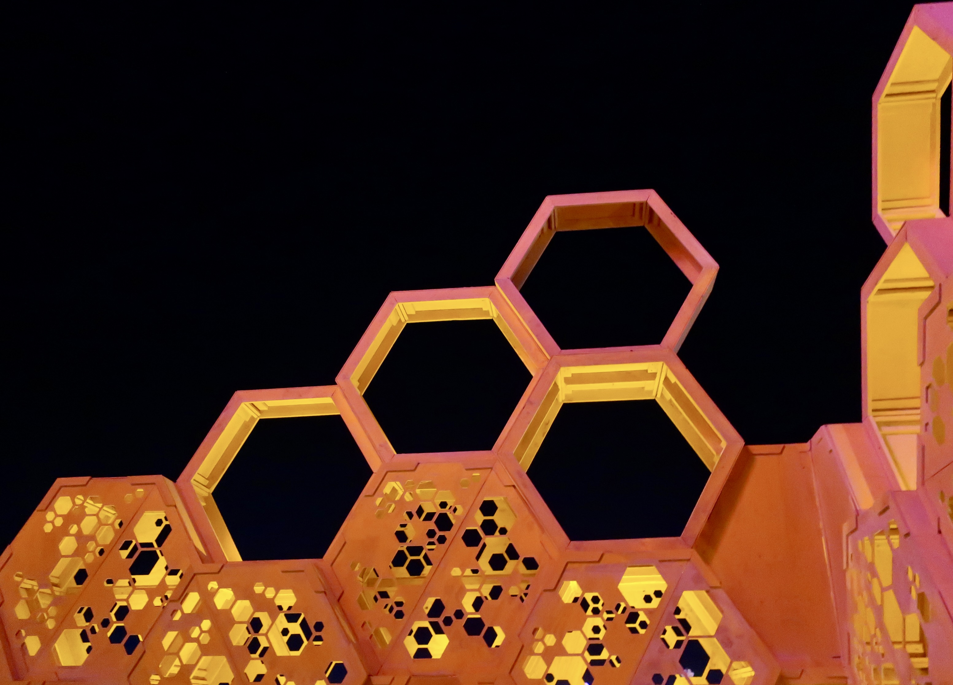 The Man can be seen from anywhere on the Playa or Black Rock City. It is lit up at night and even more special than it is during the day.The beehive begins to come into focus as we neared the Man. The bright square is the Xylophone.A close up of the beehive that I thought was pretty cool.These lit steps provided a pathway into the structure under the Man. They turned red when someone stepped on them.A final view of the 2023 Man for this post. Our next blog will begin featuring the great art from this year. You won’t want to miss it.