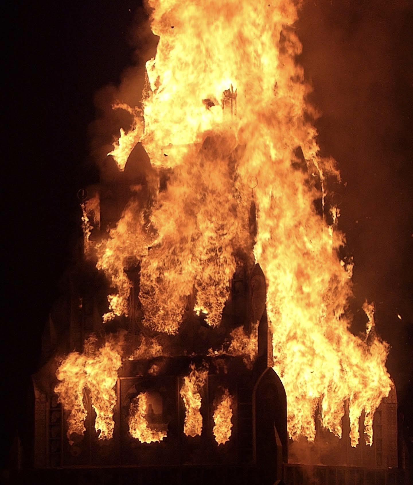 The 2012 Ego SculptureA close up of the Ego Sculpture. Check out the characters.The Photo Chapel at Burning Man 2014.The Totem of Confession in 2015. The photo of Leary, a confessional, and a tower of skulls were inside. A peephole in the Totem of Confession.Leary’s ashes burn again for a second time as the Temple of Confession burns. They also shoot up into the sky for a second time. In 1997, a portion of Leary’s ashes were shot into space on a rocket along with those of Gene Roddenberry, the creator of Star Trek, and 22 other people. It might be said, that Leary was higher than he ever had been from LSD.